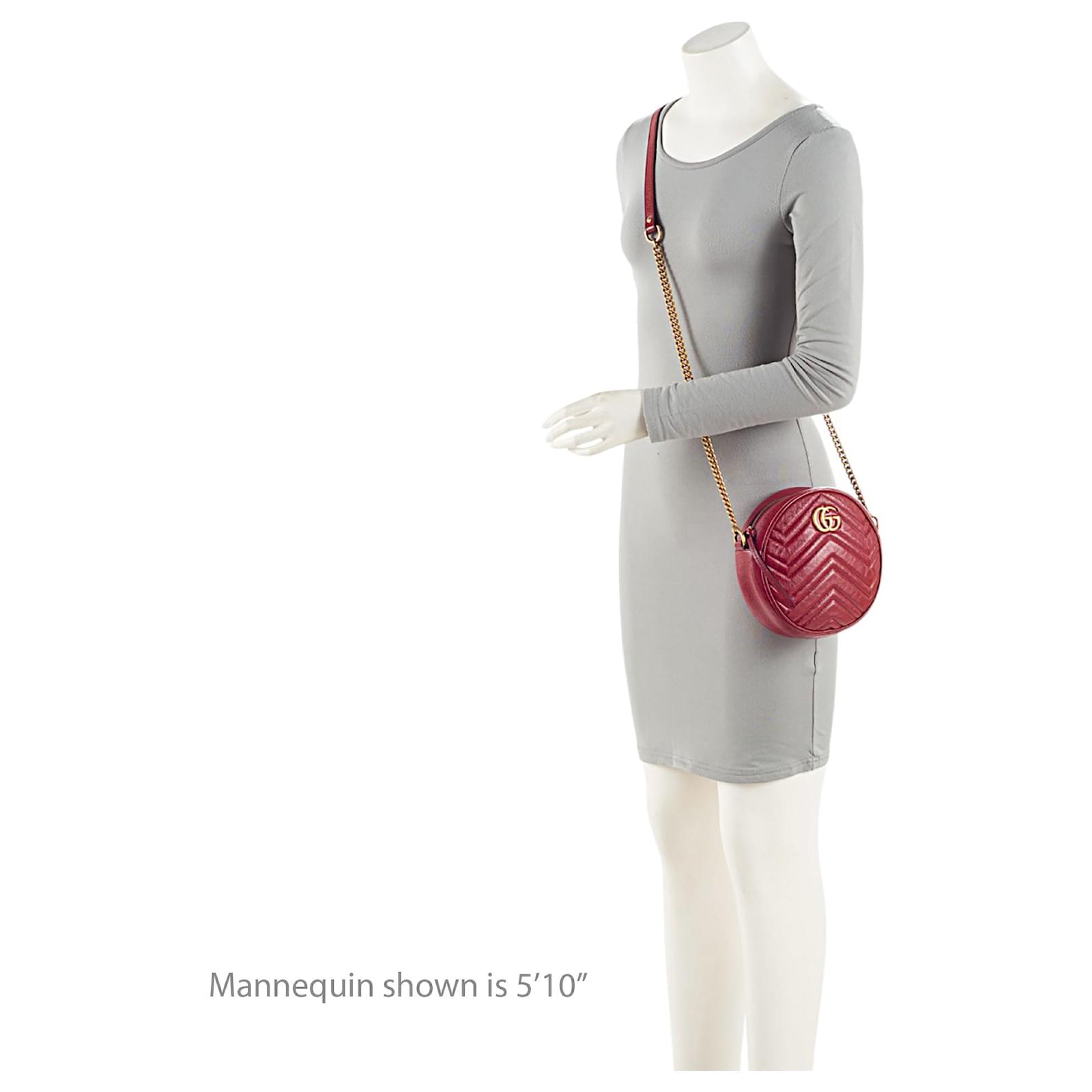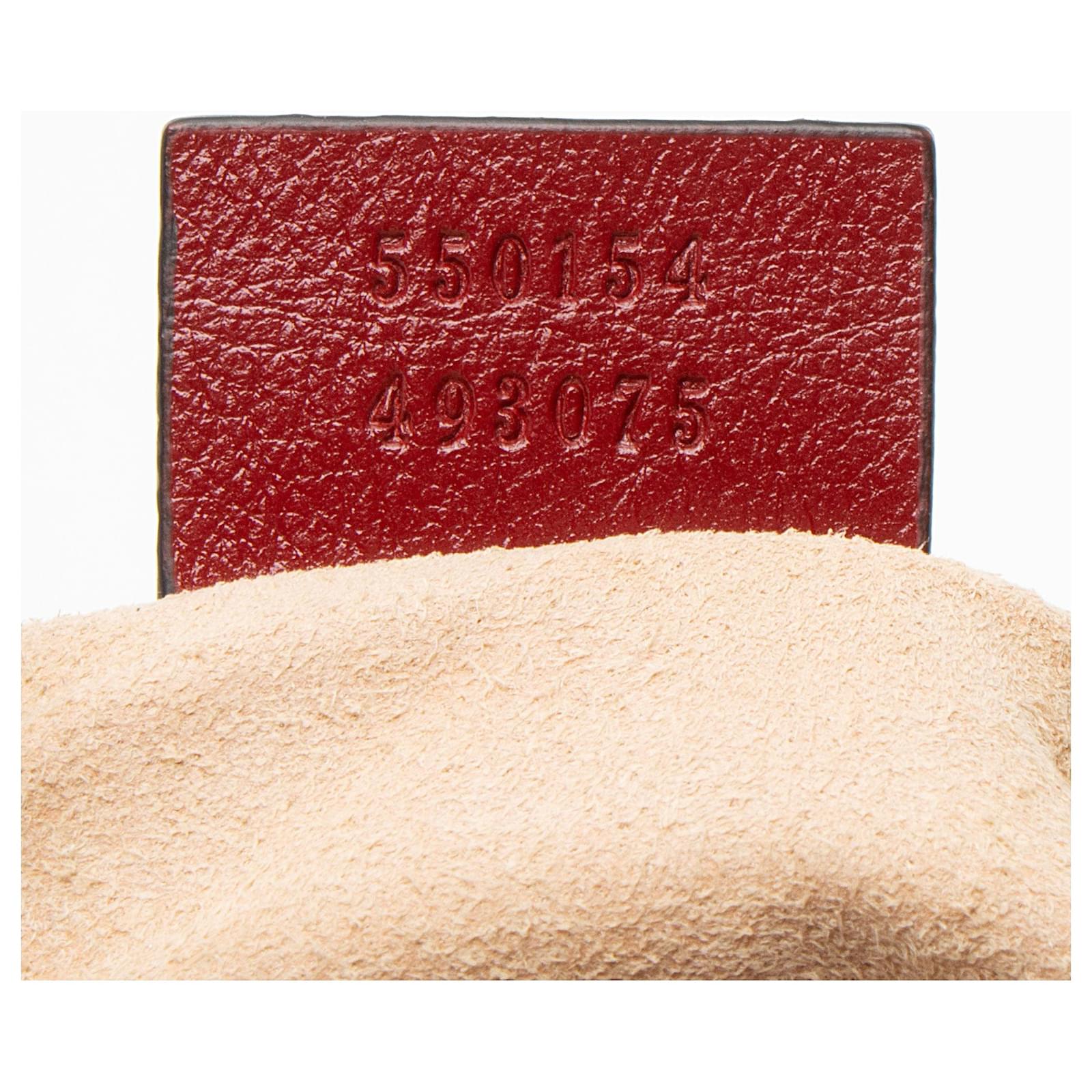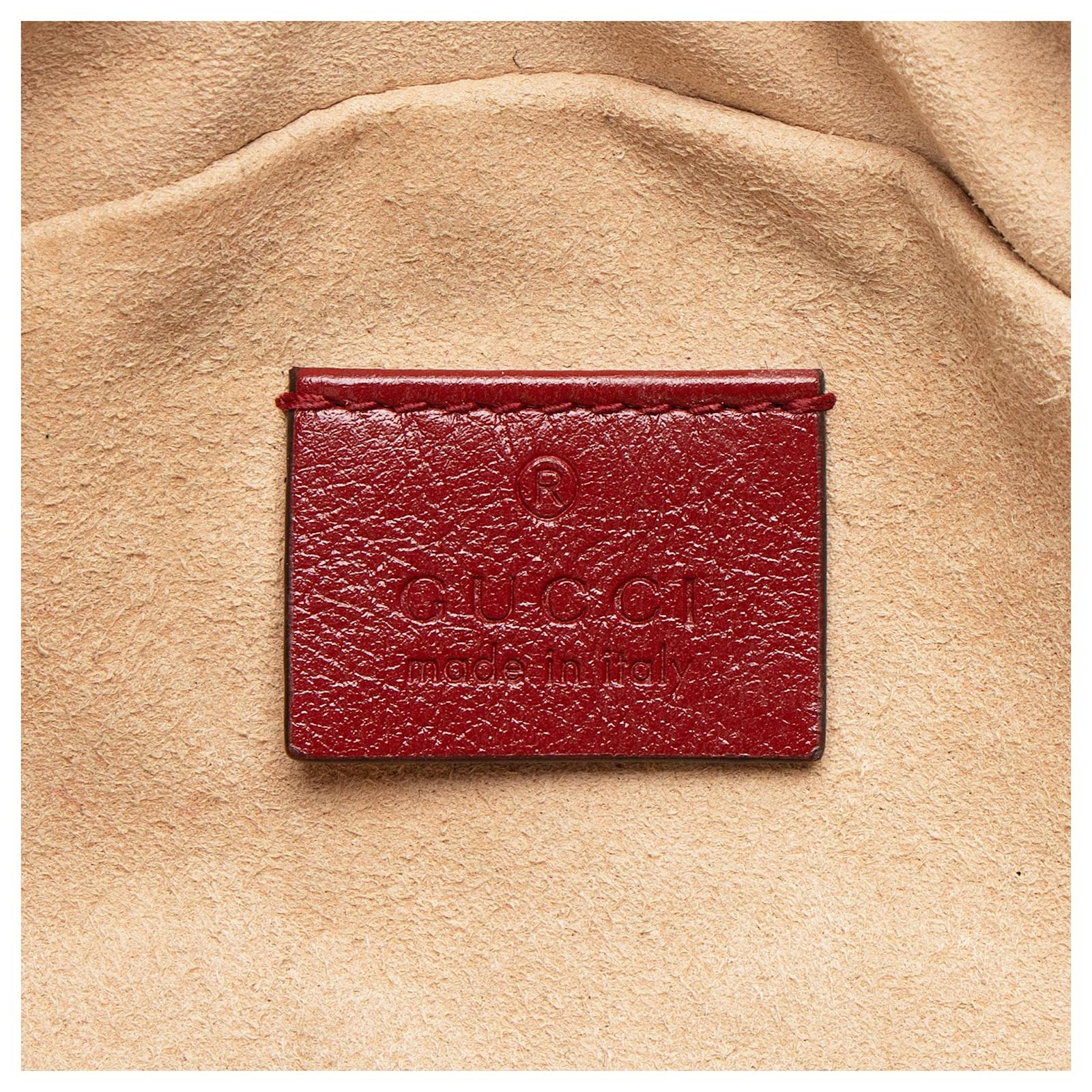 The Italian fashion house of Gucci continues to reinterpret its rich heritage under current Creative Director Alessandro Michele (2015). Maintaining a balance between historical reference and contemporary eclectic flare, the brand’s signature “double g” remains iconic. Gucci has been recognized as a worldwide leader in the luxury goods market for 90 years.Condition Notes: Light creasing throughout exterior causing minor loss of structure. Surface scratches to hardware. Marks and darkening throughout interior.Width (at base): 7\”Height: 7\”Depth: 2\”Shoulder Strap Drop: 22\”Type of Material: LeatherColor: RedLining: Beige MicrofiberPockets: NoneHardware: Antique Gold ToneClosure: ZipperOrigin: Italy Measurments: width: 177 mm height: 177 mm handle drop: 558.8 mm \n Product Id: 525179 \n