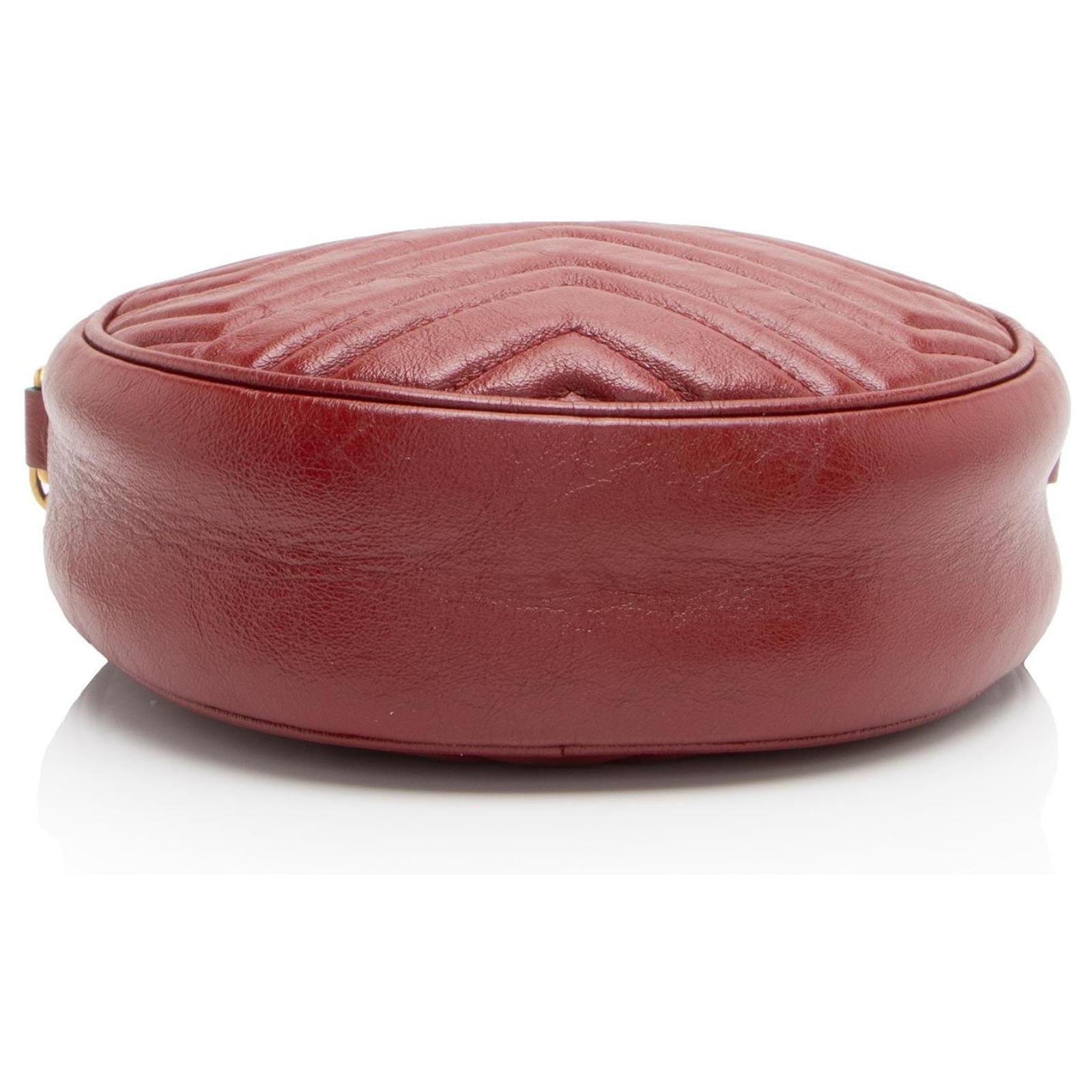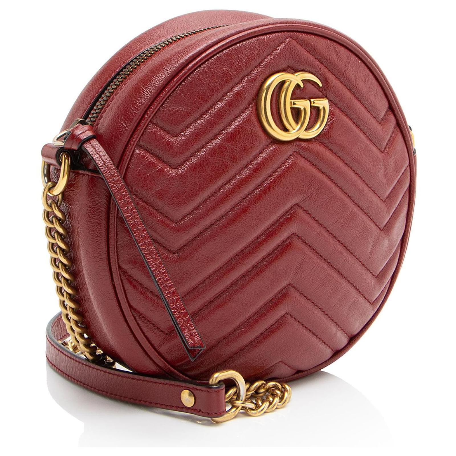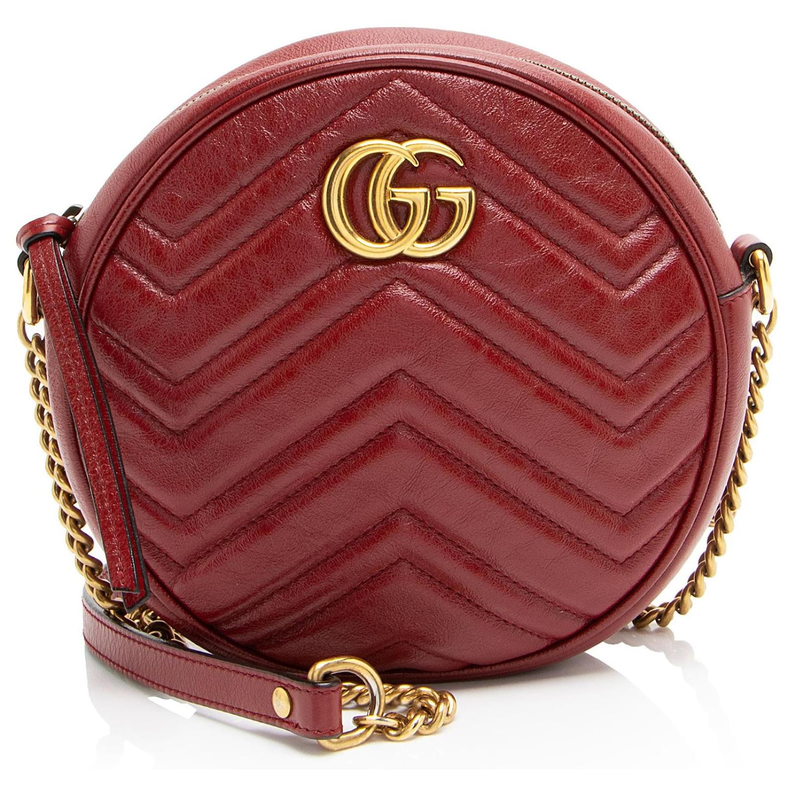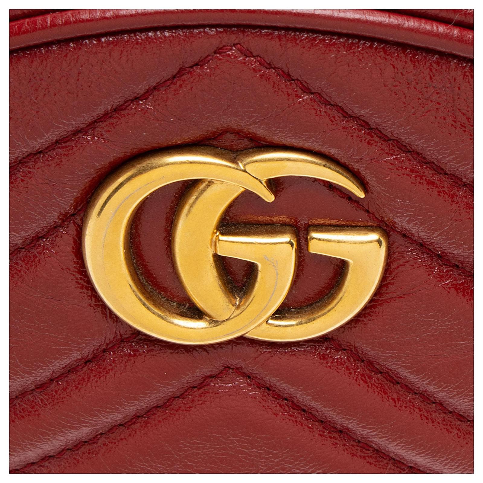 The Italian fashion house of Gucci continues to reinterpret its rich heritage under current Creative Director Alessandro Michele (2015). Maintaining a balance between historical reference and contemporary eclectic flare, the brand’s signature “double g” remains iconic. Gucci has been recognized as a worldwide leader in the luxury goods market for 90 years.Condition Notes: Light creasing throughout exterior causing minor loss of structure. Surface scratches to hardware. Marks and darkening throughout interior.Width (at base): 7\”Height: 7\”Depth: 2\”Shoulder Strap Drop: 22\”Type of Material: LeatherColor: RedLining: Beige MicrofiberPockets: NoneHardware: Antique Gold ToneClosure: ZipperOrigin: Italy Measurments: width: 177 mm height: 177 mm handle drop: 558.8 mm \n Product Id: 525179 \n