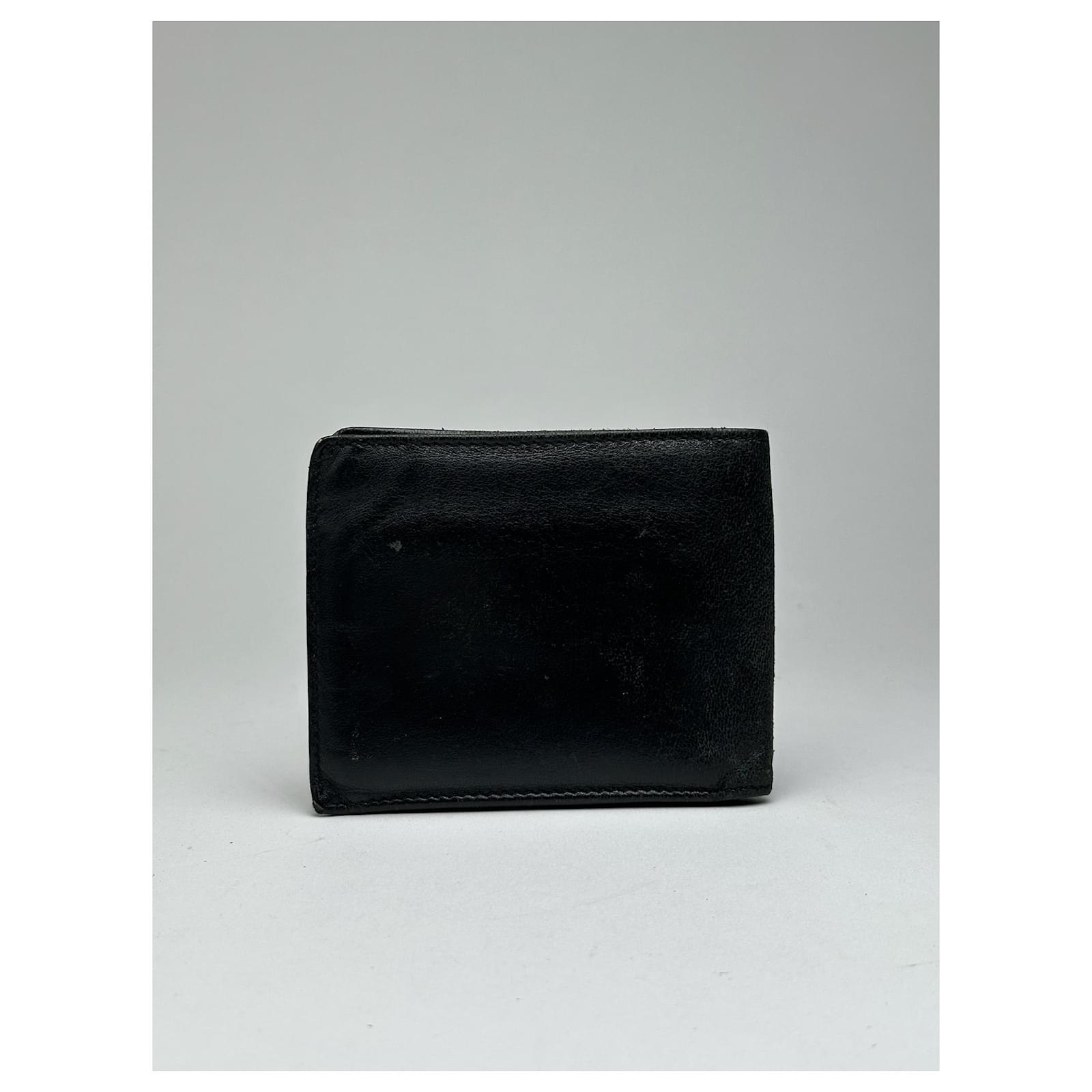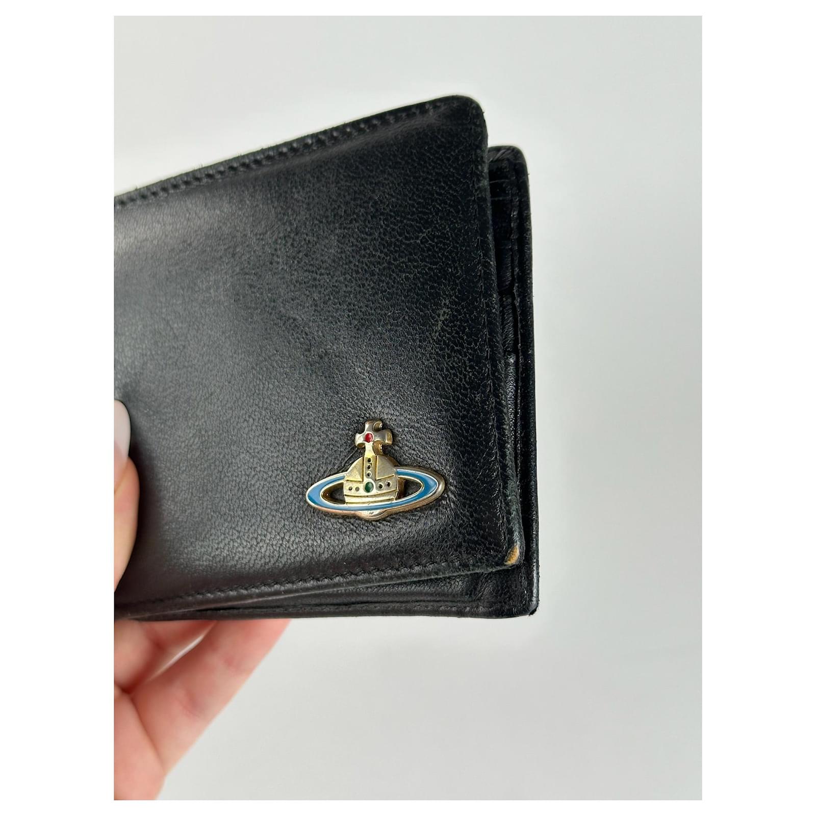 VIVIENNE WESTWOOD Vintage Black Leather Wallet. This unisex vintage wallet is\ncrafted from black leather and features the iconic Saturn Orb logo on the front\nin silver-tone steel, hand-painted in blue, red, and green. Made in Italy, this\ncompact accessory blends bold design with everyday practicality. Introduced in\nthe late 1980s, the Saturn Orb logo fuses royal British symbolism with a\nfuturistic twist, embodying Vivienne Westwood’s philosophy of rebellion,\nheritage, and innovation.\nBrand: VIVIENNE WESTWOOD\nModel: Vintage Wallet\nCondition: Very Good\nCondition Details: The wallet shows minor corner wear and light surface\nscratches, but remains in very good overall condition.\nMain Color: Black\nHardware Color: Silver (painted in blue, red, green)\nMaterial: Leather, Steel\nWidth: 11.5 cm\nHeight: 9.5 cm