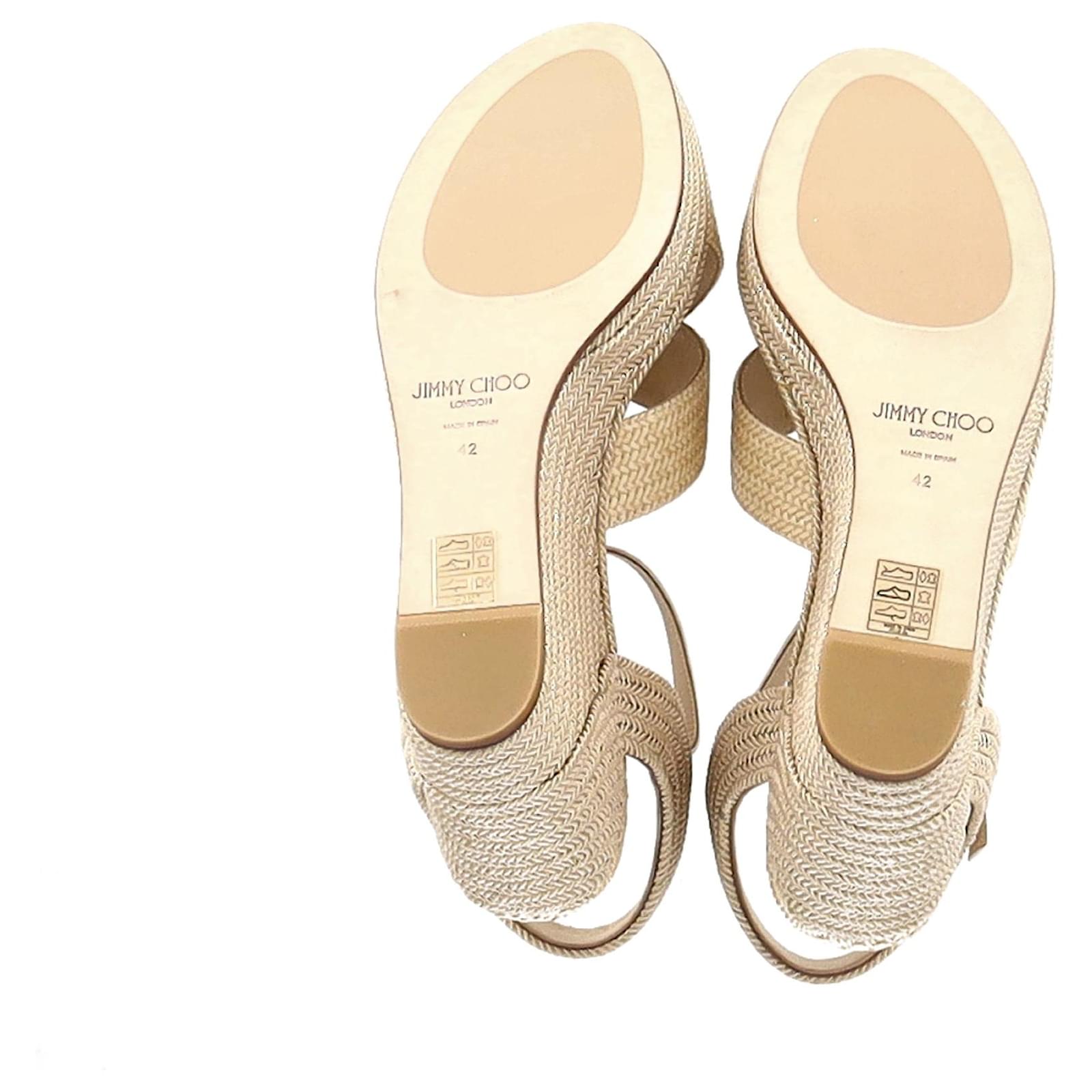 Embrace laid-back luxury with the Jimmy Choo Dellena Espadrille Wedge Sandals, crafted in beige raffia for a breezy, sun-ready feel. The high wedge heel and crisscross strap design add a touch of elegance to this summer staple. **Styling tip:** Pair them with a flowy maxi dress or linen separates for an effortlessly chic warm-weather look.\n\n Jimmy Choo Dellena Espadrille Wedge Sandals in Beige Raffia\n\nCondition: Excellent\nSigns of wear: Include Box., No visible sign of wear. No Mark at insole., Unused or used once, but as good as new. Very light mark at soles.\nPackaging: Box, Dust bag\nColor: Beige\nMaterial: Vegetable fibre | raffia\nSize: EU | 42\nMeasurements: Heel height: 100; Insole length: 270\nSKU: NAPPUGBSH496305W \n Product Id: 496305 \n