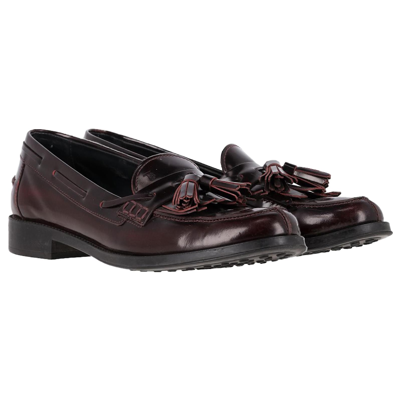 Refined and versatile, Tod’s Tassel Detail Loafers in rich burgundy leather offer a polished update to a classic silhouette. Crafted with meticulous Italian craftsmanship, they feature elegant tassels and a sleek finish that transitions seamlessly from work to weekend. Style them with tailored trousers or a midi skirt for a sophisticated, menswear-inspired look with a feminine twist.\n\nTod’s Tassel Detail Loafers in Burgundy Leather\n\nCondition: Very good\nSigns of wear: Minor markings, Lightly used but very well maintained. Minor mark at soles & creasing, light scuffing at the soles and heels.\nPackaging: Dust bag\nColor: Red | burgundy\nMaterial: Leather | leather\nSize: EU | 39.5\nMeasurements: Insole length: 290\nSKU: NAPPUGBSH493449W \n Product Id: 493449 \n