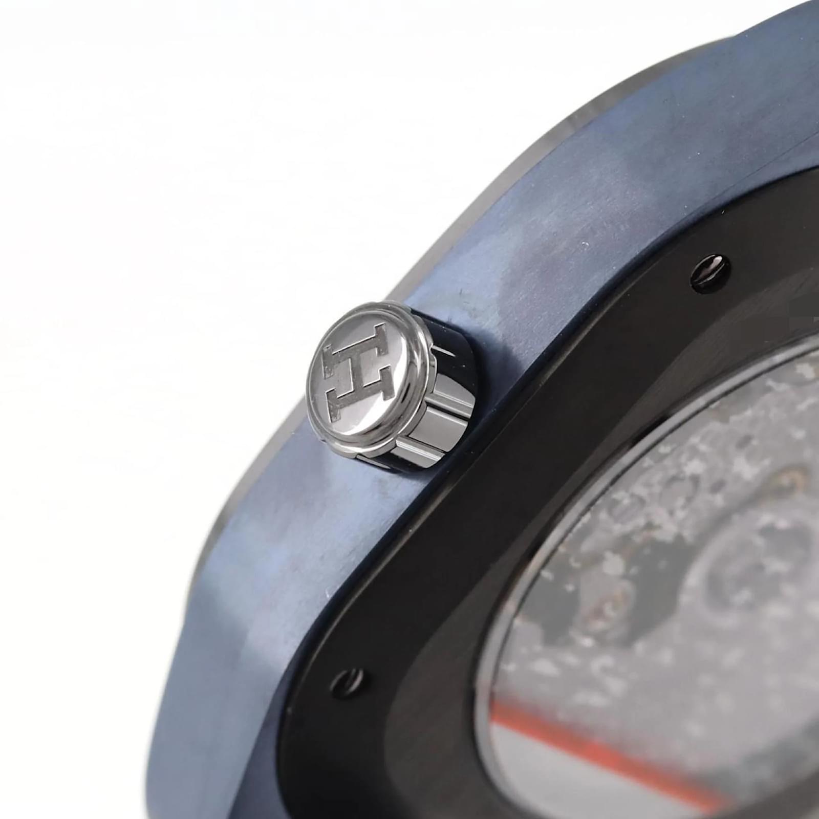 The Hermes H08 TI SP1.744 is a sophisticated wristwatch featuring a blue analog dial housed in a durable titanium case with a 39mm diameter. This timepiece is equipped with a self-winding automatic movement, ensuring reliable performance. The watch is complemented by a comfortable rubber band, also in blue. \n\nThis particular model is in used condition, classified as \”like new\” with a seller ranking of Rank S, indicating it is in mint condition. The purchase includes both the inner and outer boxes, along with a warranty. Potential buyers are encouraged to review the provided images for a clear understanding of the item’s condition and included accessories.