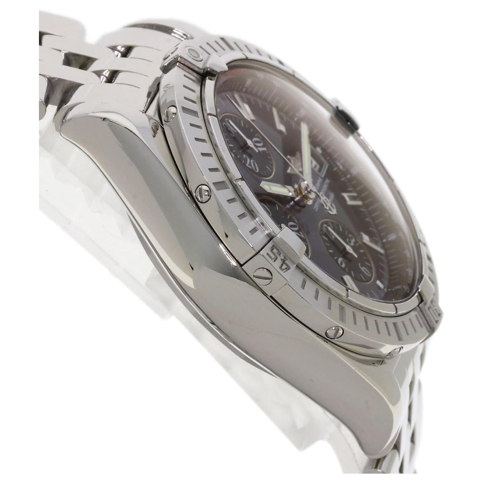The Breitling A13356 Chronomat Evolution is a men’s wristwatch crafted from stainless steel, featuring a gray dial and an analog display. This self-winding automatic timepiece has a case diameter of 53mm and is suitable for a wrist size of 18cm (7.08 inches). \n\nThis watch is in very good used condition, with slight scratches on the bezel, case, and bracelet, while the glass and dial show insignificant signs of wear. It comes with both inner and outer boxes. Potential buyers are encouraged to review the provided images for a detailed view of the watch’s condition and included accessories.