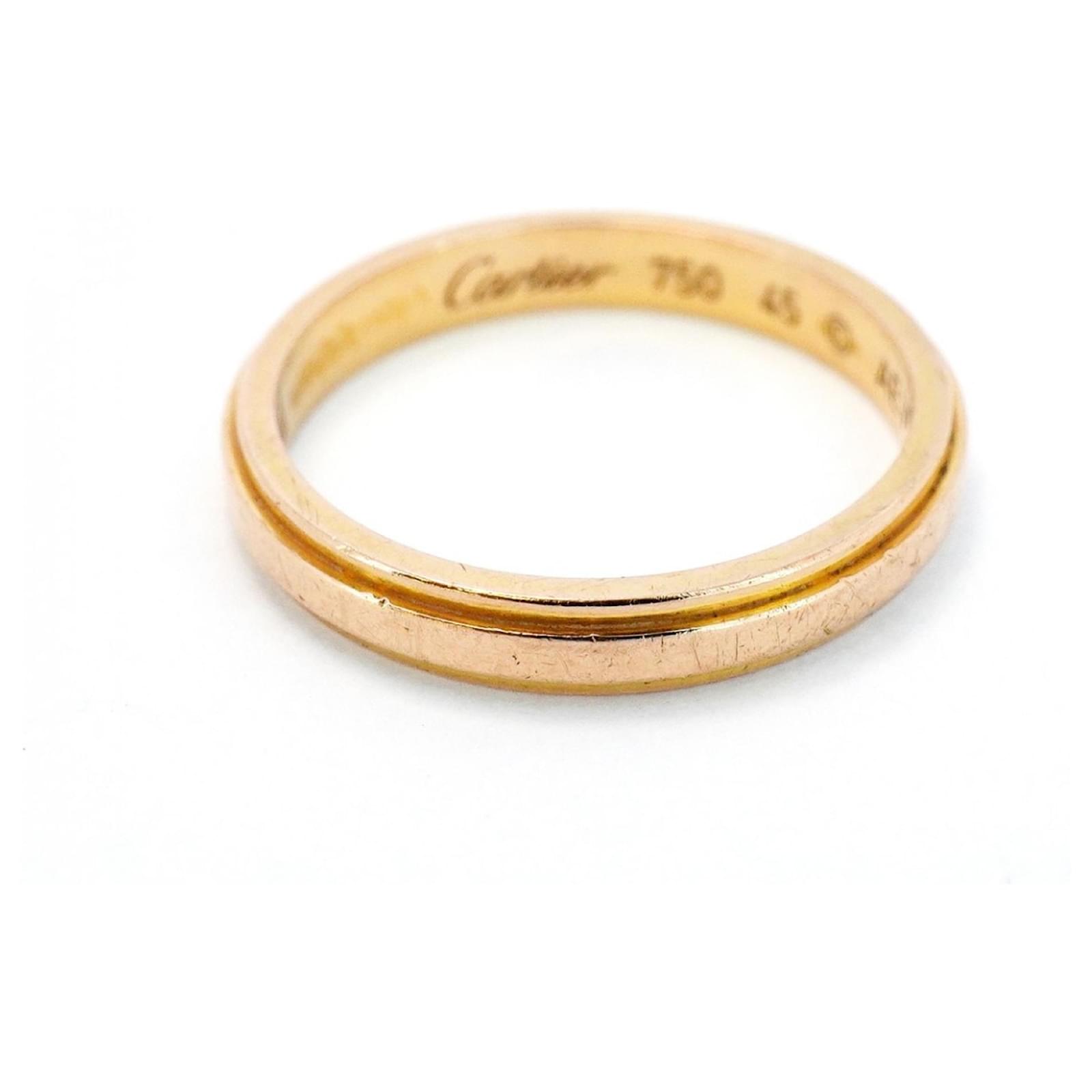 This Cartier Ring D’Amour is crafted from 18K pink gold and features a band design, making it a timeless piece for any occasion. The ring is a brand size 45, equivalent to a US size 3.5. \n\nIt is classified as used but remains in good condition, showing slight traces of usage, including minor scratches and dirt. The ring is inscribed with initials and a date, adding a personal touch. \n\nPlease refer to the images for a detailed view of the item’s condition and any included accessories, as none are provided with the purchase.
