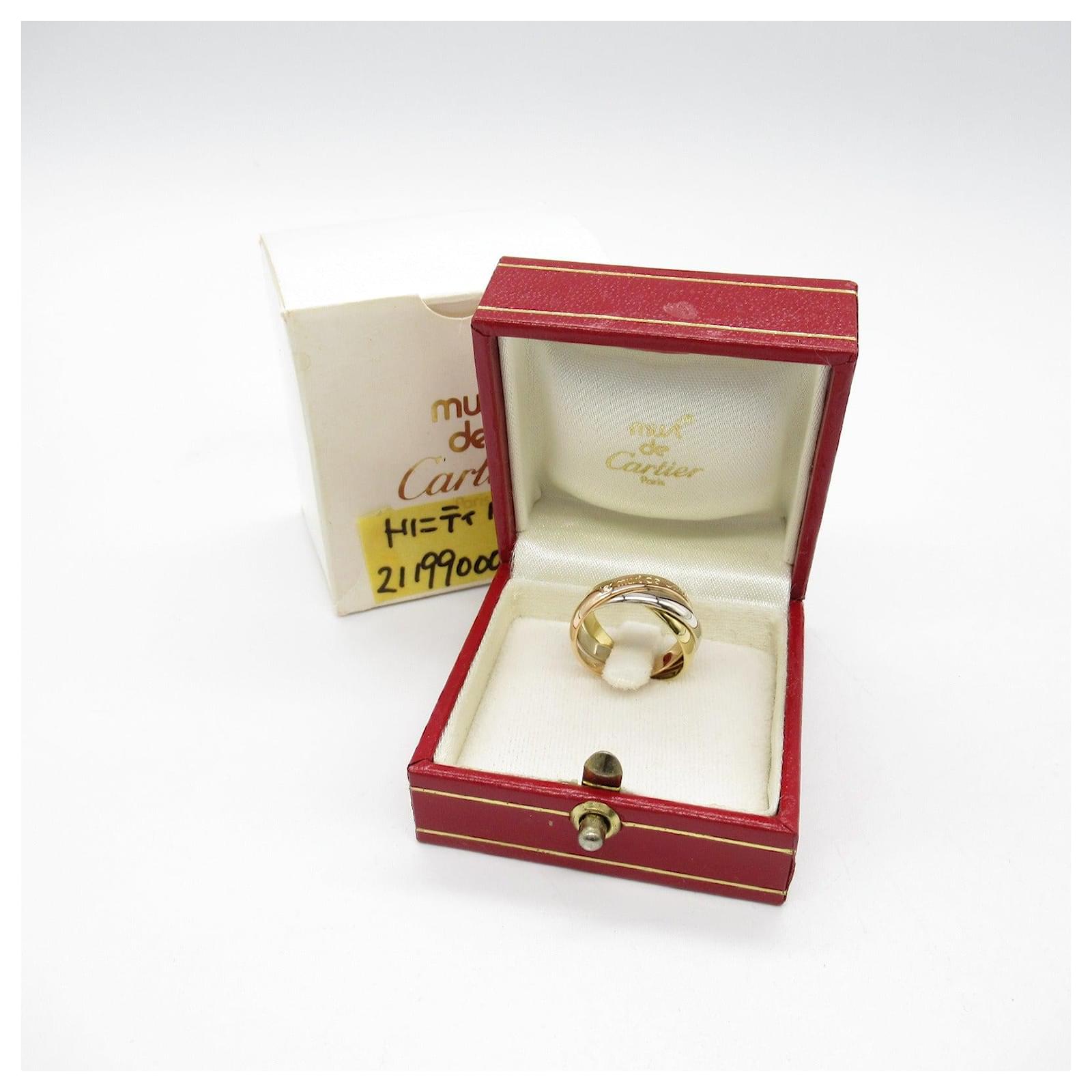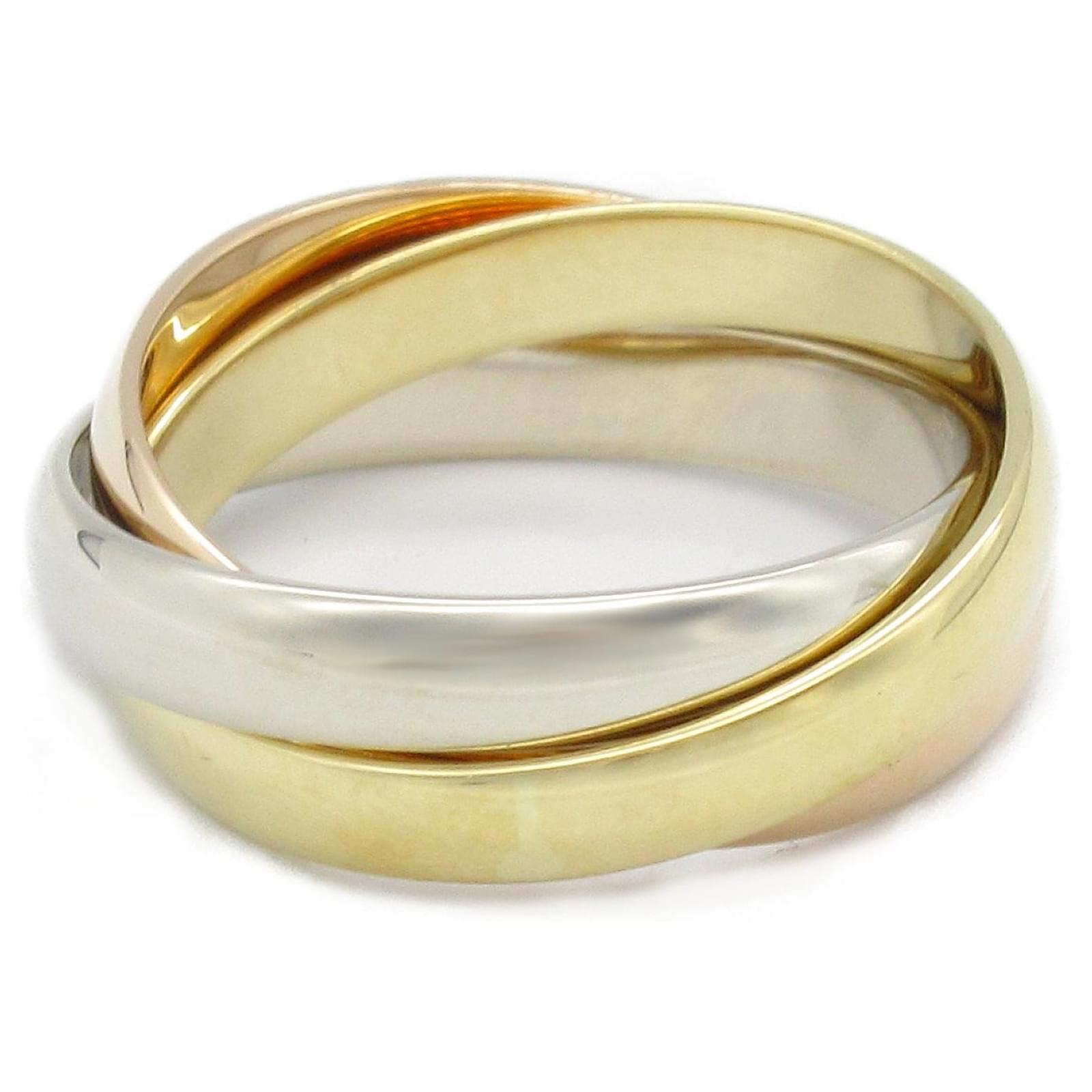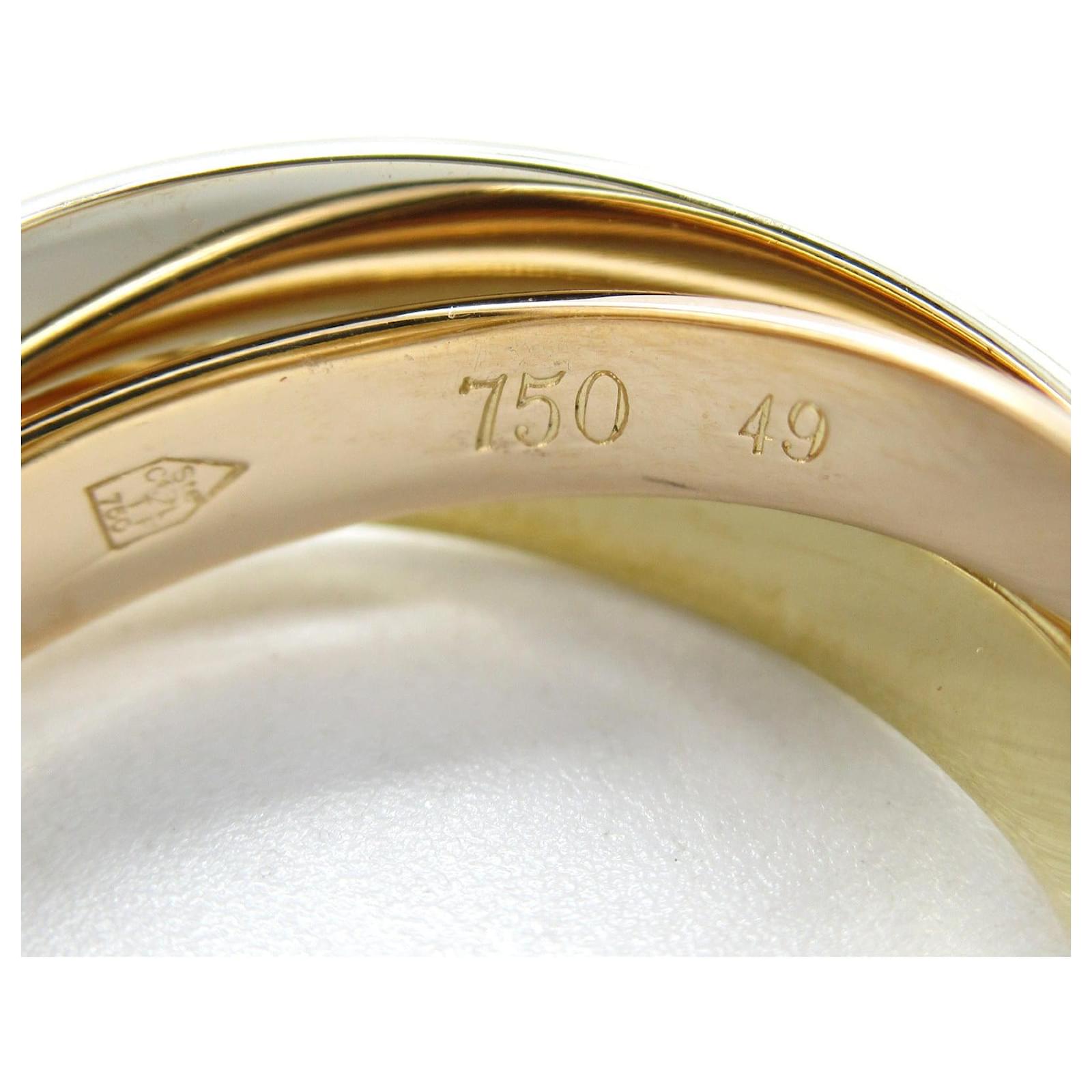 – General information -\nBrand : CartierItem name : Cartier Trinity Au750 Ring Size 9Model number : – Design -Type : RingMaterial : MetalColor : GoldGender : Female- Size -Size : Size : 9Weight : 6.2Main Material : 750 YG- Inventory -Serial Number : SKU : 120240042840000A0025820180- Included Items -Accessories : Box*Before purchasing, please refer to the images of the accessories included with the item.- Condition -Condition : Very Good ConditionRank : Used A Used condition with some scratches and stains.Condition Notice : Before purchasing, please refer to the images for the exact condition of the item. \n Product Id: 513949 \n