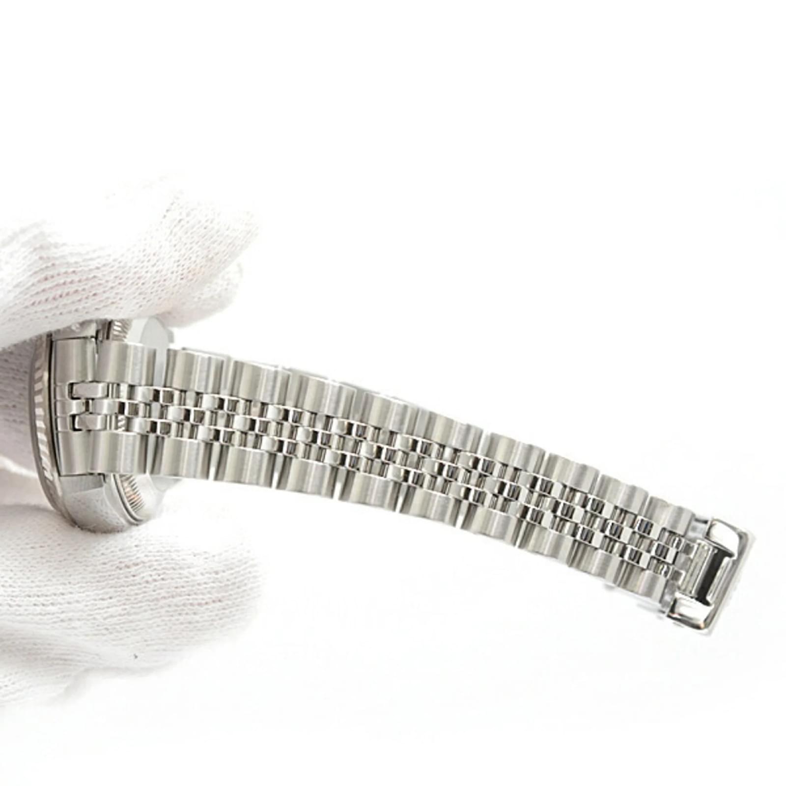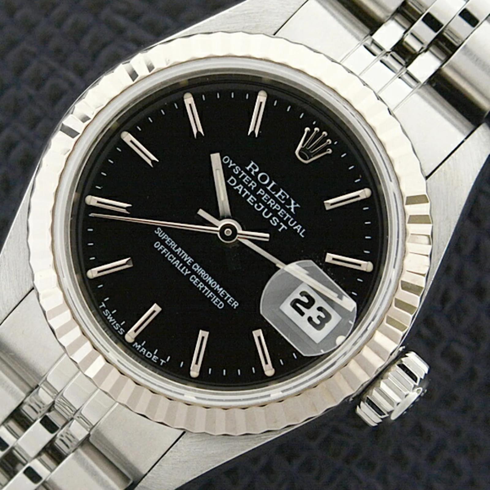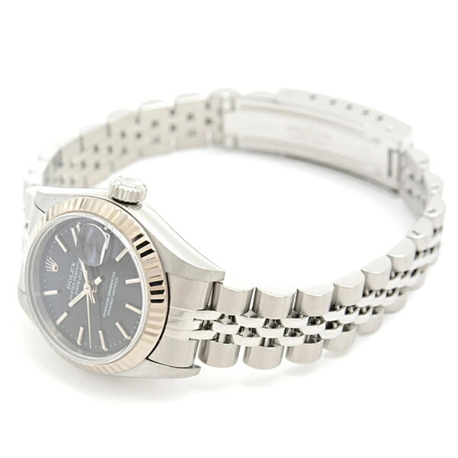 This Rolex Ladies Datejust wristwatch features a black dial and is crafted from stainless steel and 18K white gold. The model code is 69174, and it operates on a self-winding automatic movement. The watch has a case diameter of 28.8mm and is suitable for a wrist size of 17.5cm (6.88 inches). Weighing 52.9g, it is classified as used but in very good condition, with insignificant scratches on the bezel, case, and bracelet. The dial and glass are free from scratches, and the overall appearance shows only minor traces of usage. Please refer to the images for a detailed view of the item’s condition and included accessories.