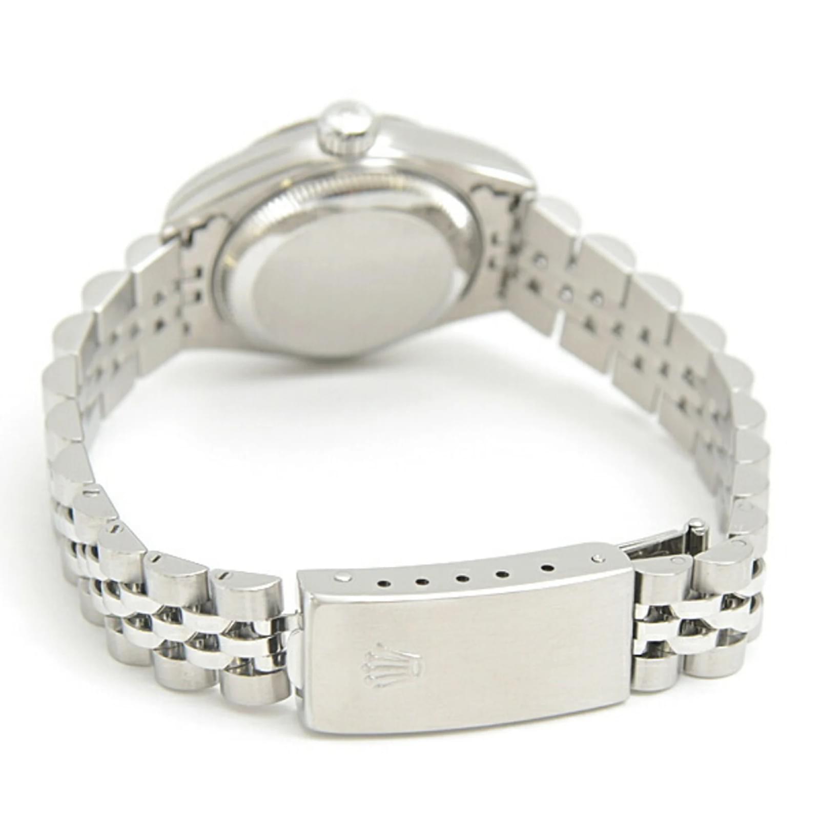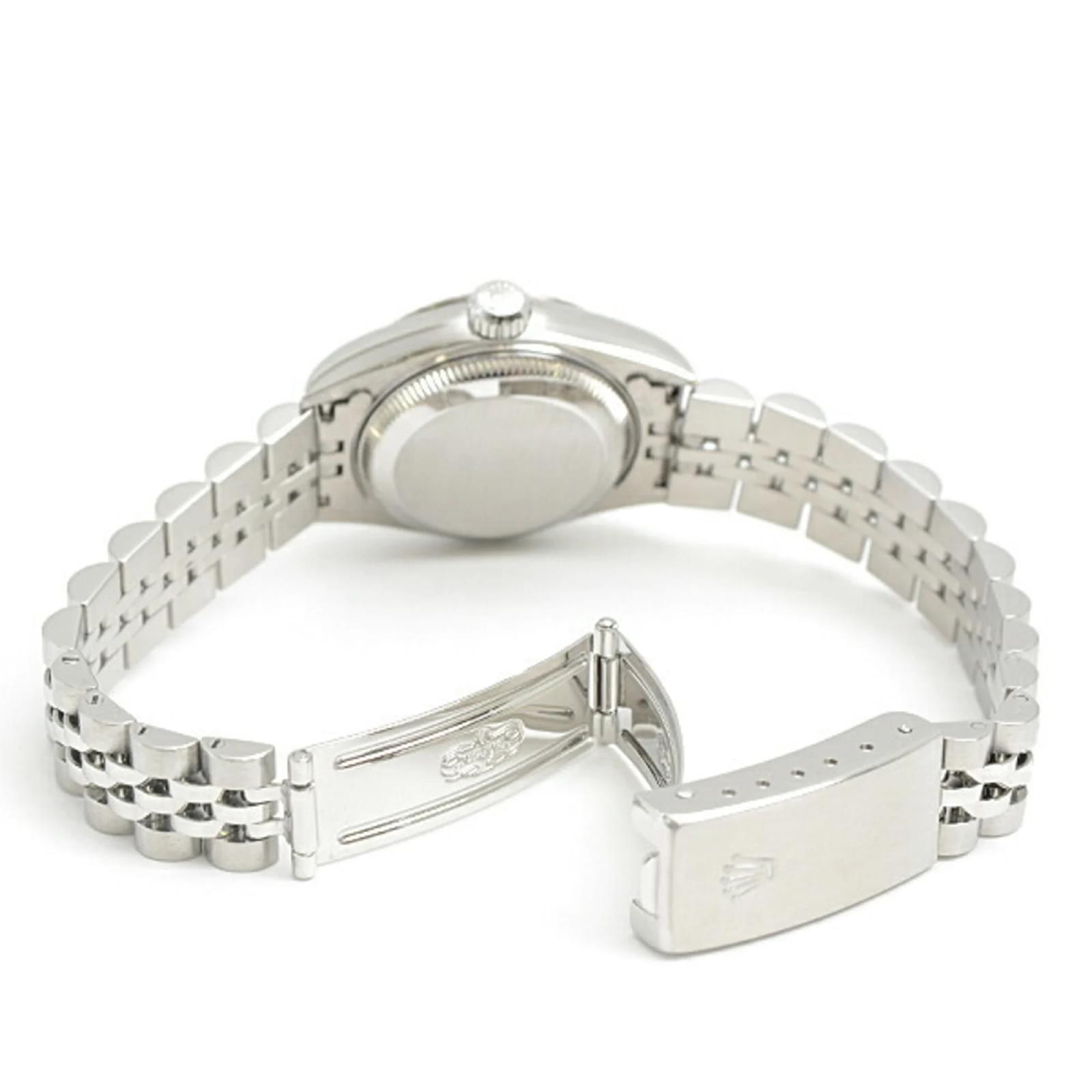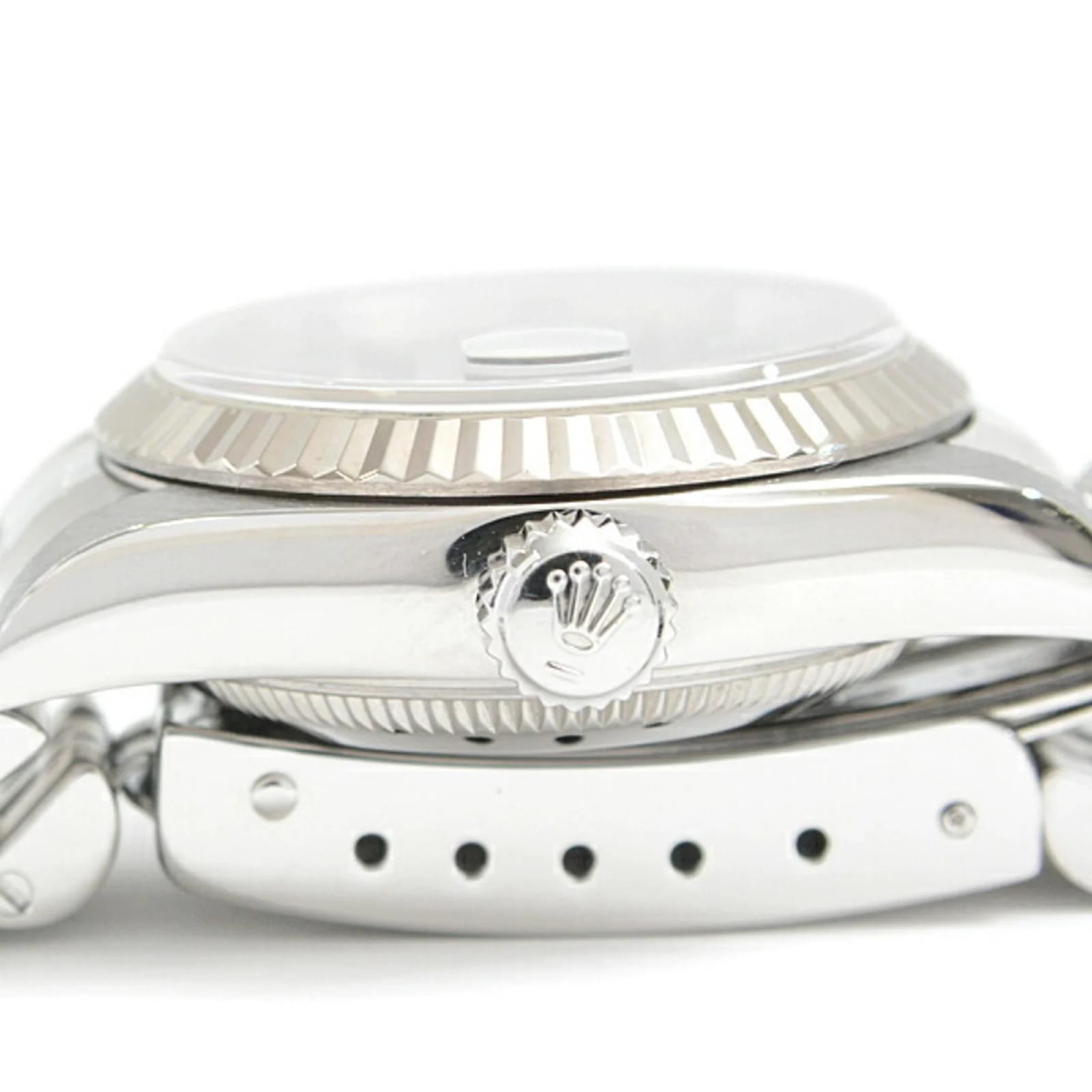 This Rolex Ladies Datejust wristwatch features a black dial and is crafted from stainless steel and 18K white gold. The model code is 69174, and it operates on a self-winding automatic movement. The watch has a case diameter of 28.8mm and is suitable for a wrist size of 17.5cm (6.88 inches). Weighing 52.9g, it is classified as used but in very good condition, with insignificant scratches on the bezel, case, and bracelet. The dial and glass are free from scratches, and the overall appearance shows only minor traces of usage. Please refer to the images for a detailed view of the item’s condition and included accessories.