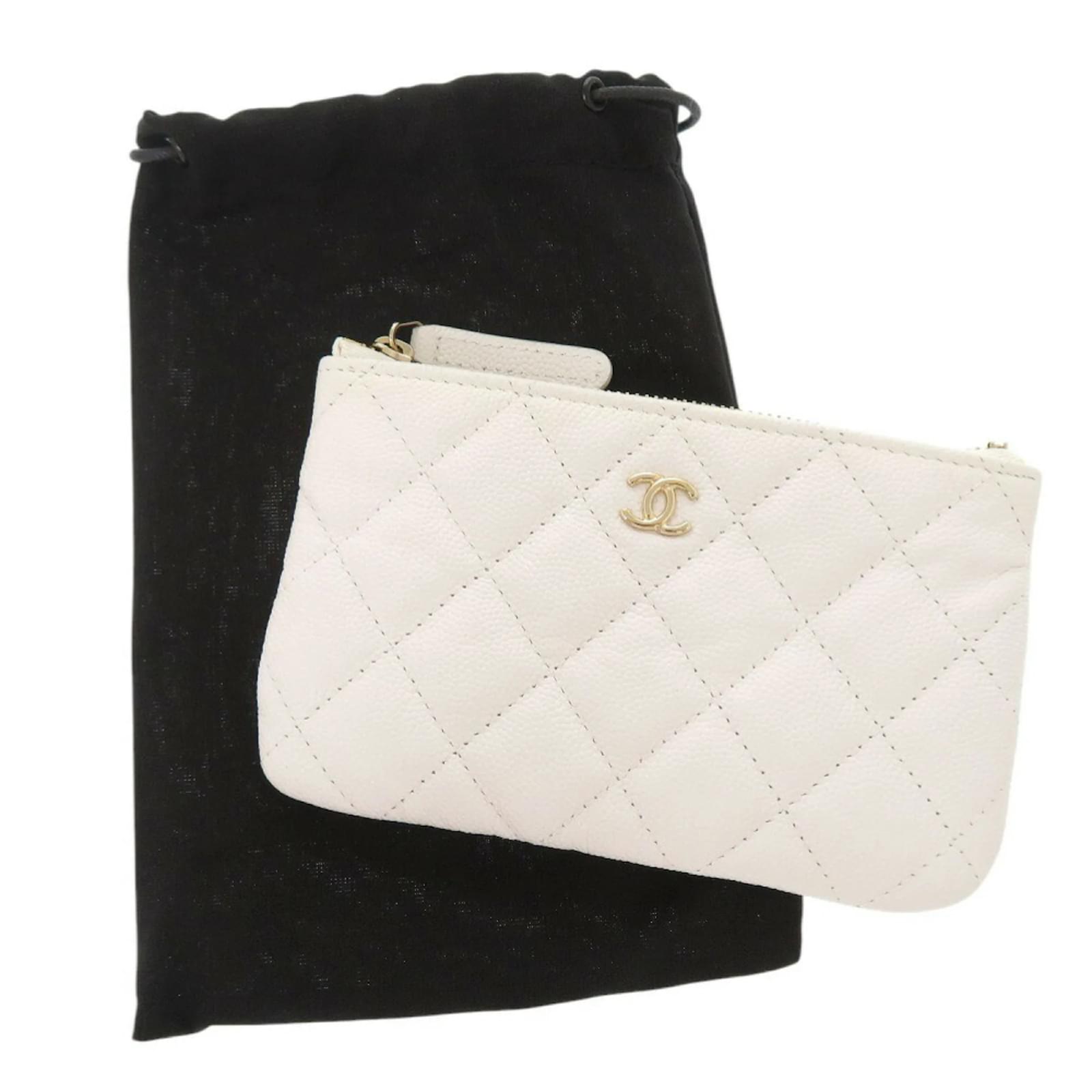 This Chanel coin purse, crafted from grained calfskin, features a classic white design and is part of the Matelasse Coco Mark collection. Measuring 9cm x 15cm x 1cm, it is compact yet functional for carrying coins and small essentials. \n\nOriginating from Italy, this item is in good used condition, classified as Rank AB, with slight traces of usage, including minor scratches and discoloration on the exterior. It comes with a dust bag for storage. Potential buyers are encouraged to review the provided images for a detailed view of the item’s condition and included accessories.