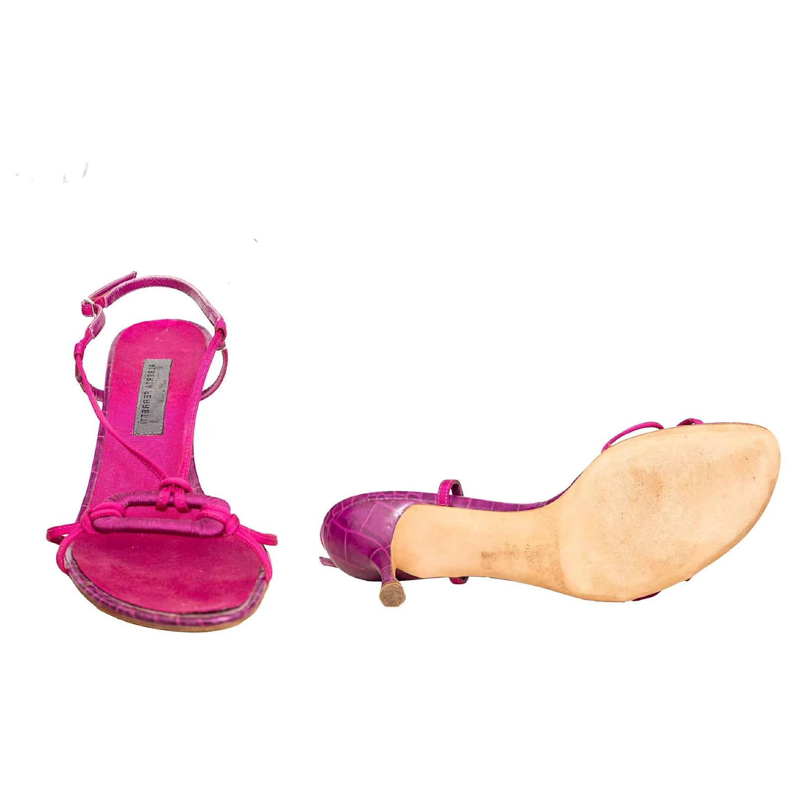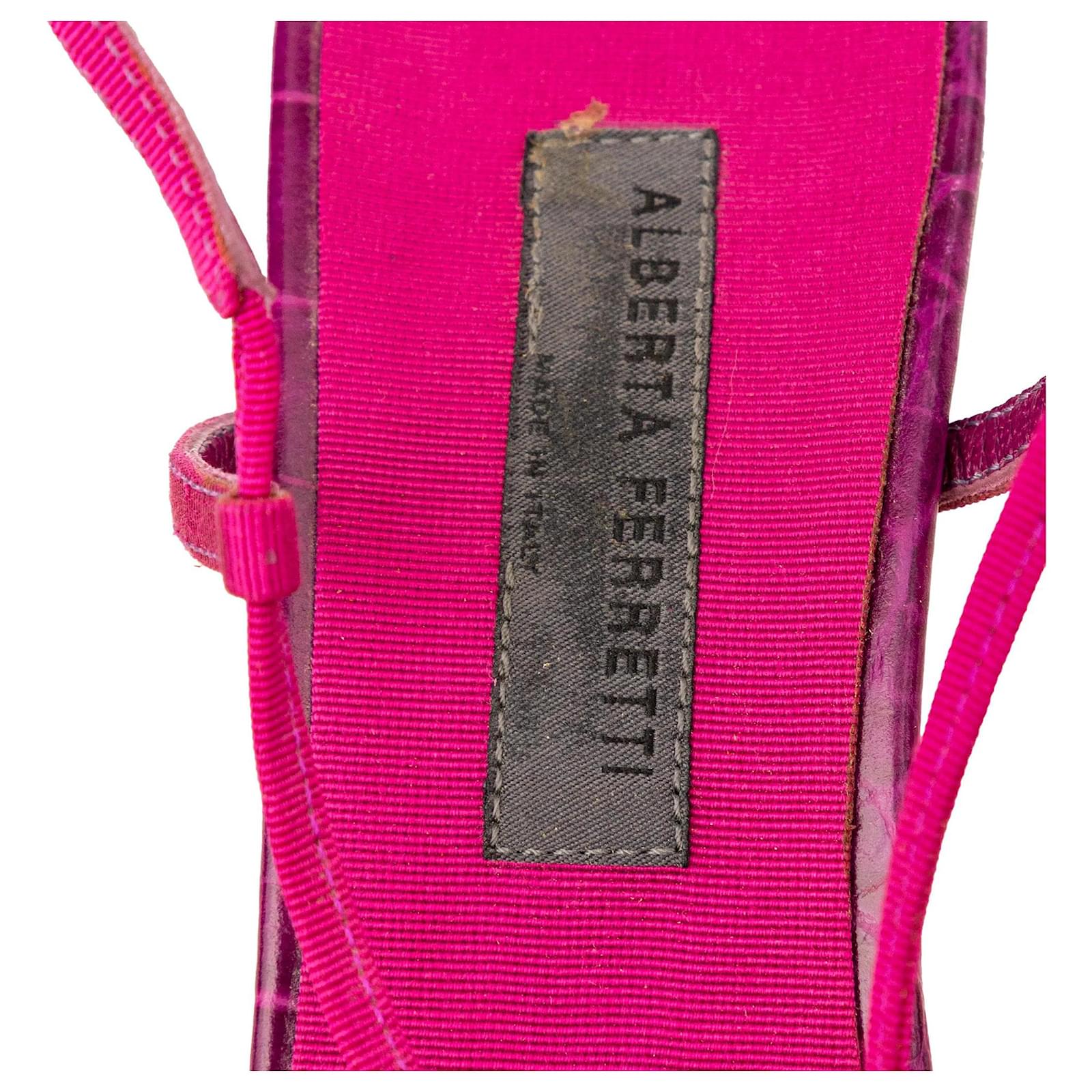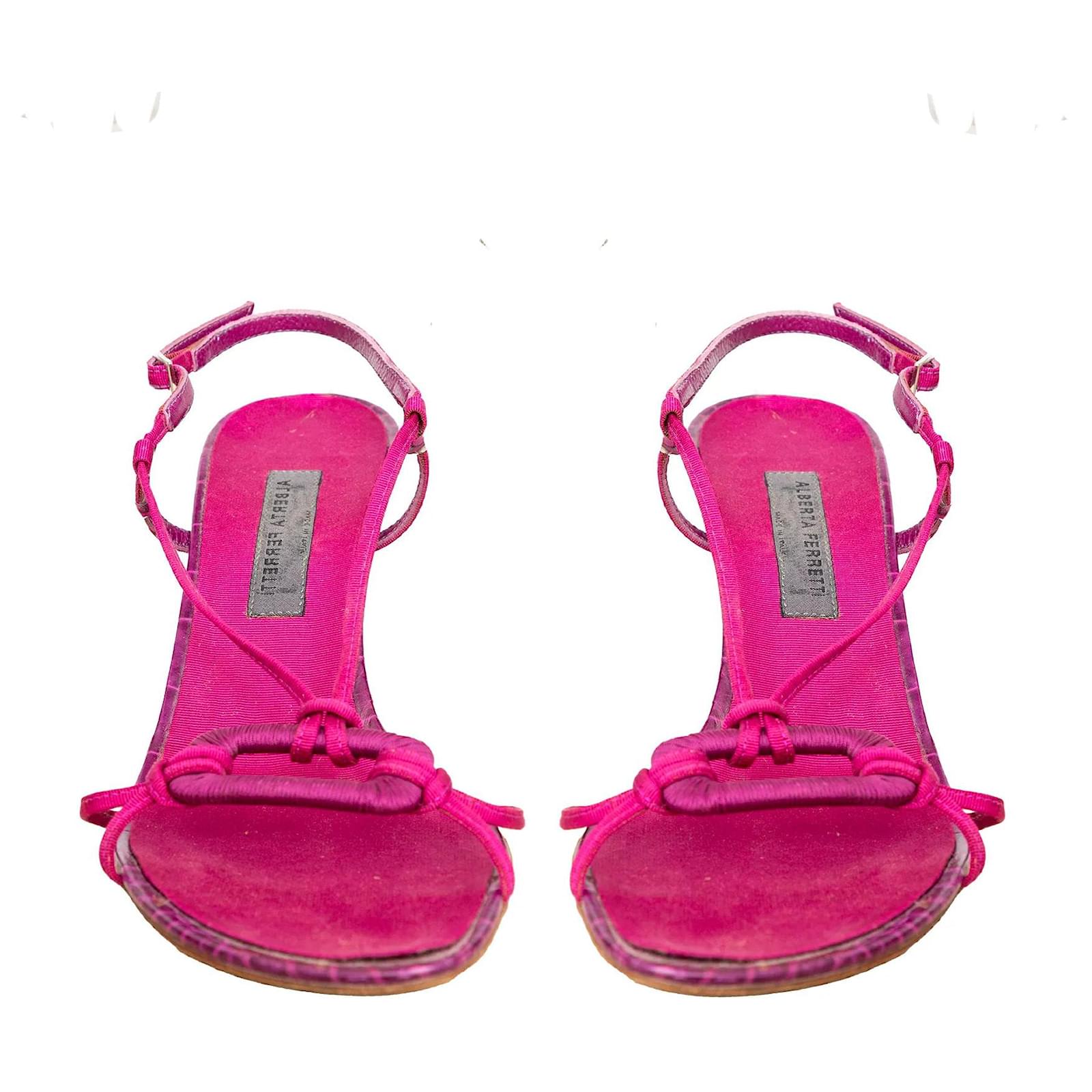 Bright fuchsia pink Alberta Ferretti sandals with thread-covered buckle, ankle straps, embossed leather, and a chic short heel. \n\nRemarks: there are some signs of wear. \n\nInsole Length:24\nHeel:6.5\nFabric | Leather