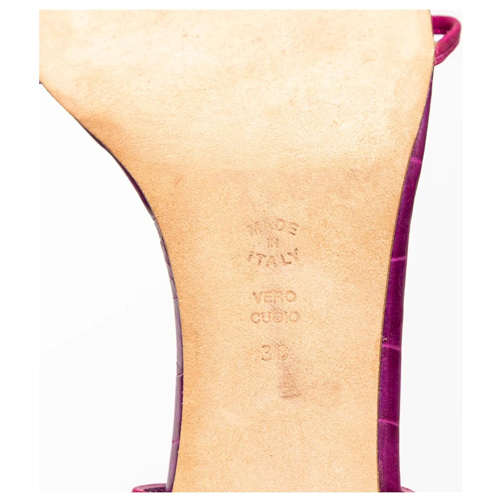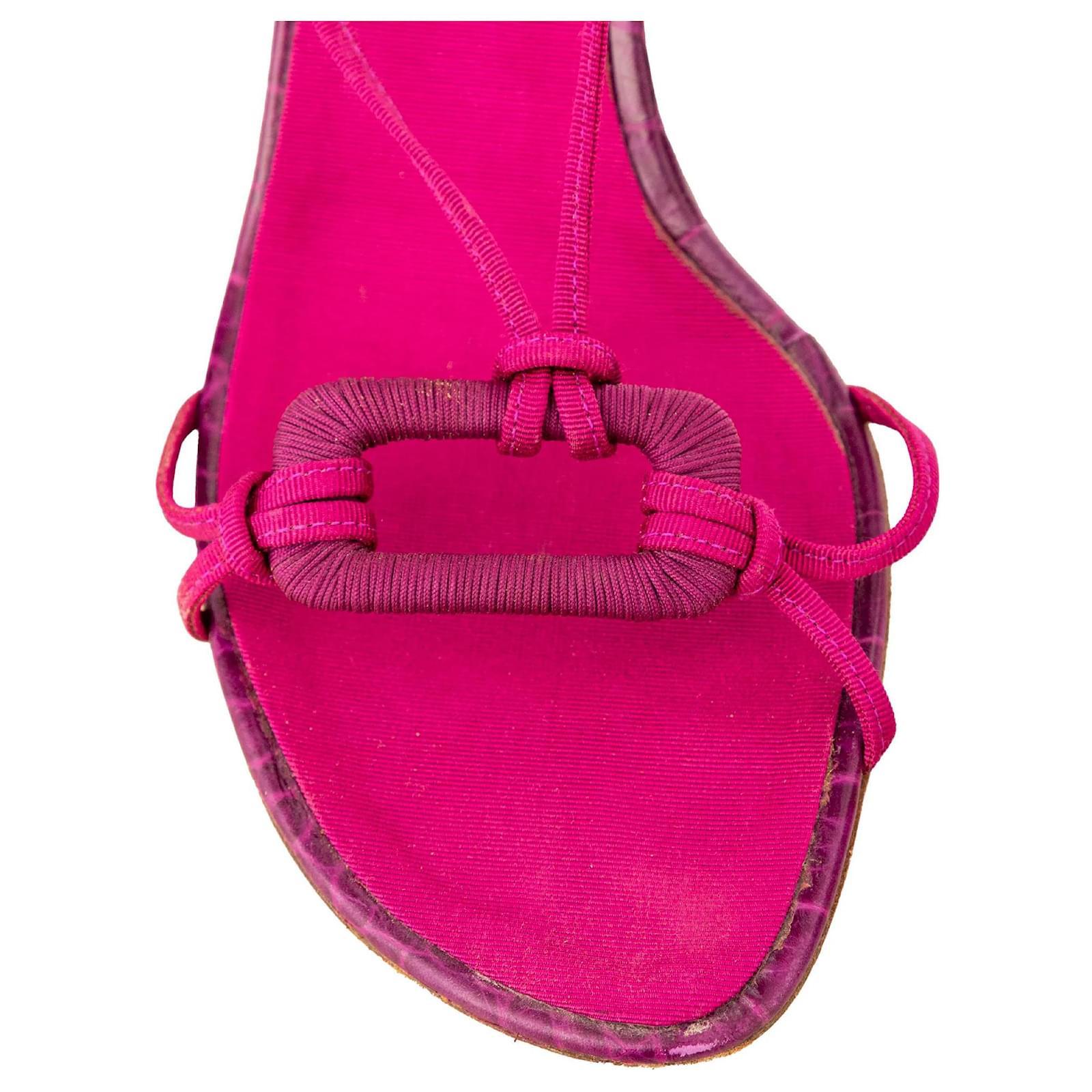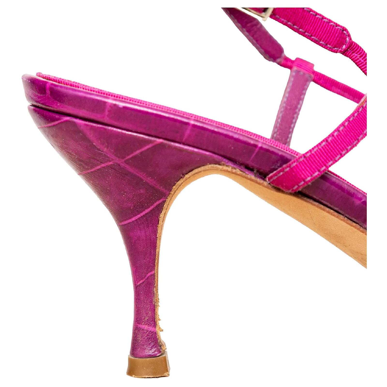 Bright fuchsia pink Alberta Ferretti sandals with thread-covered buckle, ankle straps, embossed leather, and a chic short heel. \n\nRemarks: there are some signs of wear. \n\nInsole Length:24\nHeel:6.5\nFabric | Leather