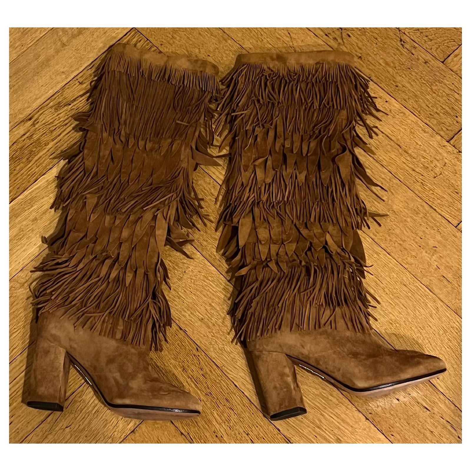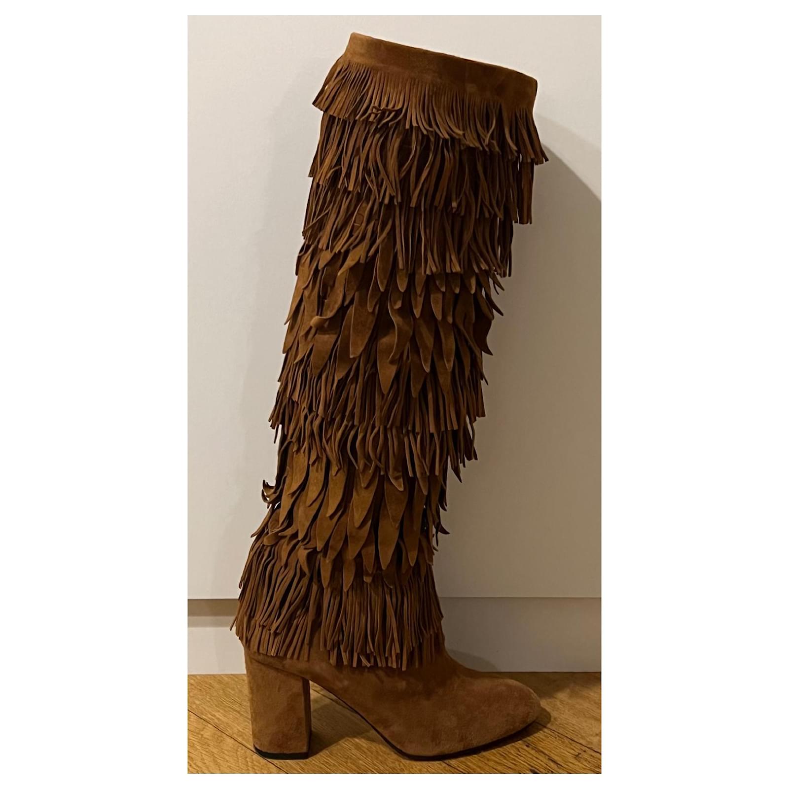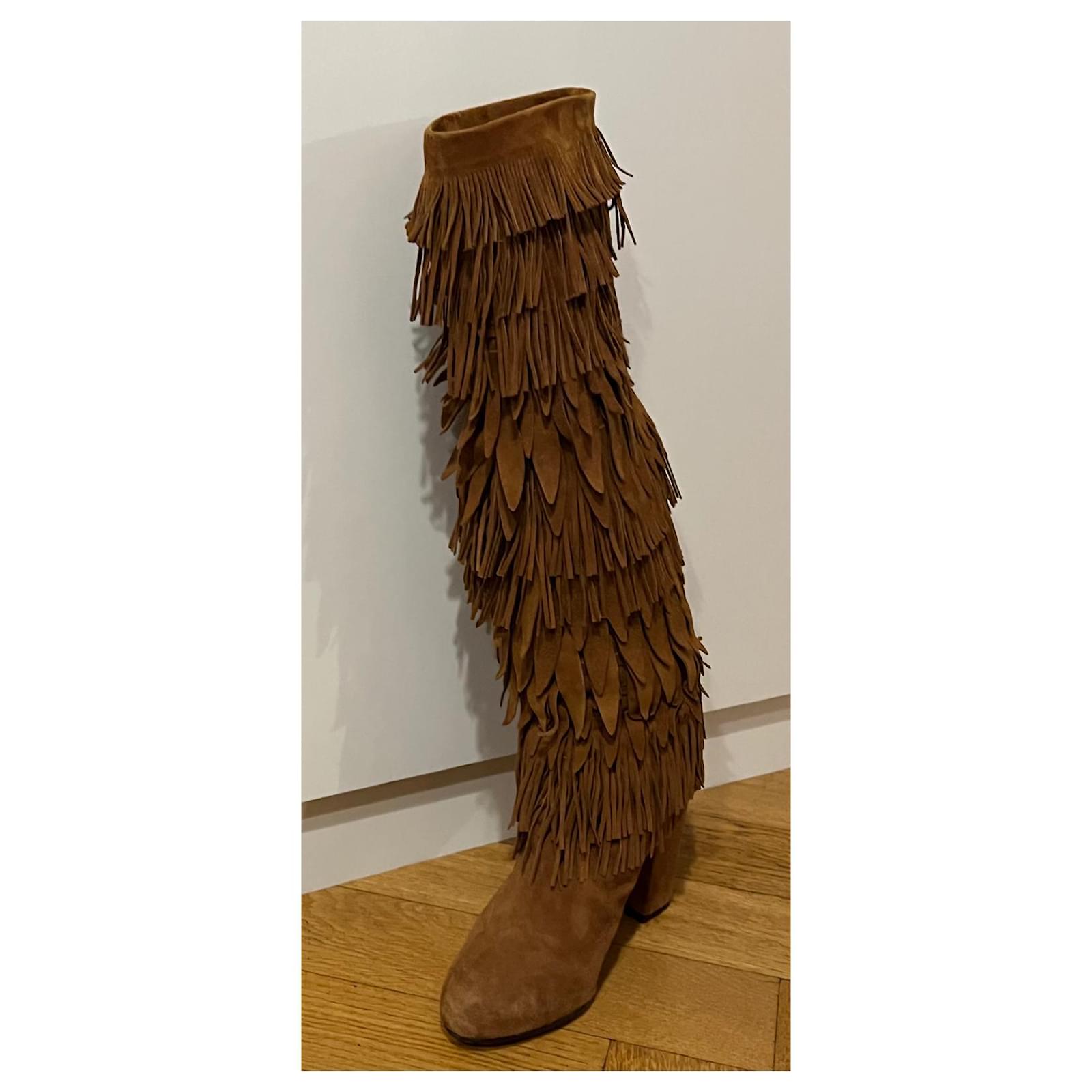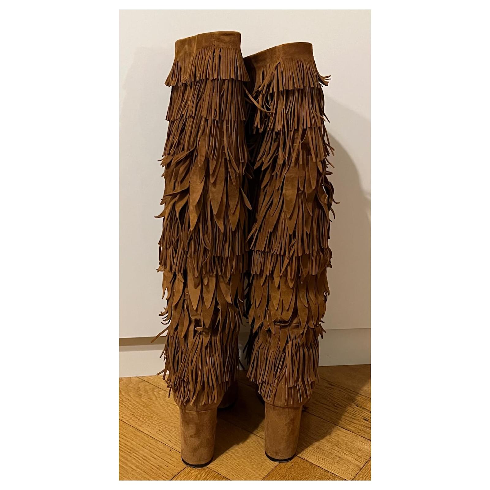 Aquazzura fringed camel suede boots, 8 cm heel, size IT 35.5.