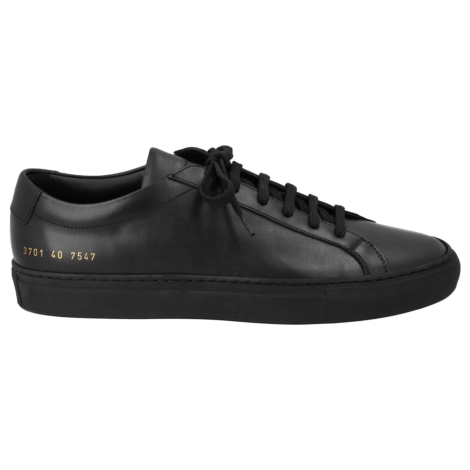 Common Projects\n Achilles Sneakers\n \n\n Black, leather, round toe, front lace-up fastening, gold-tone logo, leather insole with embossed logo, flat rubber sole.\n \n\n Made in Italy\n \n\n composition\n Sole: Rubber 100%\n \n\n Outer material: Calf leather 100%\n \n\n Lining: Calf leather 100%Measurments: \n Product Id: 376353 \n