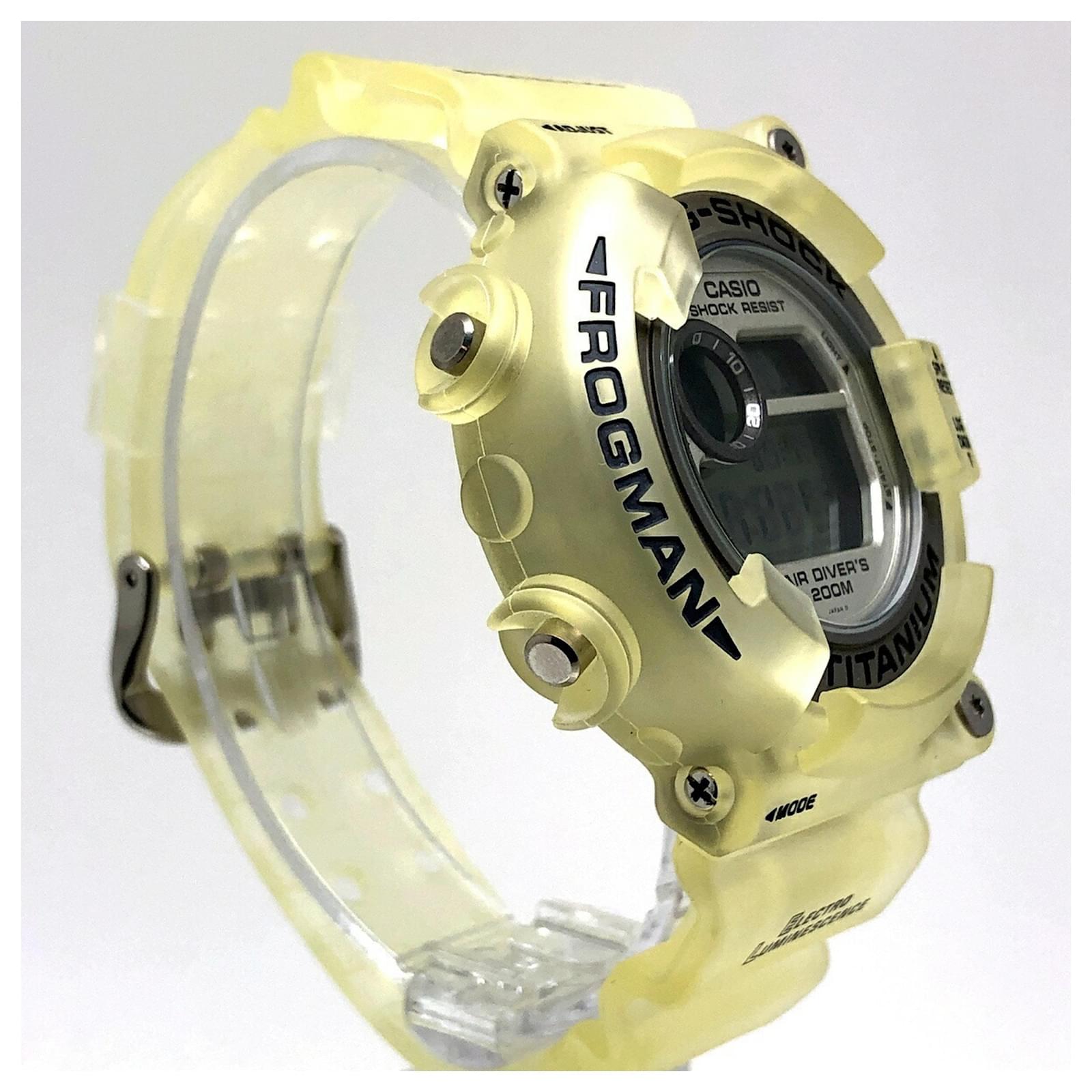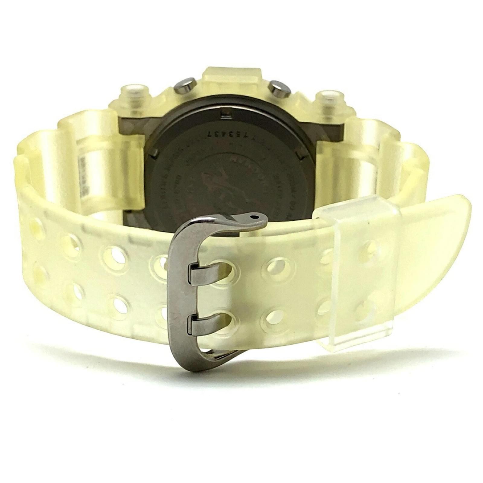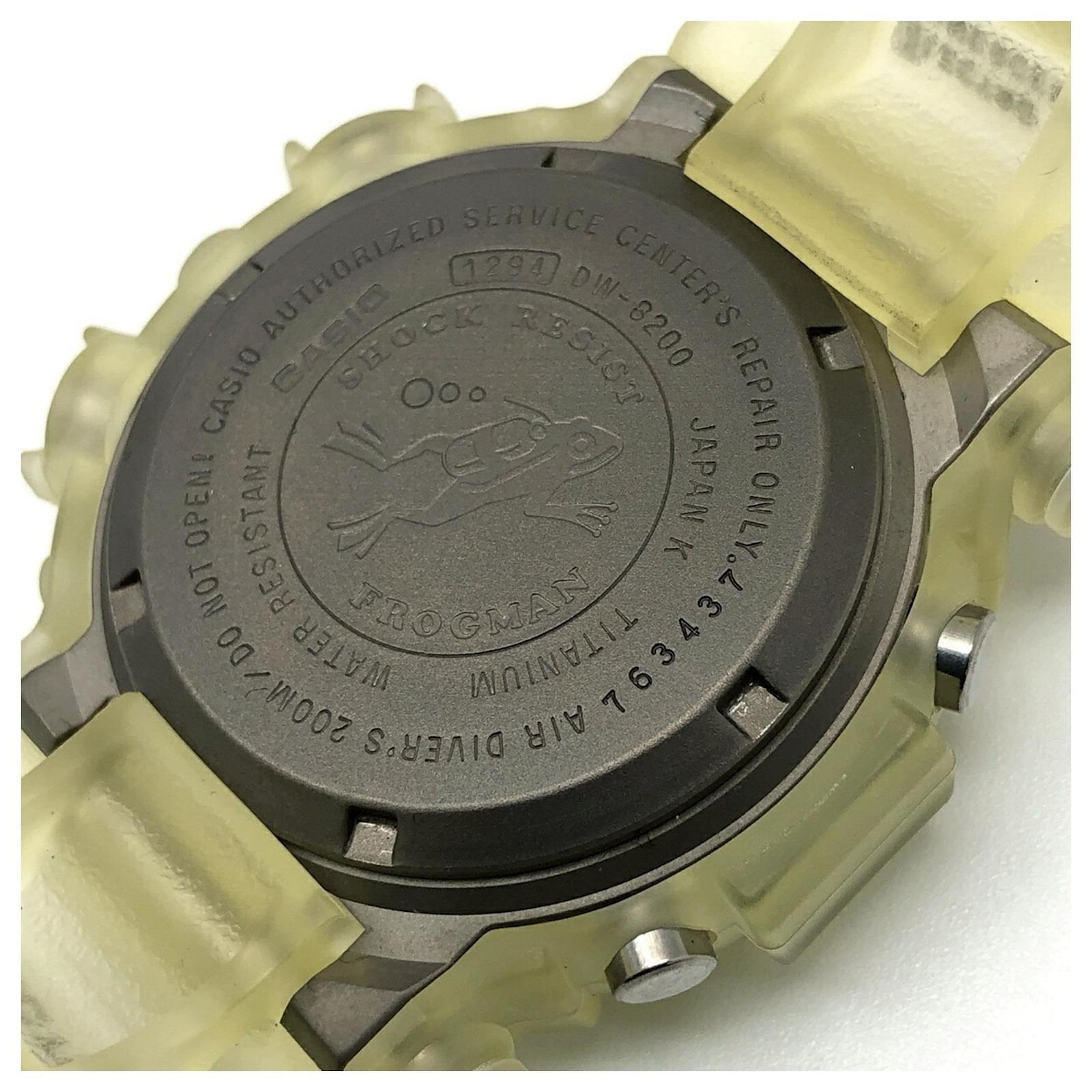 The Casio G-Shock DW-8200WC-7AT is a wristwatch featuring a titanium case and a distinctive white skeleton transparent design. Released in August 1997, this model is part of the G-Shock line and is known for its durability and unique aesthetic. \n\nThis particular watch is classified as used but remains in good condition, with insignificant scratches on the bezel and bracelet. It comes with its original inner and outer boxes, as well as a manual. Potential buyers are encouraged to review the provided images for a detailed view of the item’s condition and included accessories.