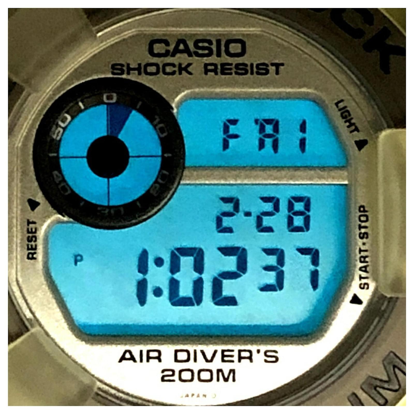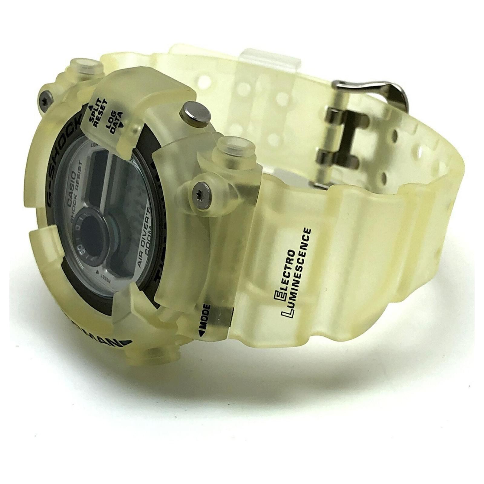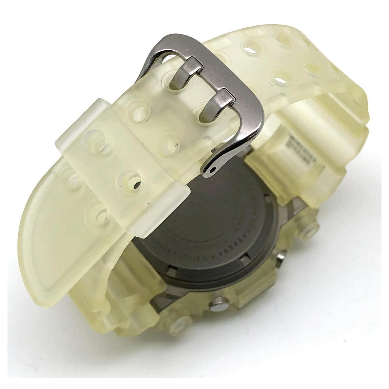 The Casio G-Shock DW-8200WC-7AT is a wristwatch featuring a titanium case and a distinctive white skeleton transparent design. Released in August 1997, this model is part of the G-Shock line and is known for its durability and unique aesthetic. \n\nThis particular watch is classified as used but remains in good condition, with insignificant scratches on the bezel and bracelet. It comes with its original inner and outer boxes, as well as a manual. Potential buyers are encouraged to review the provided images for a detailed view of the item’s condition and included accessories.