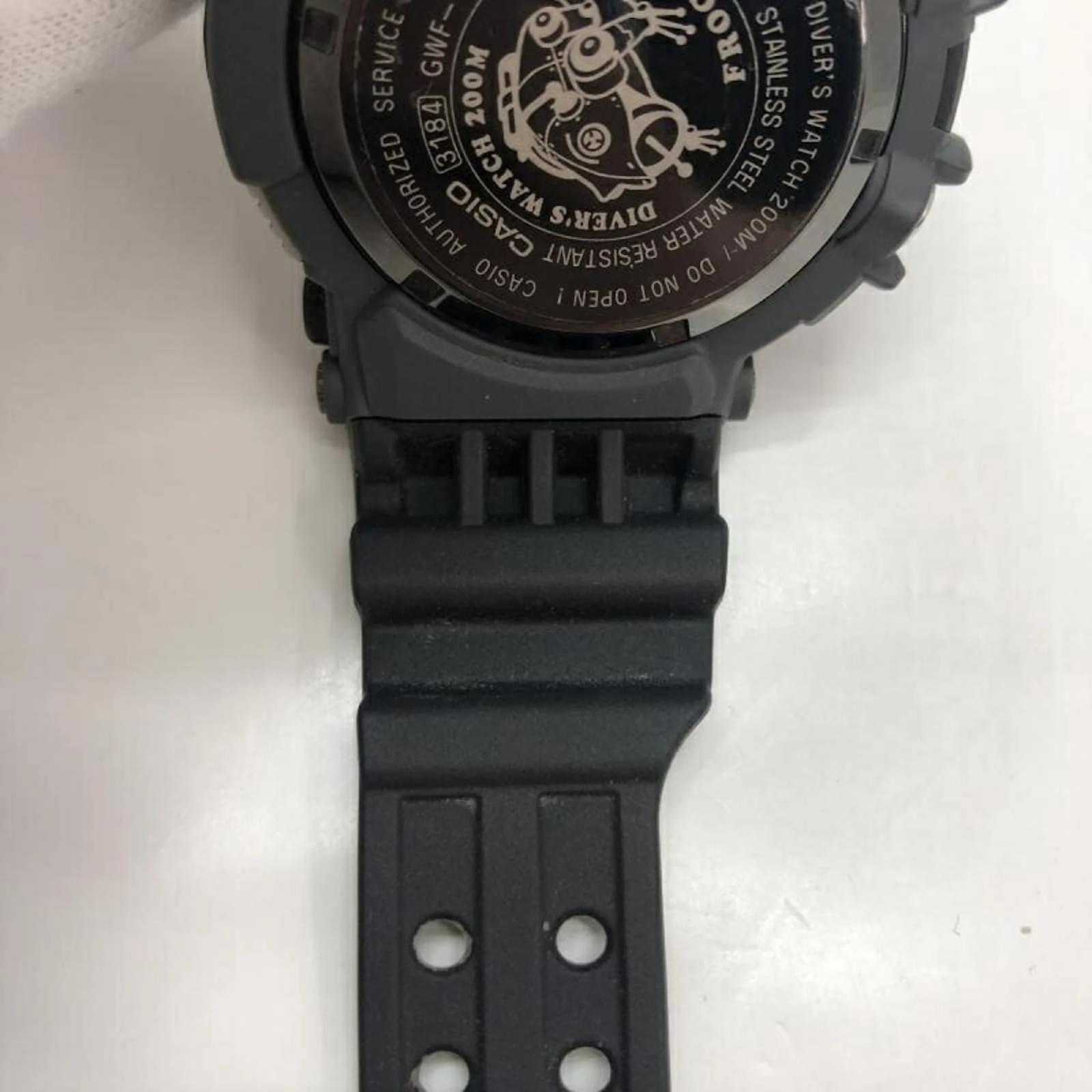 The Casio G-Shock Frogman Solar Radio Controlled Watch, model GWF-1000-1JF, is a durable wristwatch designed for those who appreciate functionality and style. This used timepiece, with a wrist size of 26cm (10.23 inches), is classified as Rank B, indicating it shows traces of usage, including some visible damages and dirt, yet remains in acceptable condition for continued use. The watch features solar movement and is equipped with a radio-controlled clock for precise timekeeping. Potential buyers are encouraged to review the provided images for a clear understanding of the item’s condition and included accessories.
