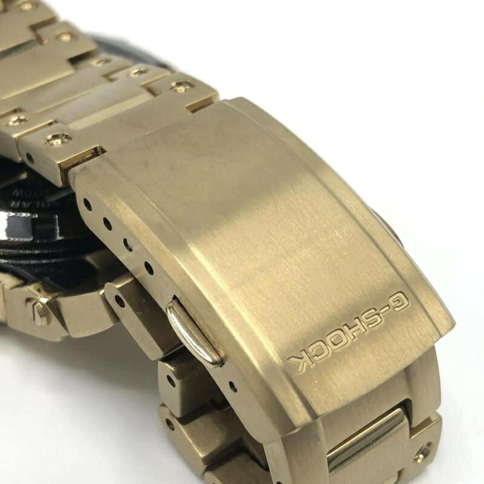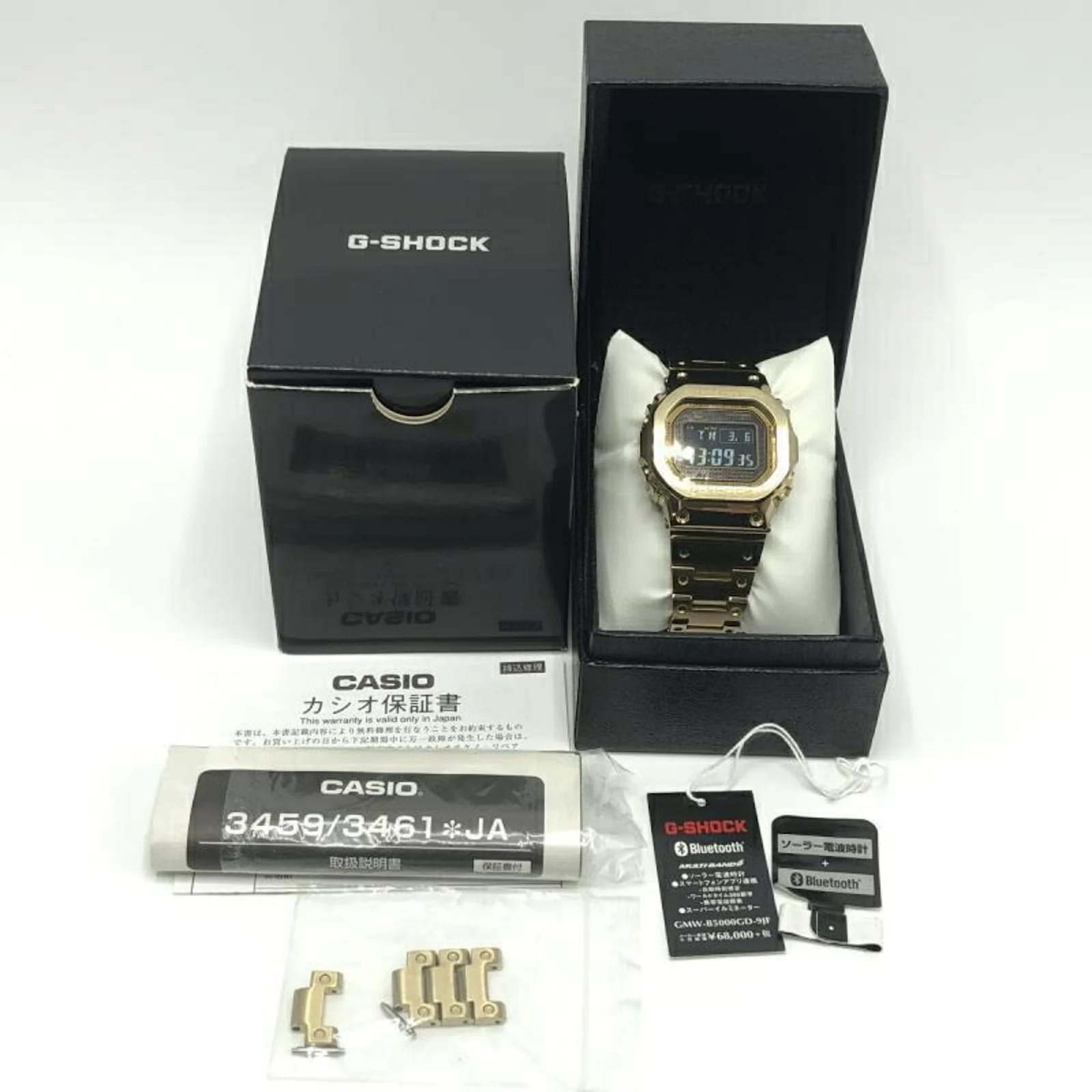 The Casio G-Shock GMW-B5000 is a digital wristwatch featuring a gold dial. Designed for a wrist size of 18cm (7.08 inches), this model is part of the renowned G-Shock line. The watch is in used condition, classified as Rank AB, indicating it shows traces of usage, including scratches and dirt, but remains generally in good condition. Included with the watch are the inner box, links, manual, and outer box. Potential buyers are encouraged to review the images for a clear understanding of the item’s condition and included accessories.
