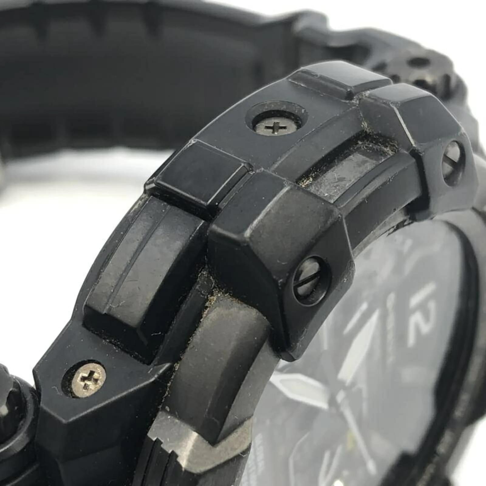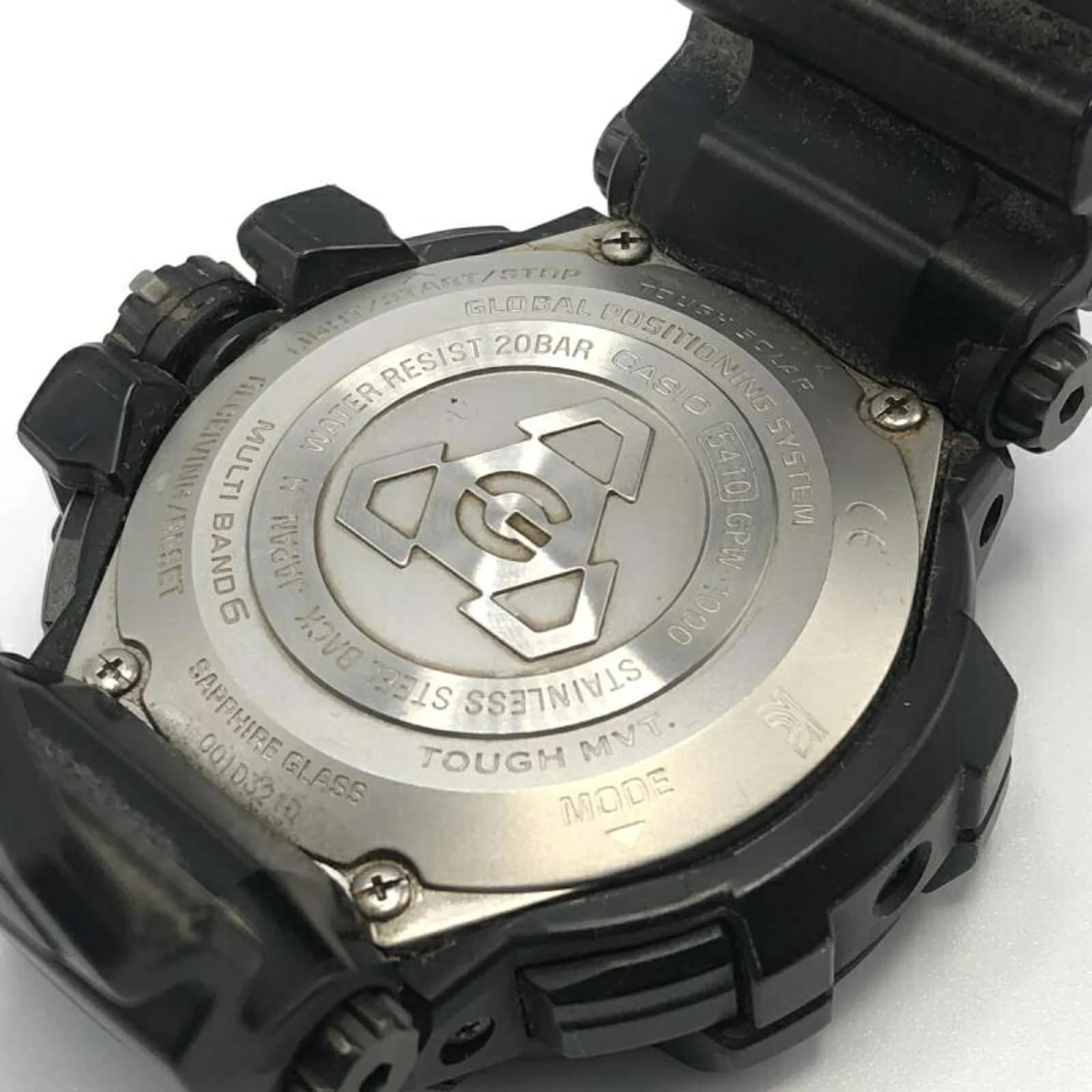 The Casio G-Shock GPW-1000 is a black wristwatch designed for durability and style. It accommodates wrist sizes ranging from 14cm to 21cm (5.51 inches to 8.26 inches). This model is classified as used and is in acceptable condition, showing traces of usage, including scratches and dirt, but remains functional. It is important to review the provided images for a clear understanding of its condition. The watch does not come with any additional accessories.