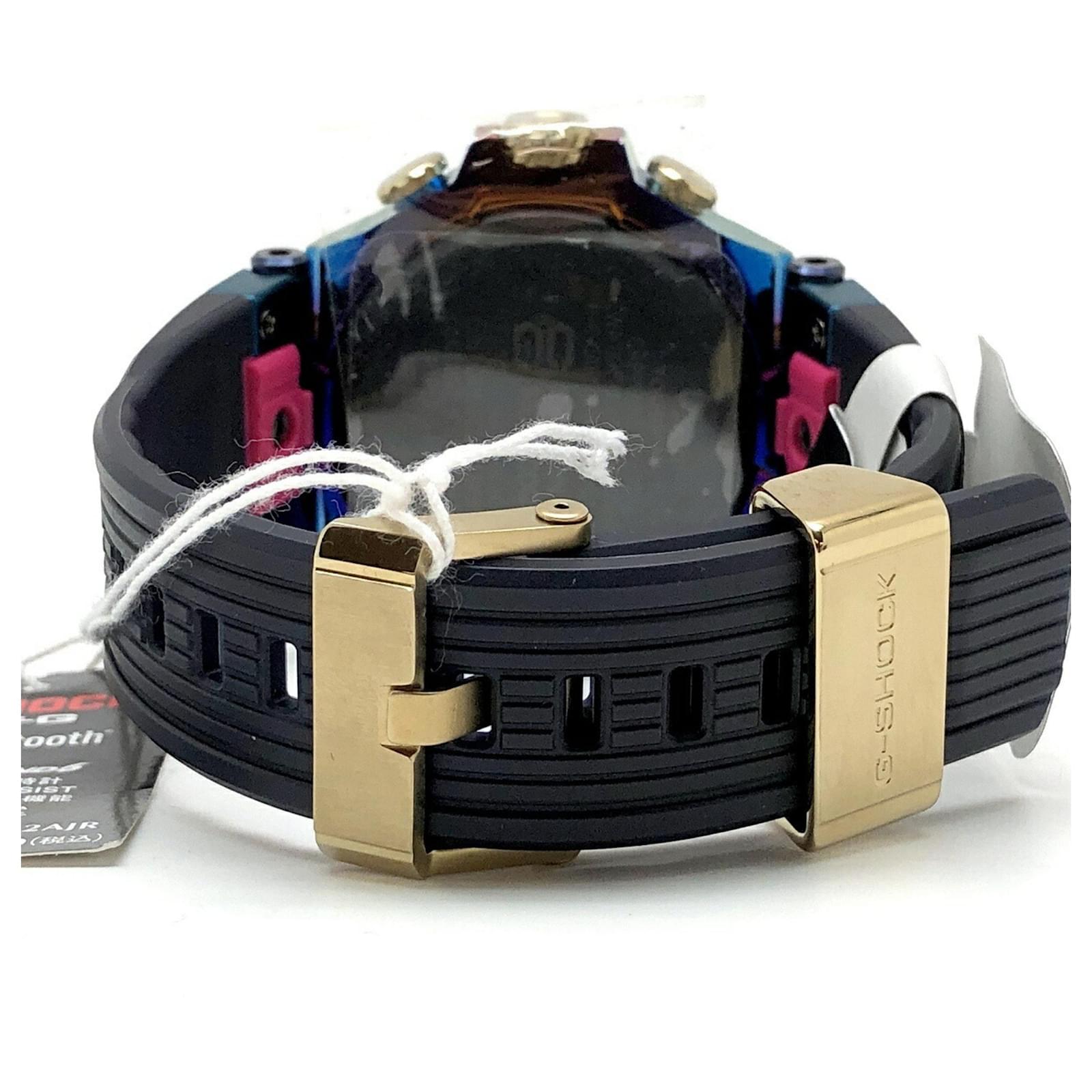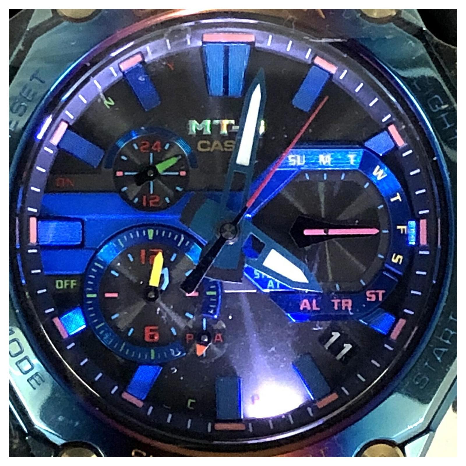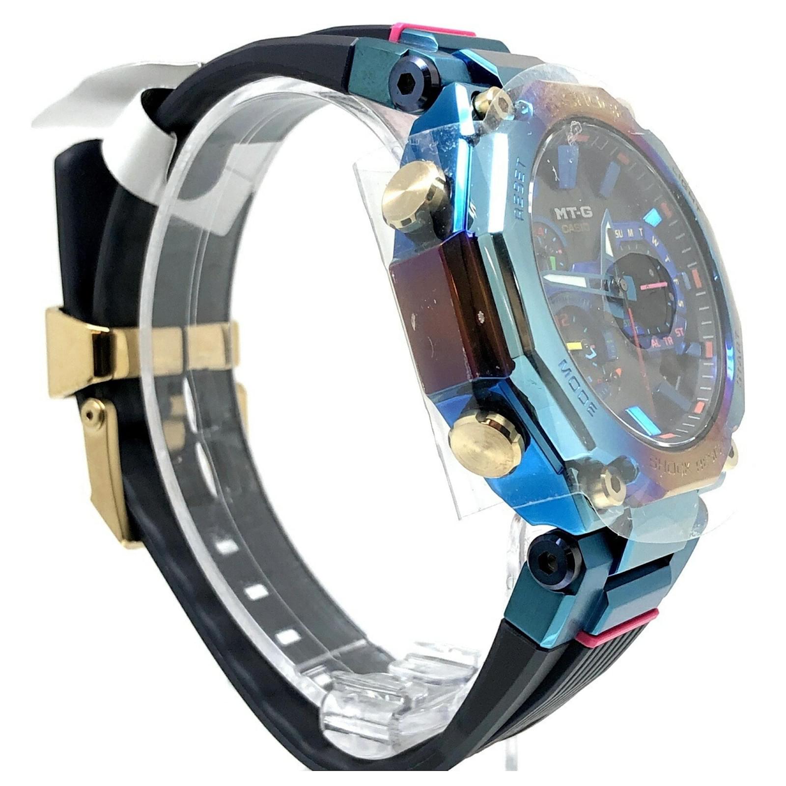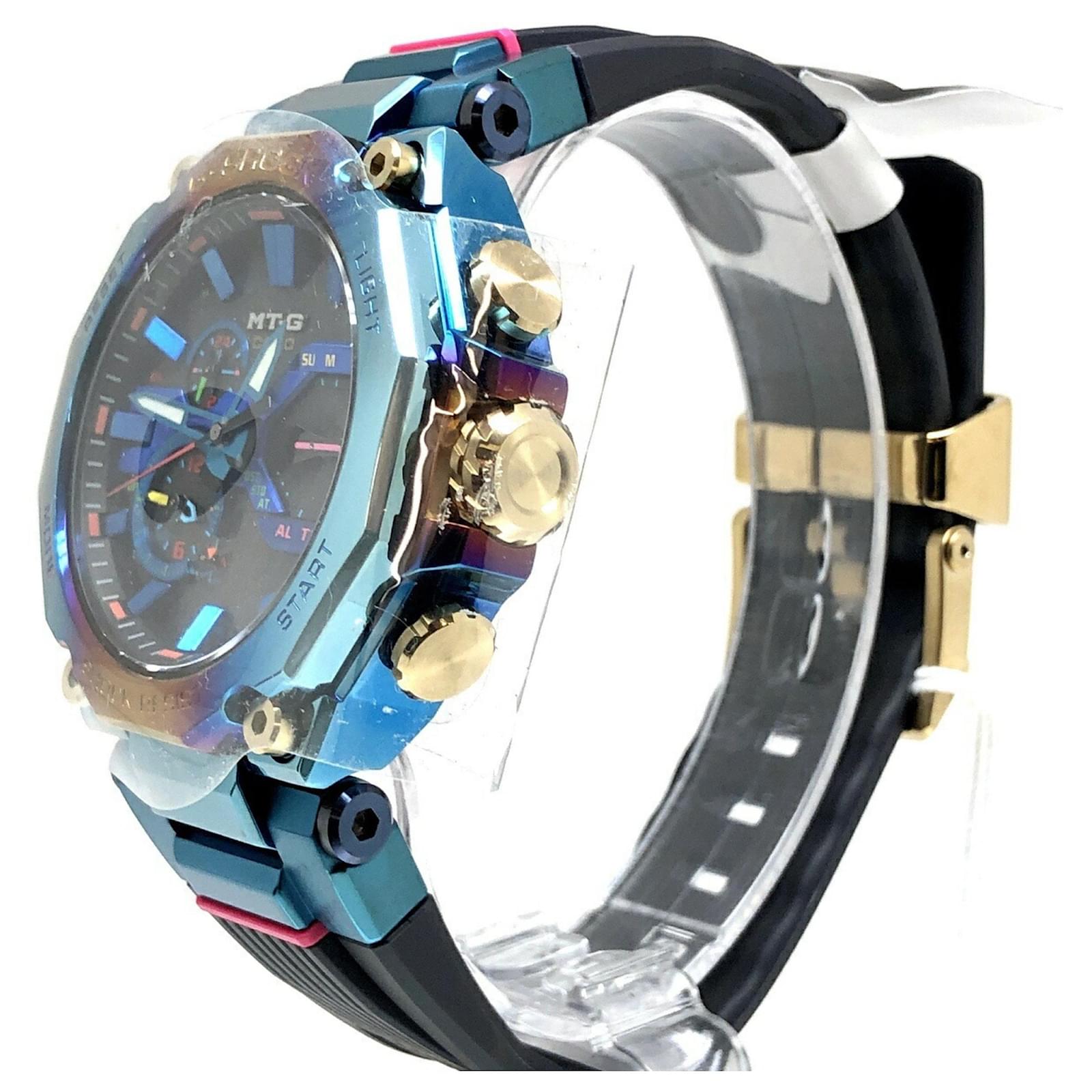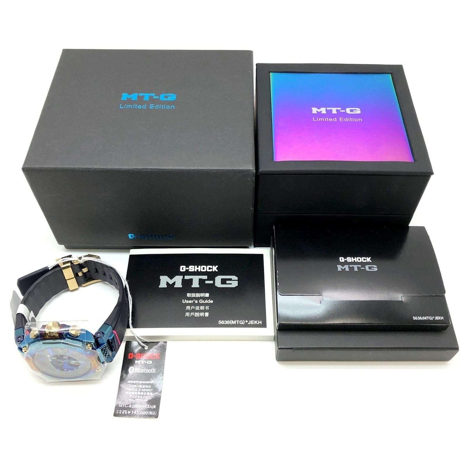 The Casio G-SHOCK MTG-B2000PH-2A is a solar-powered wristwatch that features a striking blue phoenix design. Released in May 2021, this model incorporates a rainbow IP finish and is built with a carbon core guard structure, ensuring durability and resistance to harsh conditions. It also includes Bluetooth mobile link capabilities for added convenience. \n\nThis used watch is in very good condition, with insignificant scratches on the bezel, case, and crown, while the dial and glass remain scratch-free. The seller ranks it as \”Rank A,\” indicating minimal signs of wear. Included with the watch are the inner box, manual, and outer box, all of which are in good condition. Potential buyers are encouraged to review the provided images for a detailed view of the item’s condition and included accessories.