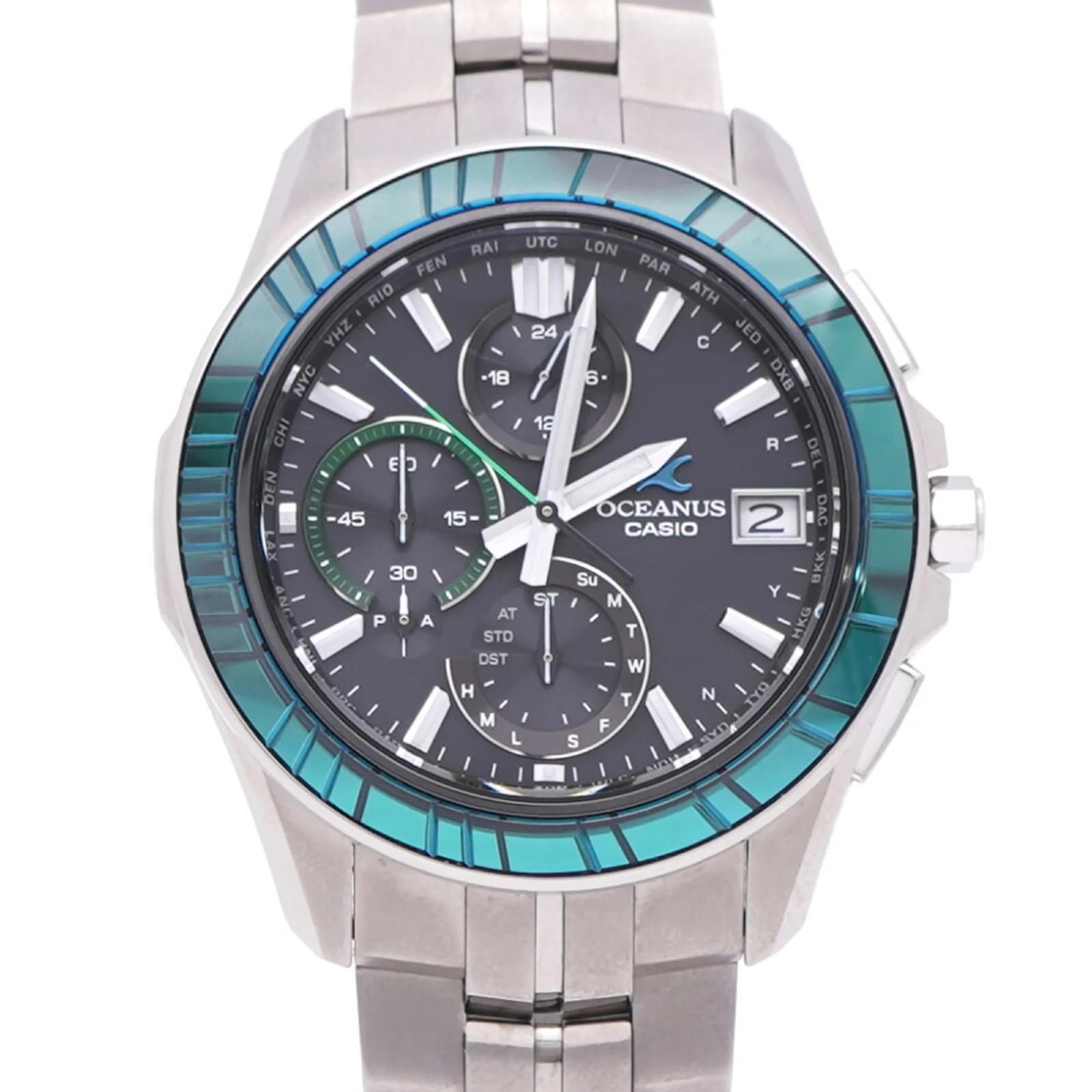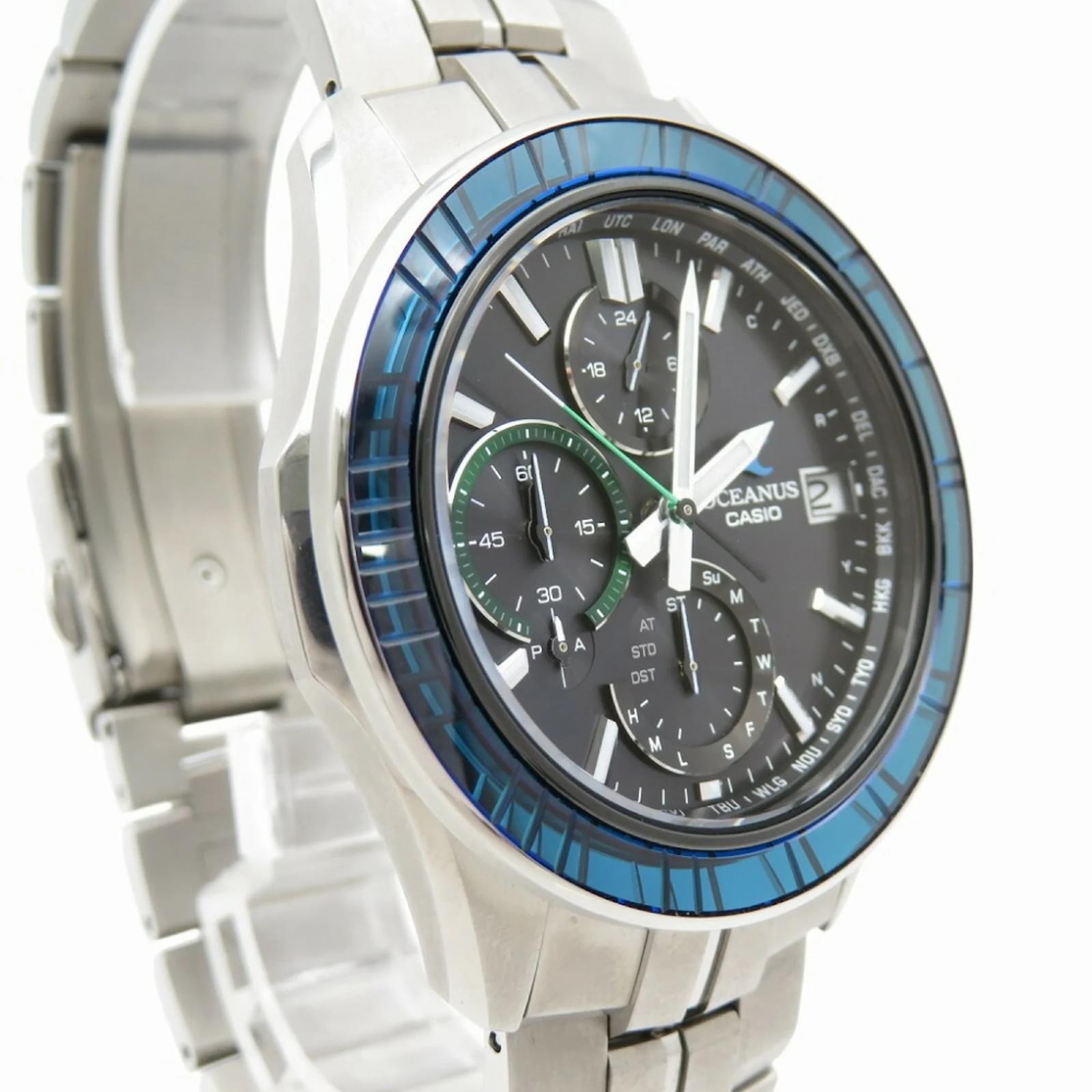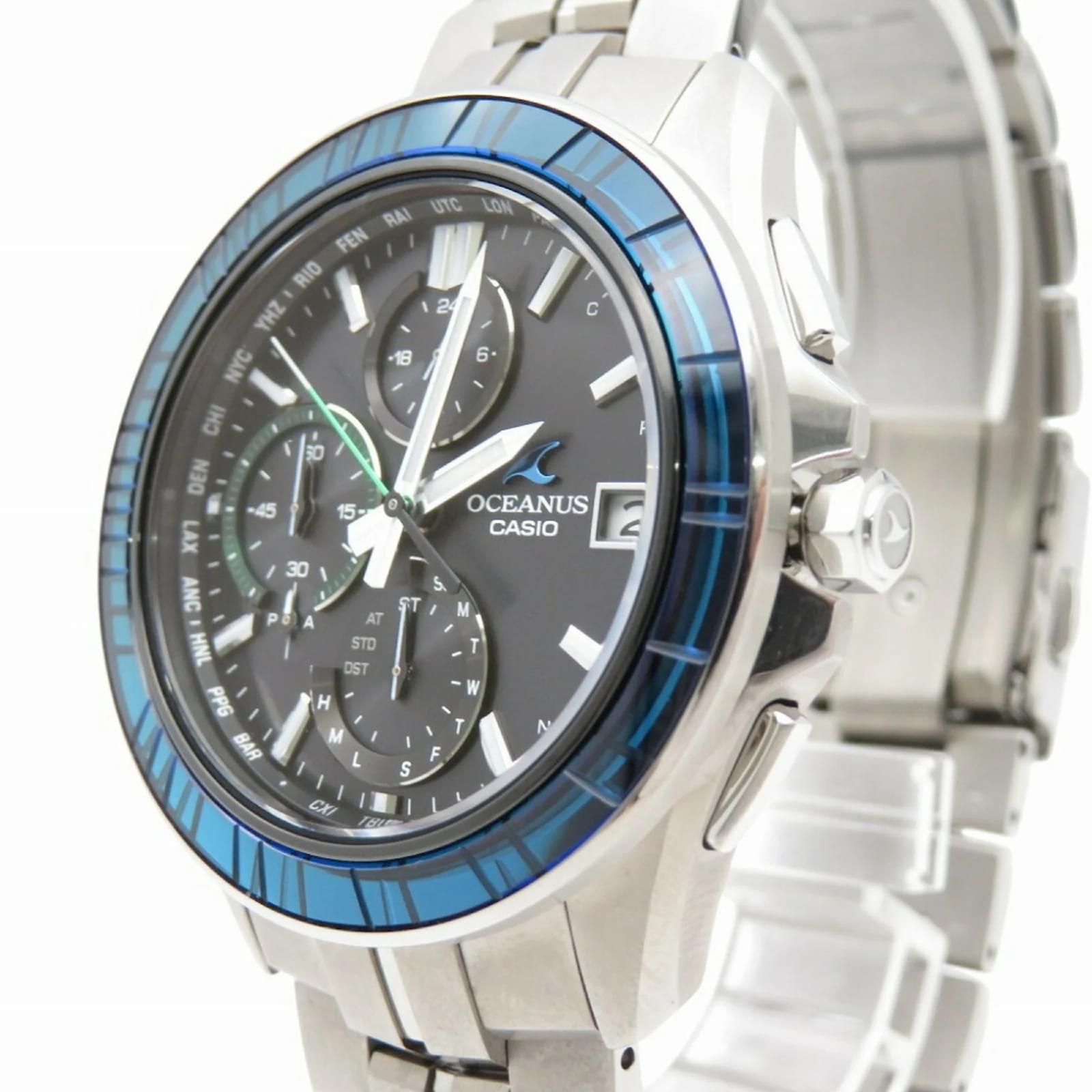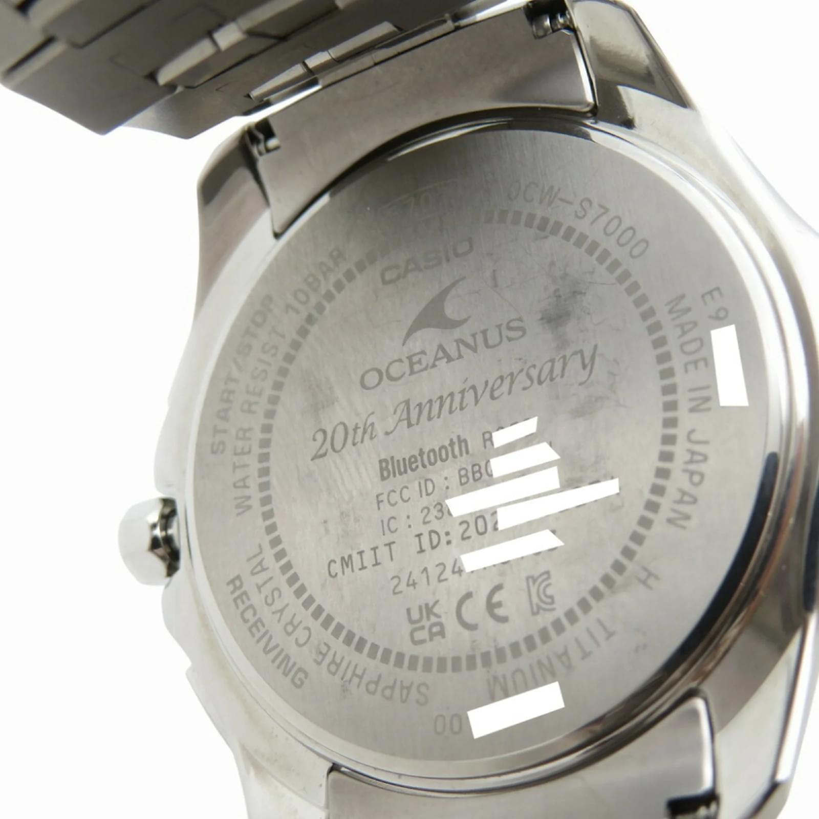 The Casio Oceanus Manta SG-1AJR is a men’s wristwatch that features a titanium case and band, designed for durability and style. This model, celebrating its 20th anniversary, is equipped with a radio wave control solar movement, ensuring accurate timekeeping. \n\nWith a wrist size of 20.5cm (8.07 inches) and a case diameter of 41mm (1.61 inches), it offers a comfortable fit. The watch is in used condition, rated as \”like new,\” with insignificant scratches on the bezel and case, and no visible scratches on the dial or glass. \n\nIncluded with the watch are a guarantee card and both inner and outer boxes. Potential buyers are encouraged to review the images for a detailed view of the item’s condition and included accessories.
