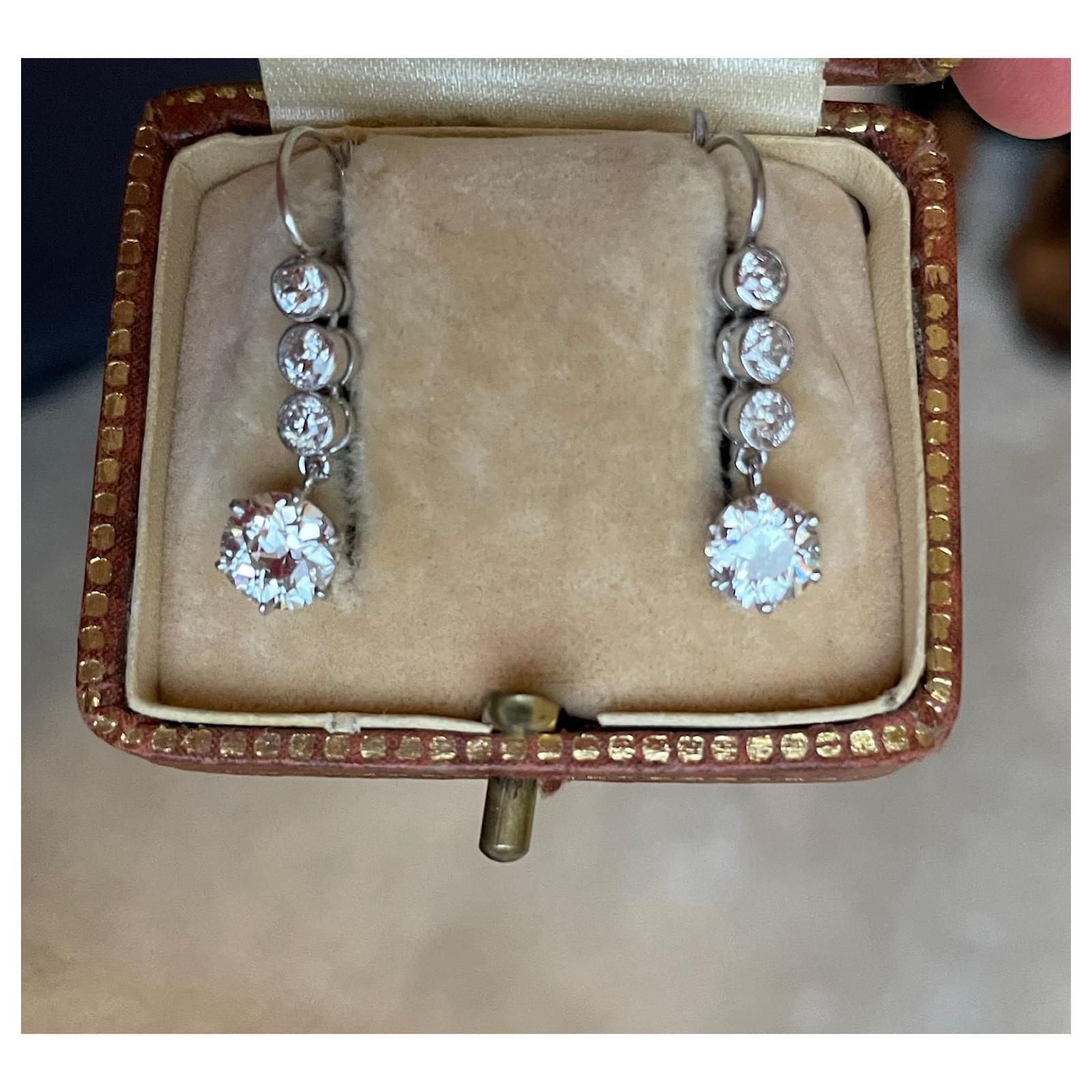 Gorgeous antique 1900s huge diamond earrings sleepers almost 3 carats in total in 18K white gold\r\n\r\nThe biggest diamonds are 1 carat each (transparent VS clarity G color)\r\n\r\nThey are adorned with 3-3 antique rose cut diamonds varying from 0.10-0.15 carat each. \r\n\r\nComes with the original vintage case\r\n\r\nLenght appr 3 cm\r\n\r\nWeight 3 grams \r\n\r\nThe photos are not edited and shown in natural light- it is extra sprakly\r\n\r\nThe quality of the stones are extra rare for this era \r\nVintage French earrings\r\n\r\nRetail value around 40.000€