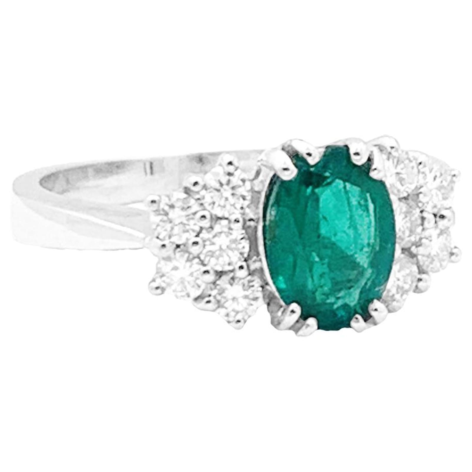 A 750/000 white gold ring set with a faceted oval emerald of 0.86 carats, flanked by ten brilliant-cut diamonds.\nThe emerald comes with a Bellerophon certificate attesting: origin Zambia, minor oiling.