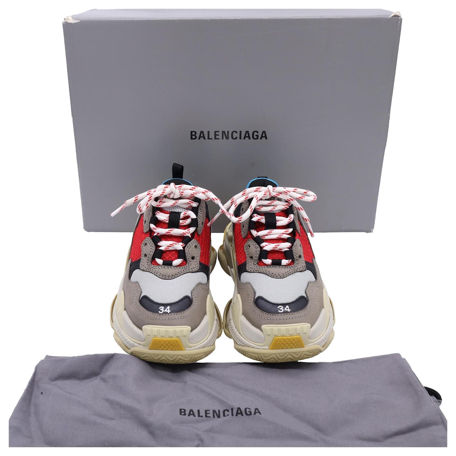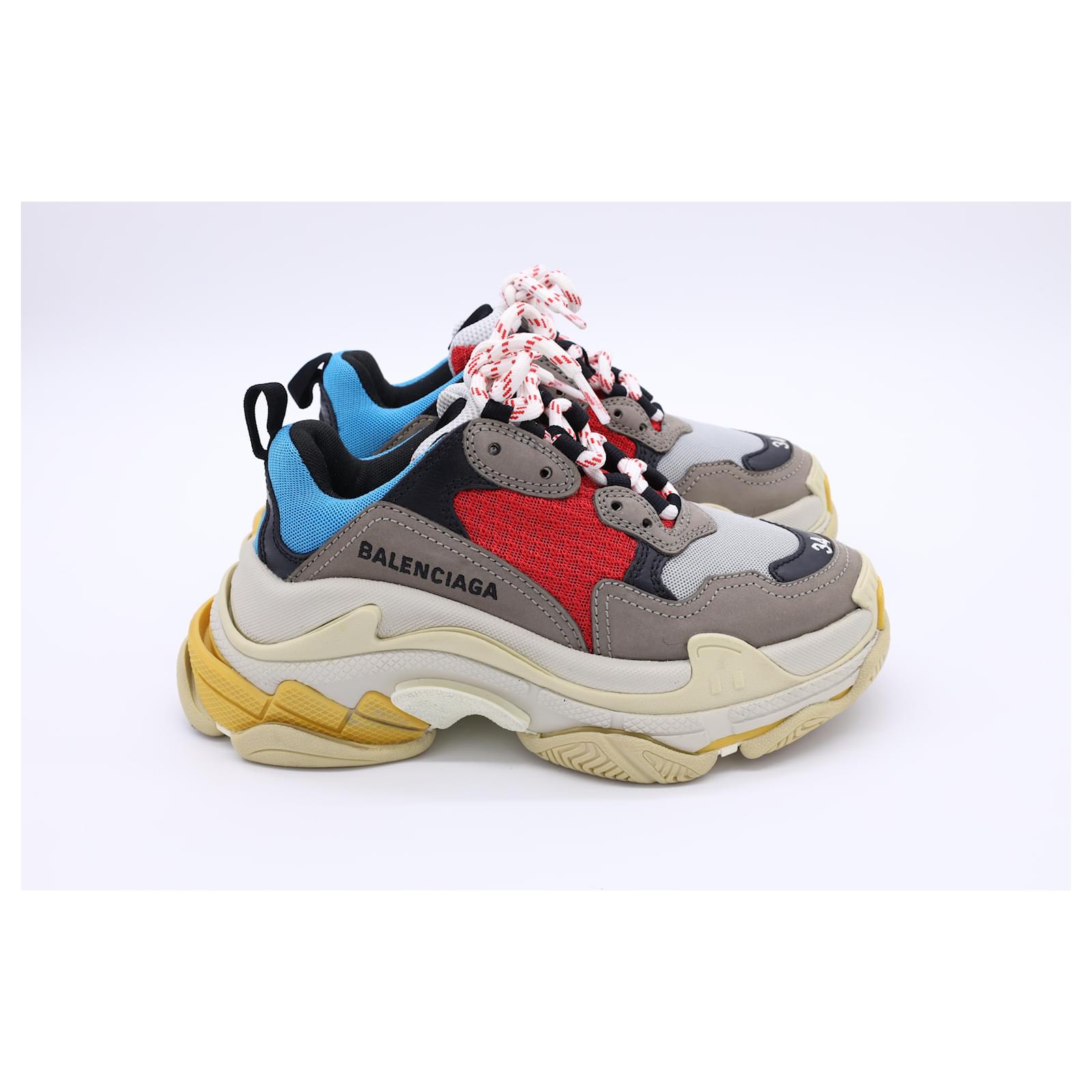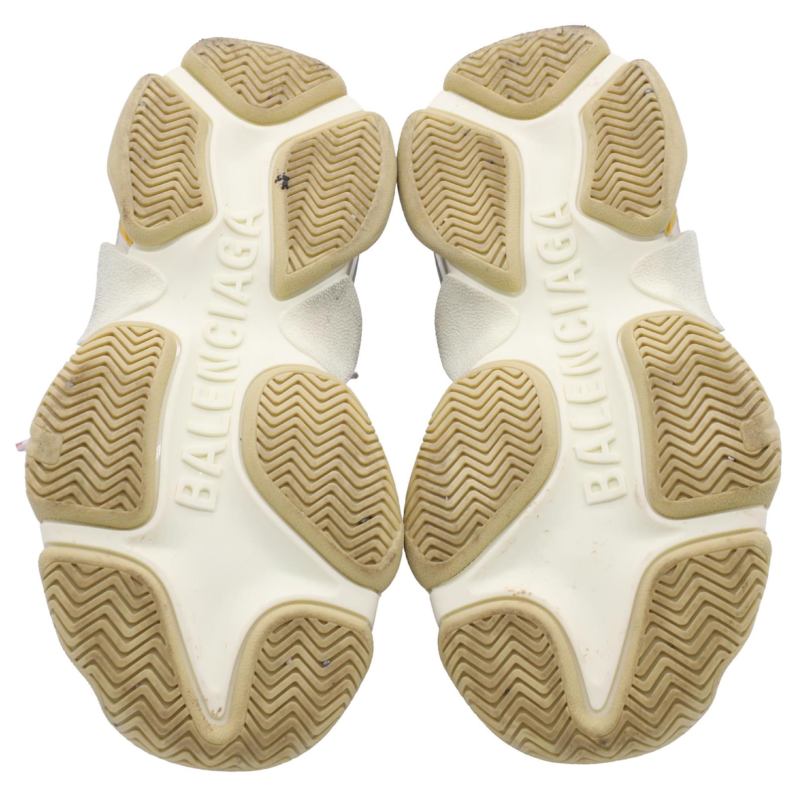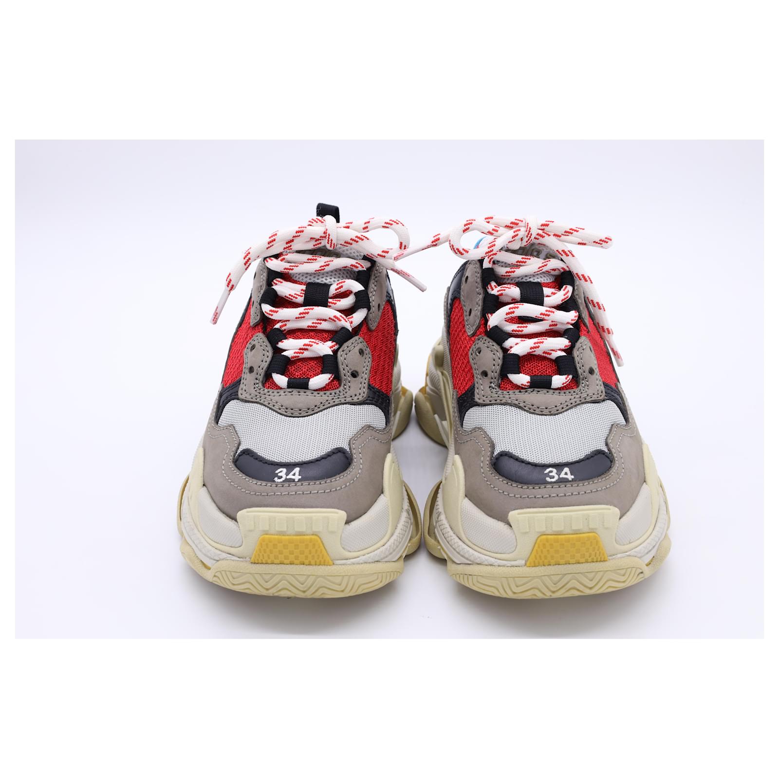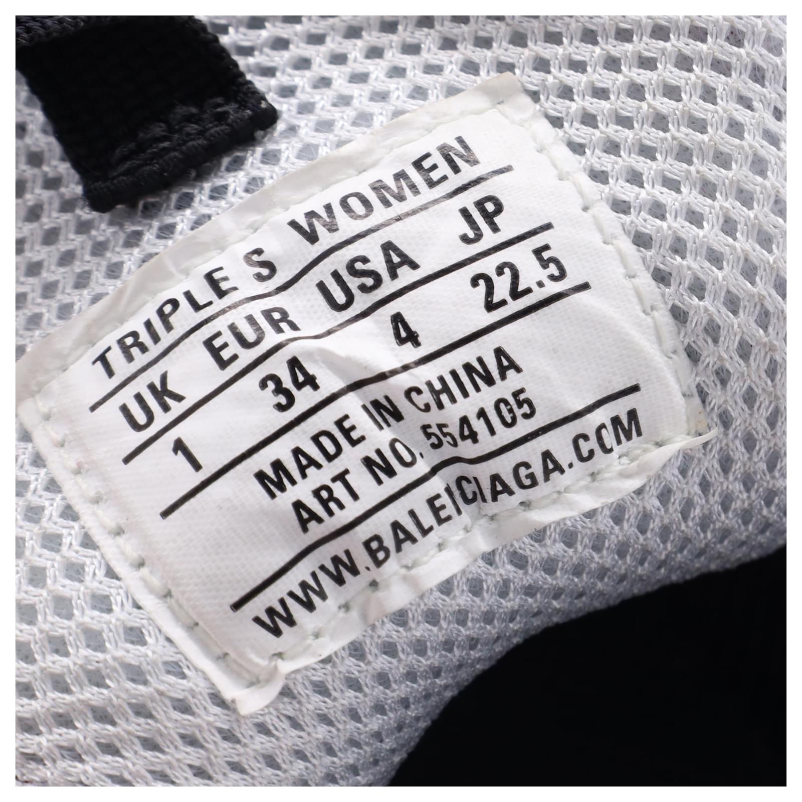 The Balenciaga Triple S Sneakers in multicolor polyester are a bold fusion of retro sportswear and high-fashion innovation, featuring the brand’s iconic layered sole and eye-catching color palette. Designed for maximum impact, these chunky sneakers offer unmatched street-style cred with all-day comfort. **Styling Tip:** Balance their oversized silhouette with slim-fit joggers or a sleek mini skirt to create a striking, fashion-forward contrast.\n\nBalenciaga Triple S Sneakers in Multicolor Polyester\n\nCondition: Very good\nSigns of wear: Minor signs of wear\nPackaging: Box\nColor: Multicolor | multicolor\nMaterial: Polyester\nSize: EU | 34\nMeasurements: Heel height: 65MM; Insole length: 235MM\nSKU: BAPUUSSH500588W \n Product Id: 500588 \n