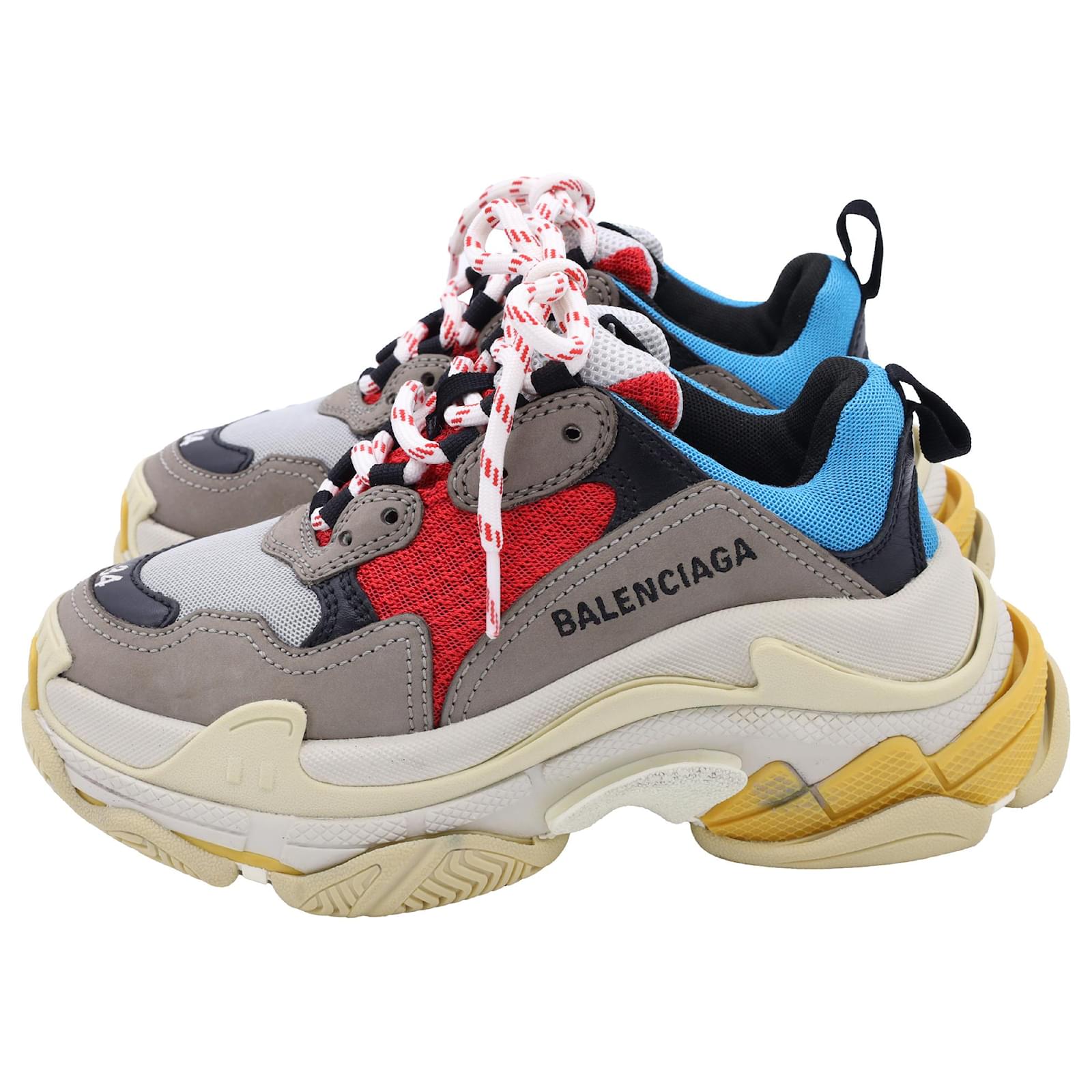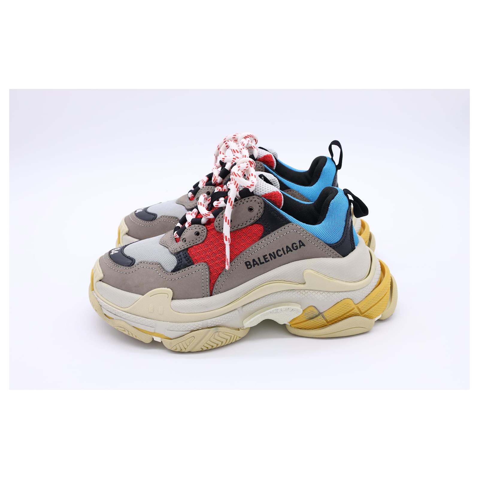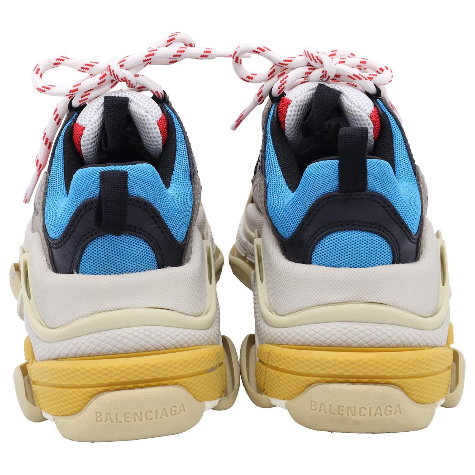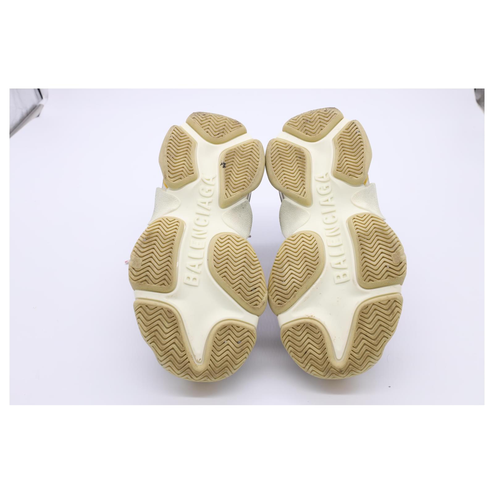 The Balenciaga Triple S Sneakers in multicolor polyester are a bold fusion of retro sportswear and high-fashion innovation, featuring the brand’s iconic layered sole and eye-catching color palette. Designed for maximum impact, these chunky sneakers offer unmatched street-style cred with all-day comfort. **Styling Tip:** Balance their oversized silhouette with slim-fit joggers or a sleek mini skirt to create a striking, fashion-forward contrast.\n\nBalenciaga Triple S Sneakers in Multicolor Polyester\n\nCondition: Very good\nSigns of wear: Minor signs of wear\nPackaging: Box\nColor: Multicolor | multicolor\nMaterial: Polyester\nSize: EU | 34\nMeasurements: Heel height: 65MM; Insole length: 235MM\nSKU: BAPUUSSH500588W \n Product Id: 500588 \n