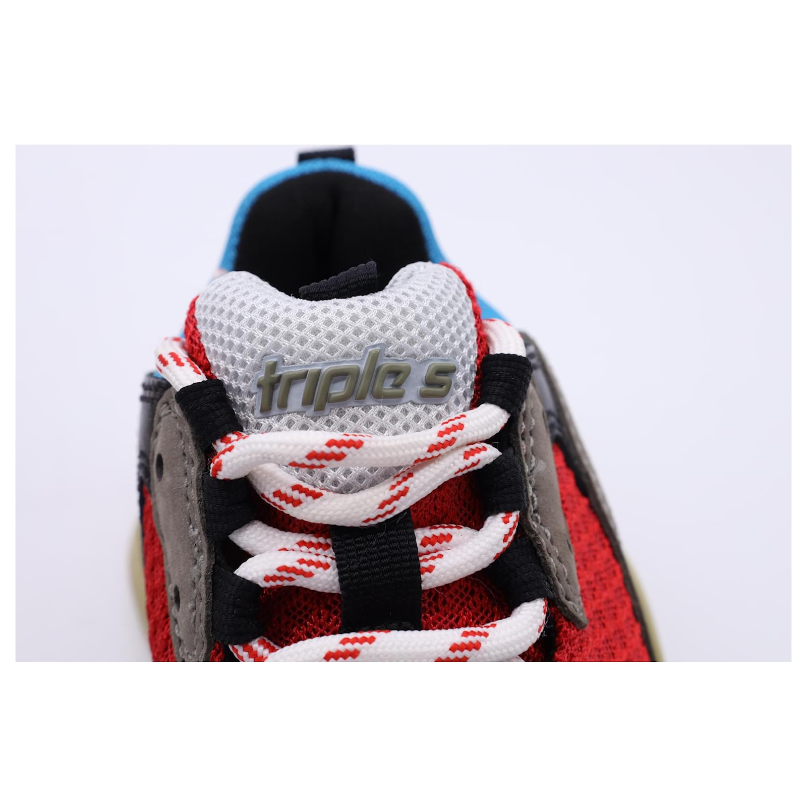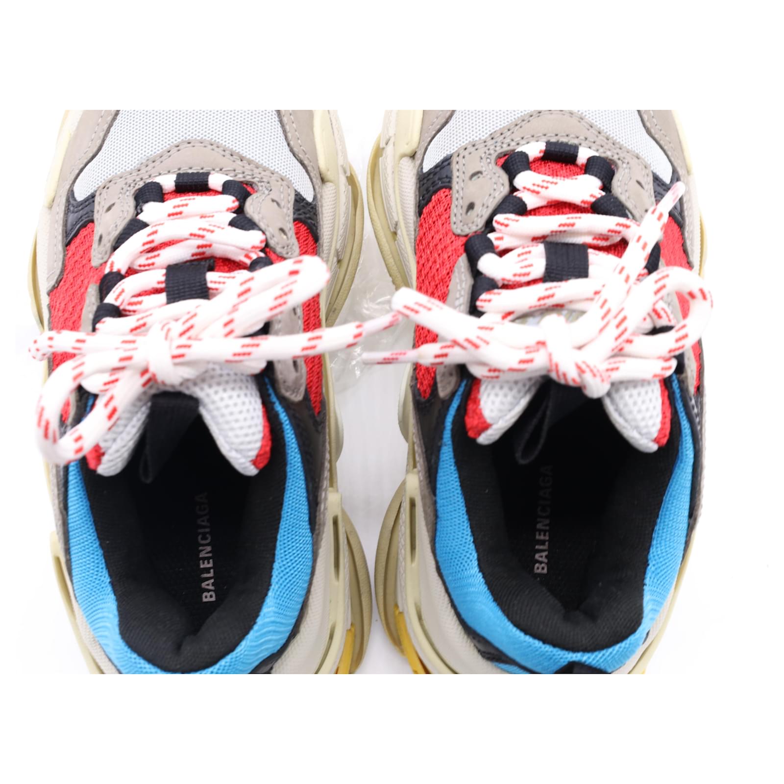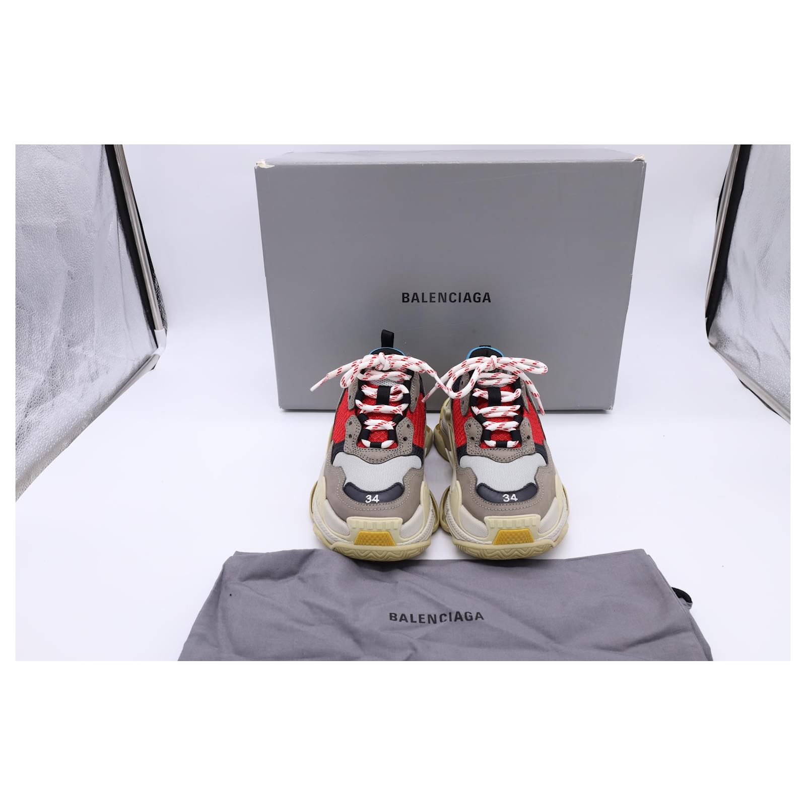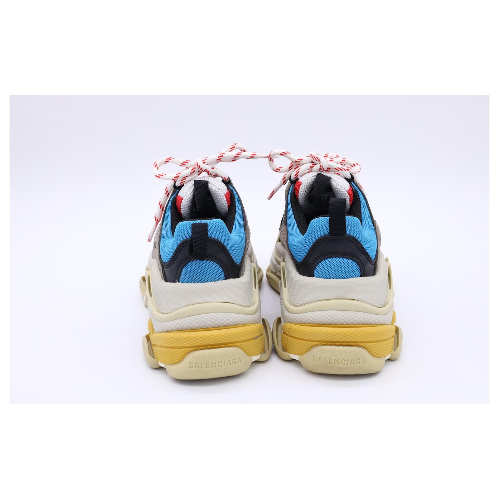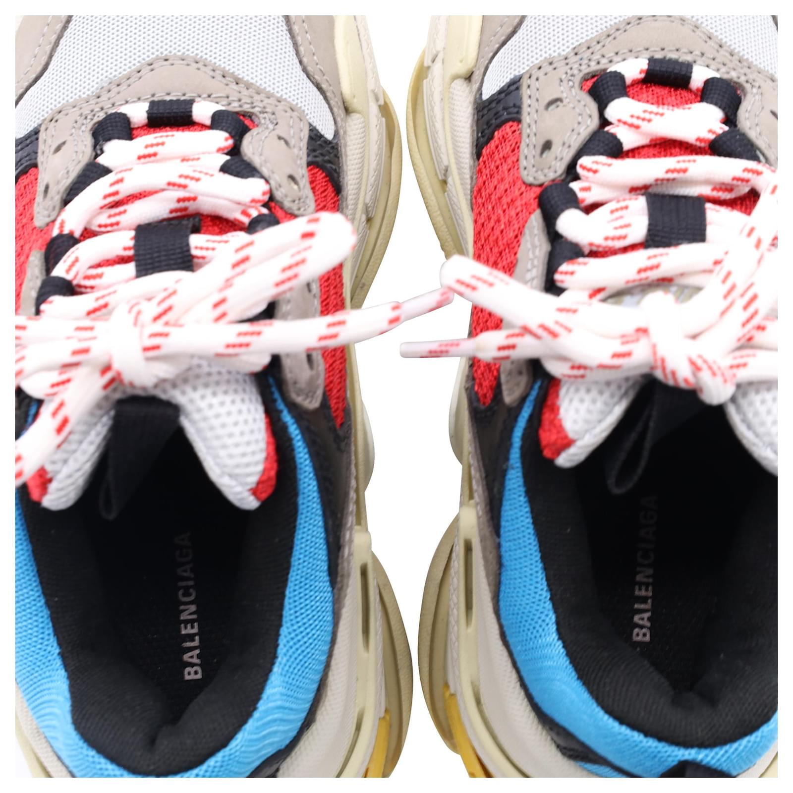 The Balenciaga Triple S Sneakers in multicolor polyester are a bold fusion of retro sportswear and high-fashion innovation, featuring the brand’s iconic layered sole and eye-catching color palette. Designed for maximum impact, these chunky sneakers offer unmatched street-style cred with all-day comfort. **Styling Tip:** Balance their oversized silhouette with slim-fit joggers or a sleek mini skirt to create a striking, fashion-forward contrast.\n\nBalenciaga Triple S Sneakers in Multicolor Polyester\n\nCondition: Very good\nSigns of wear: Minor signs of wear\nPackaging: Box\nColor: Multicolor | multicolor\nMaterial: Polyester\nSize: EU | 34\nMeasurements: Heel height: 65MM; Insole length: 235MM\nSKU: BAPUUSSH500588W \n Product Id: 500588 \n