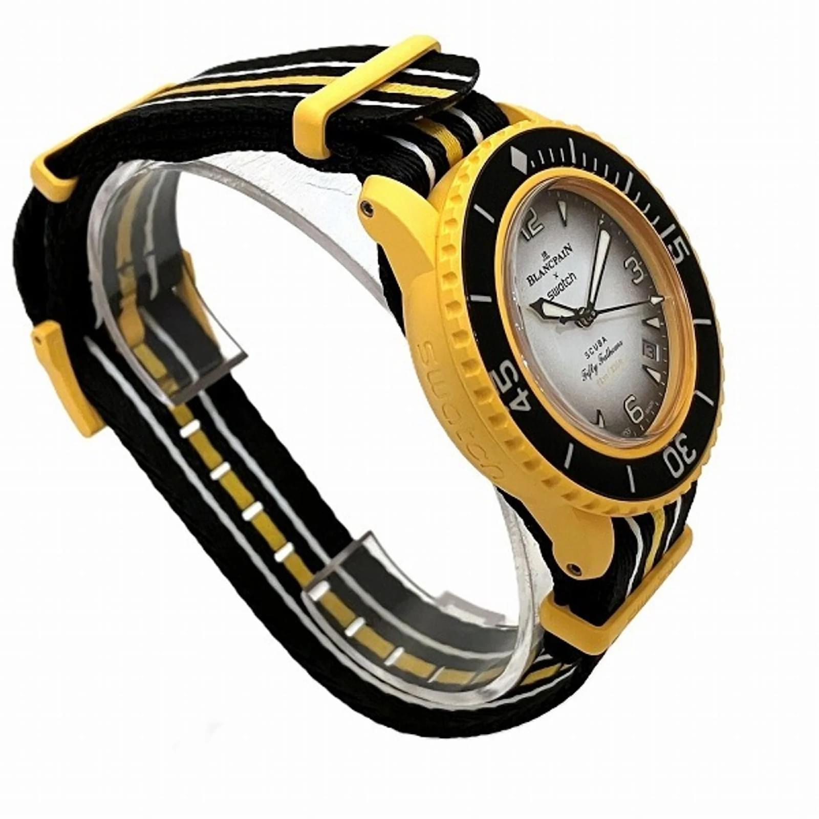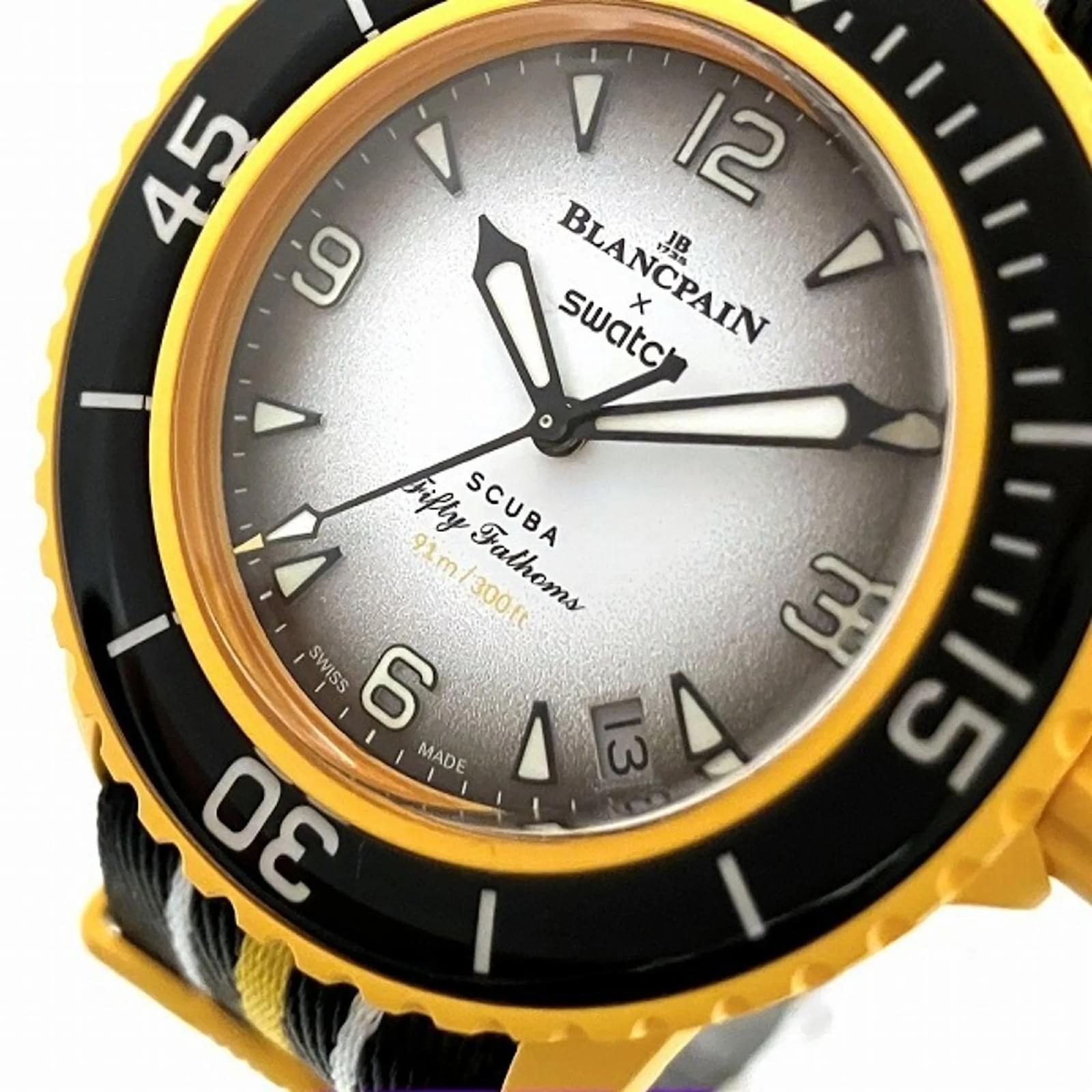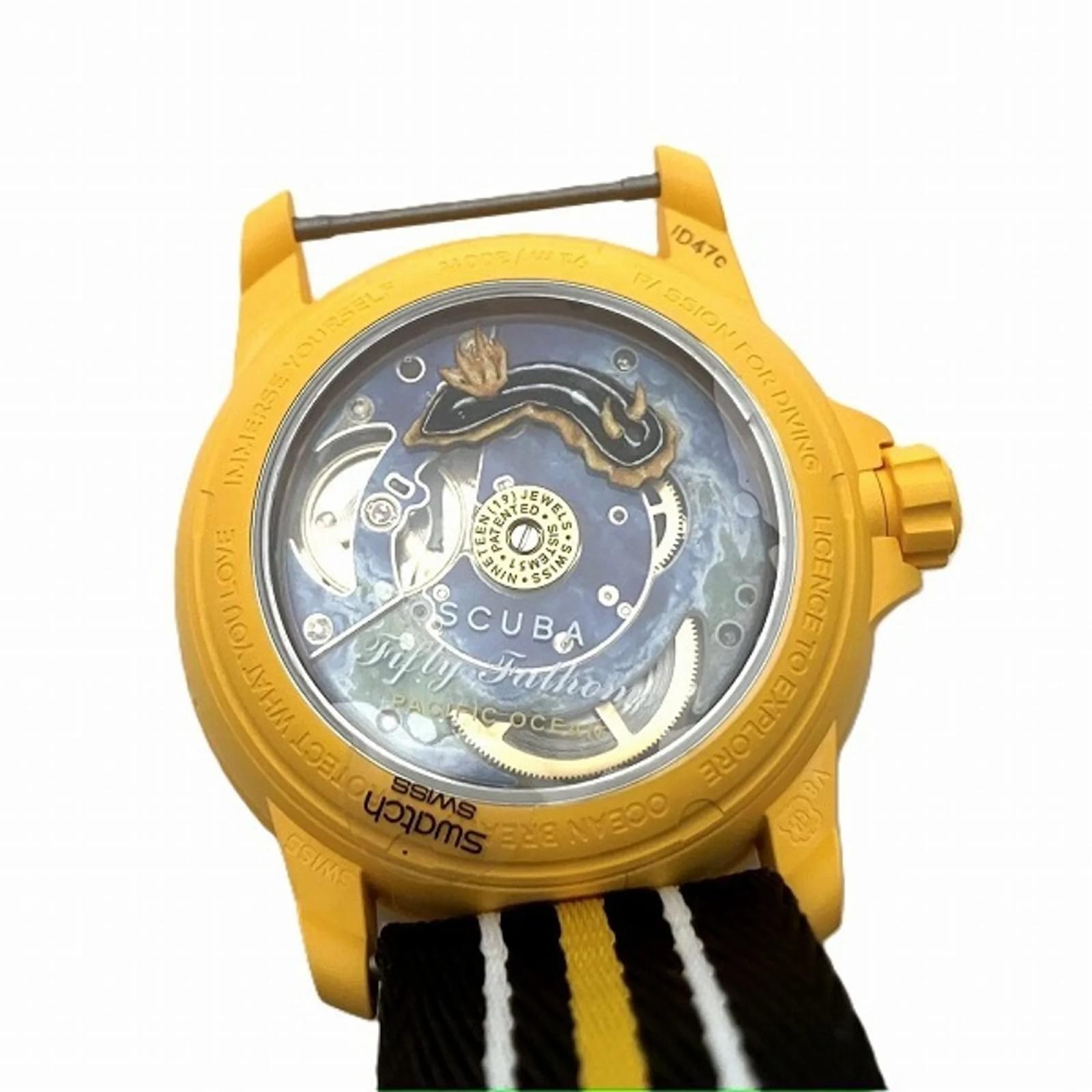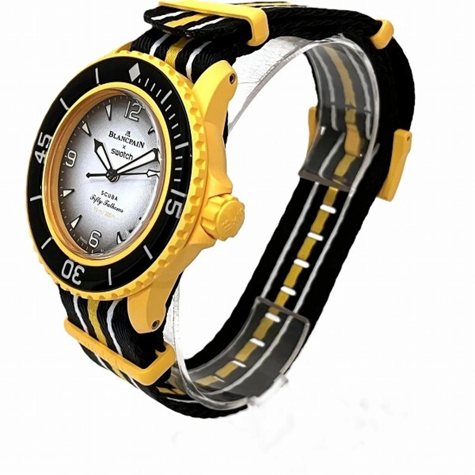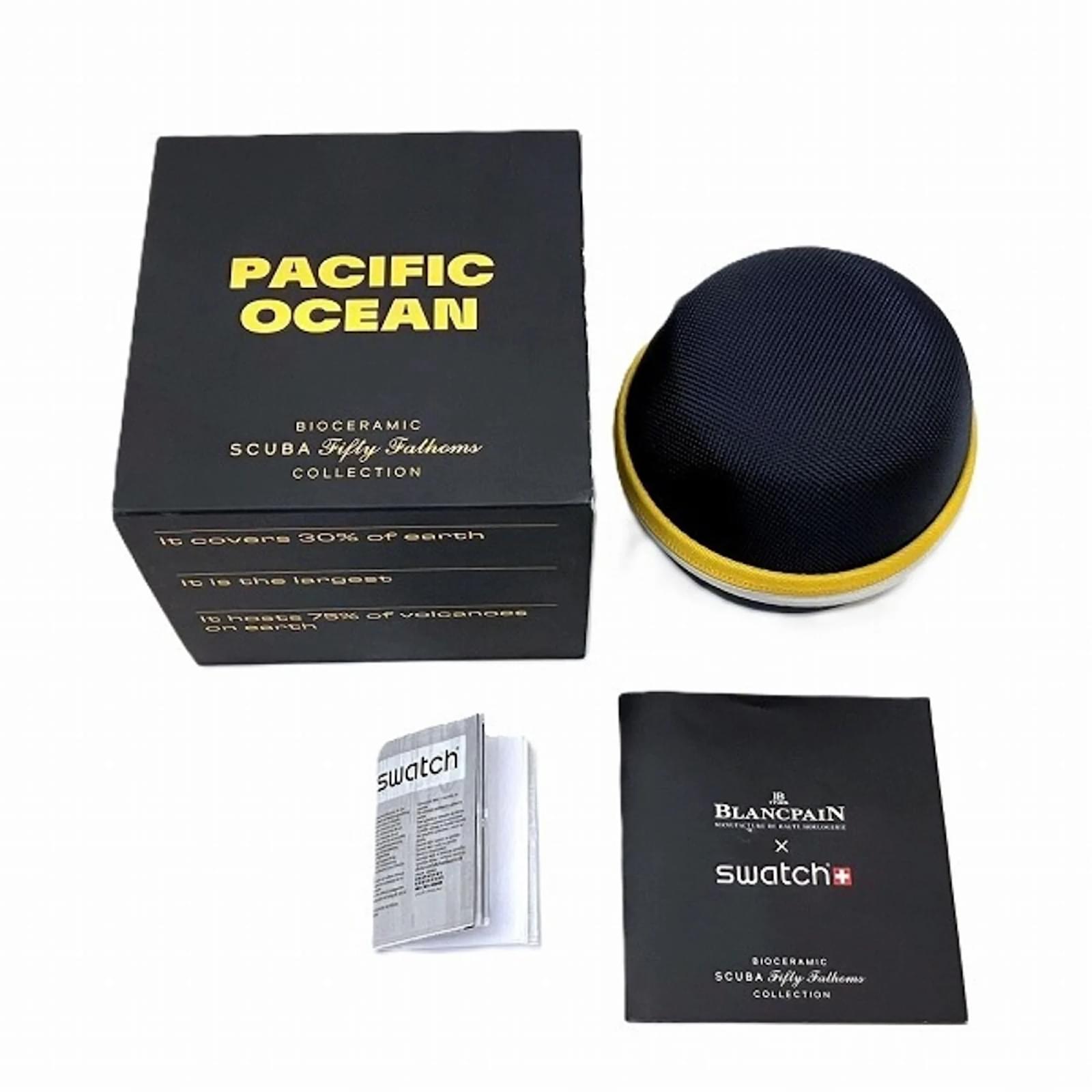 The Blancpain Swatch Pacific Ocean S035P100 is a men’s wristwatch featuring a black ceramic case and band, designed for an analog display. This self-winding automatic watch has a case diameter of 42.1mm and accommodates wrist sizes ranging from 12cm to 27cm. \n\nThis pre-owned timepiece is classified as being in acceptable condition, with slight scratches on the bezel and glass, and insignificant wear on the case and dial. The watch comes with a booklet, inner box, manual, and outer box. Potential buyers are encouraged to review the provided images for a detailed view of the watch’s condition and included accessories.