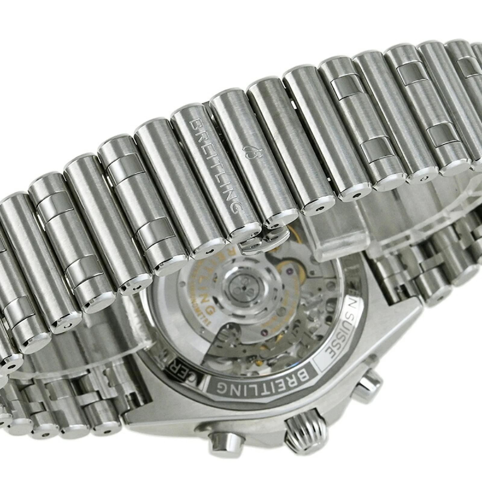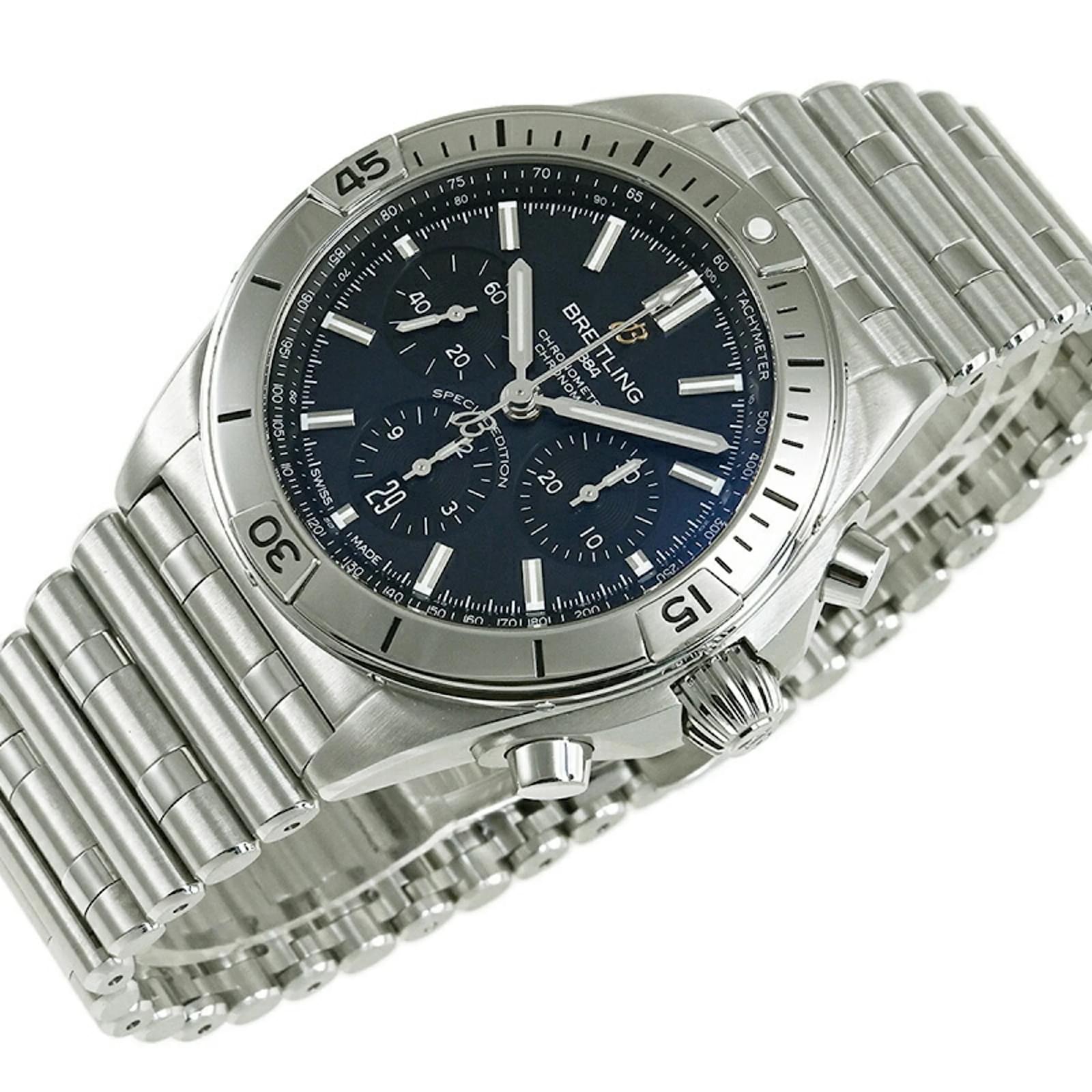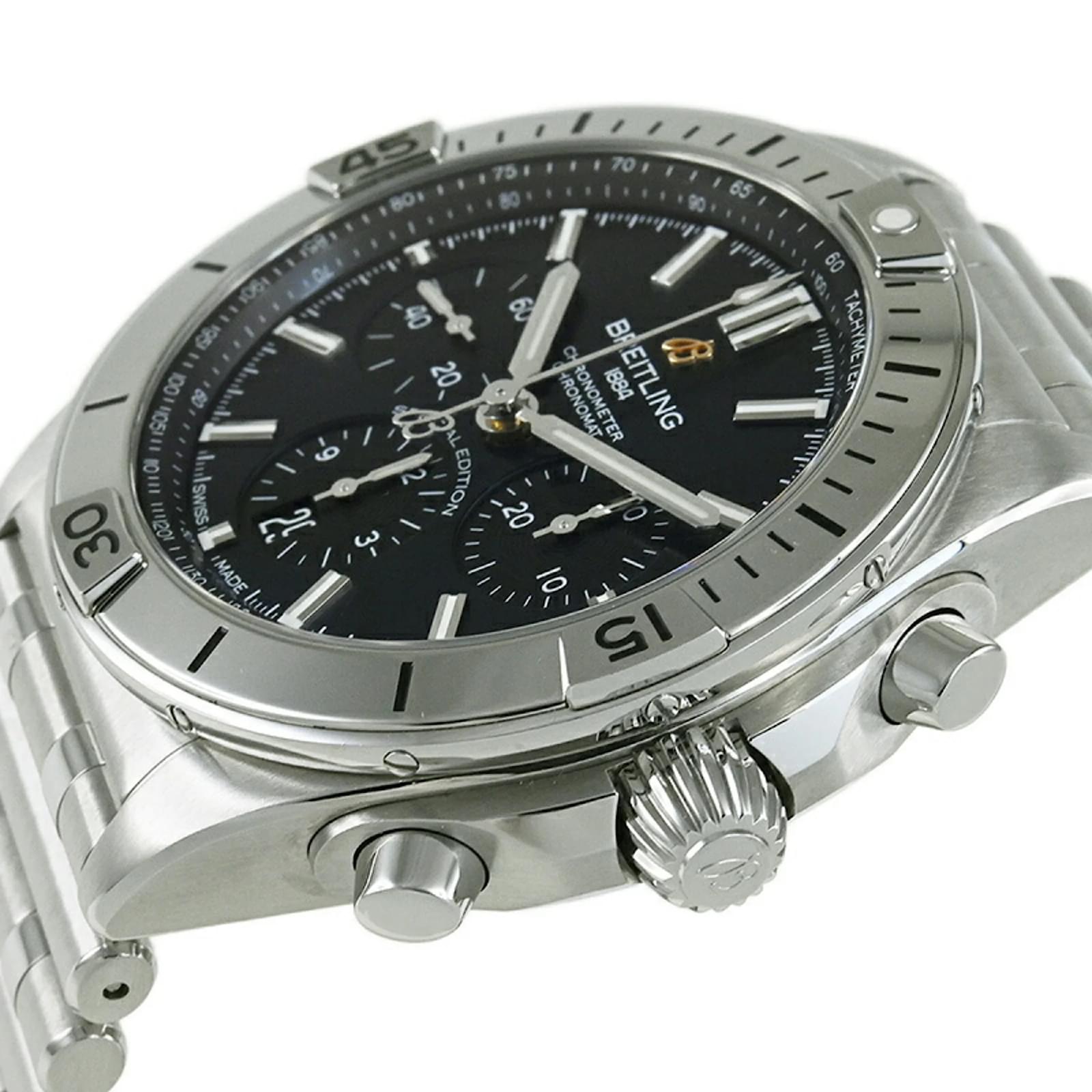 The Breitling Chronomat B01 42 Japan Edition Watch, model AB0134101B3A1, features a black shell dial and is crafted from stainless steel for both the case and band. This self-winding automatic timepiece has a case diameter of 42mm and a thickness of 15mm, suitable for a wrist size of 20.5cm (8.07 inches). It offers water resistance up to 200 meters (656.16 feet), making it a practical choice for various activities. \n\nThis used watch is in good condition, classified as Rank B, indicating some traces of usage, including visible damages or dirt, yet remains acceptable for continued use. The purchase includes a certificate and both inner and outer boxes. Prospective buyers are encouraged to review the images for a clear understanding of the item’s condition and included accessories.