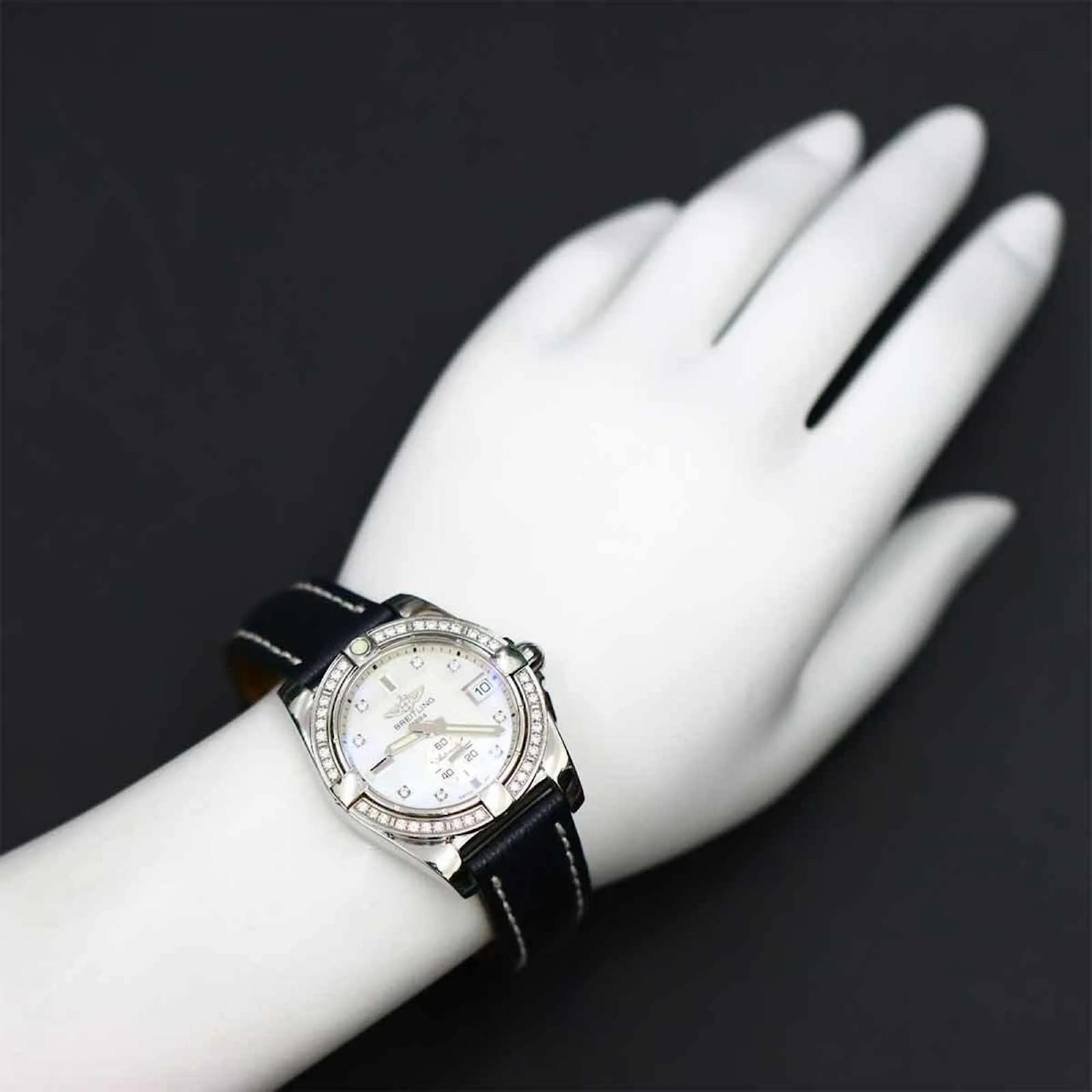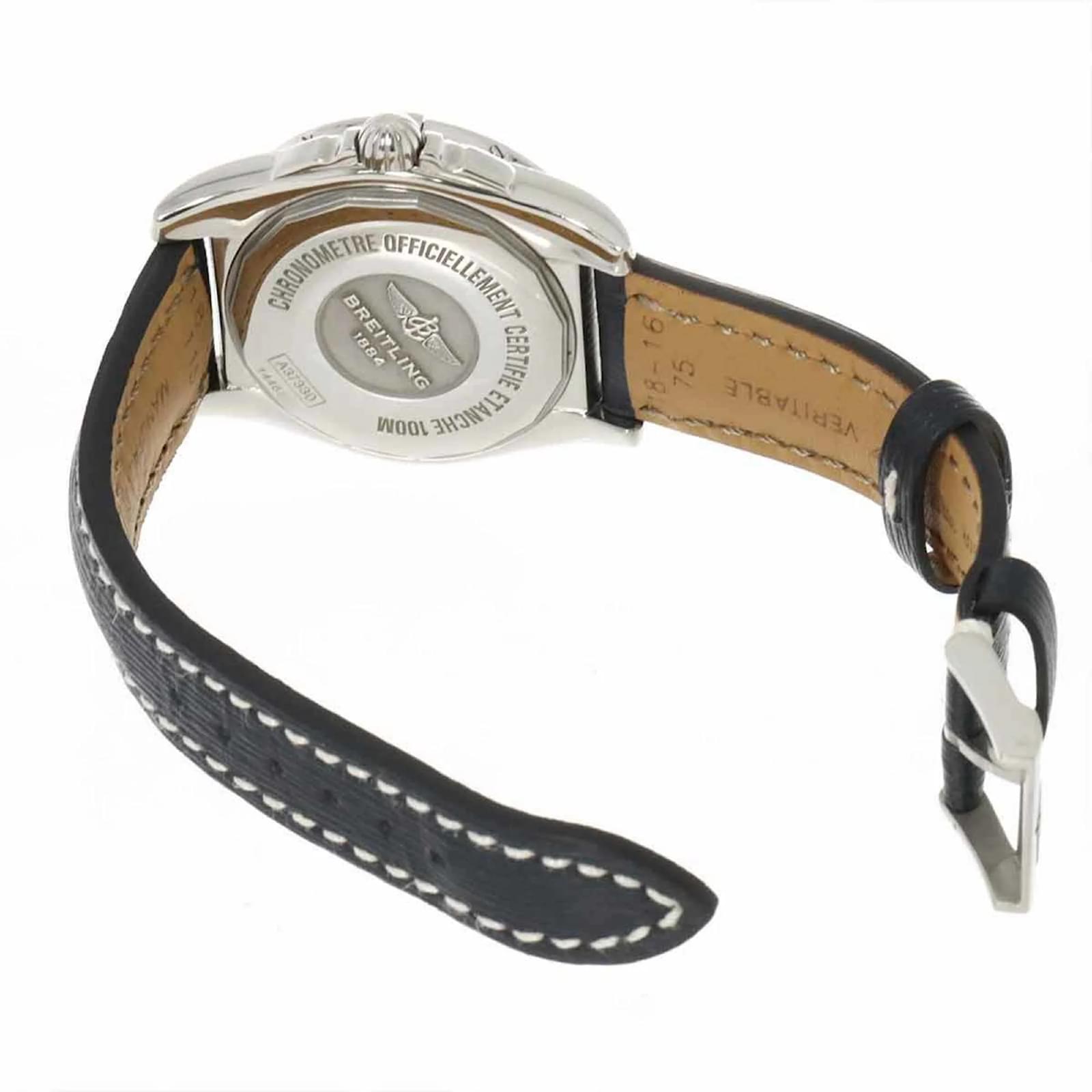 The Breitling Galactic 36 A37330 8P is a wristwatch designed for those who appreciate fine craftsmanship. It features a white shell dial and a stainless steel case, complemented by a leather band. The watch operates on a self-winding automatic movement, ensuring reliable timekeeping. \n\nWith a case diameter of 36mm and suitable for wrist sizes ranging from 14.5cm to 18cm (5.7” to 7.08”), it offers a comfortable fit. This particular model is in used condition, described as like new, with insignificant scratches on the bezel, case, and bracelet, and no visible scratches on the dial or glass. \n\nIncluded with the watch are a certificate, inner box, manual, and outer box. Potential buyers are encouraged to review the images for a detailed view of the item’s condition and included accessories.