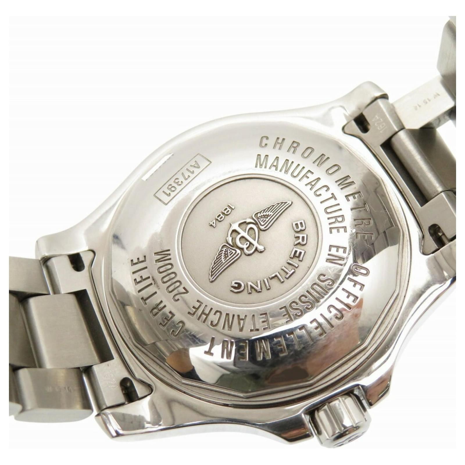 The Breitling Superocean 44 A17391 is a men’s wristwatch featuring a black dial and a robust stainless steel case and band. This automatic watch operates on a self-winding movement, ensuring reliable timekeeping. It has a case diameter of 44mm and is suitable for a wrist size of 19cm (7.48 inches). \n\nThis pre-owned timepiece is in good condition, with slight scratches on the bezel, case, and band, while the glass and dial show insignificant signs of wear. The watch is sold without accessories, and potential buyers are encouraged to review the provided images for a detailed view of its condition.