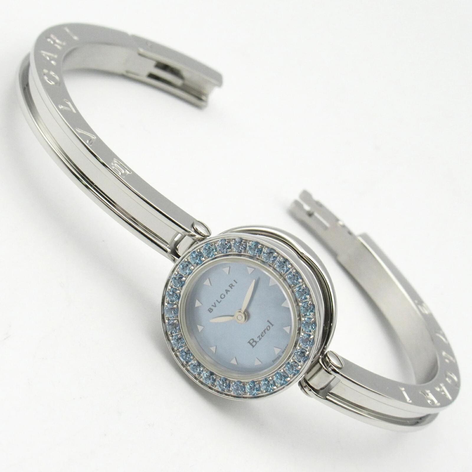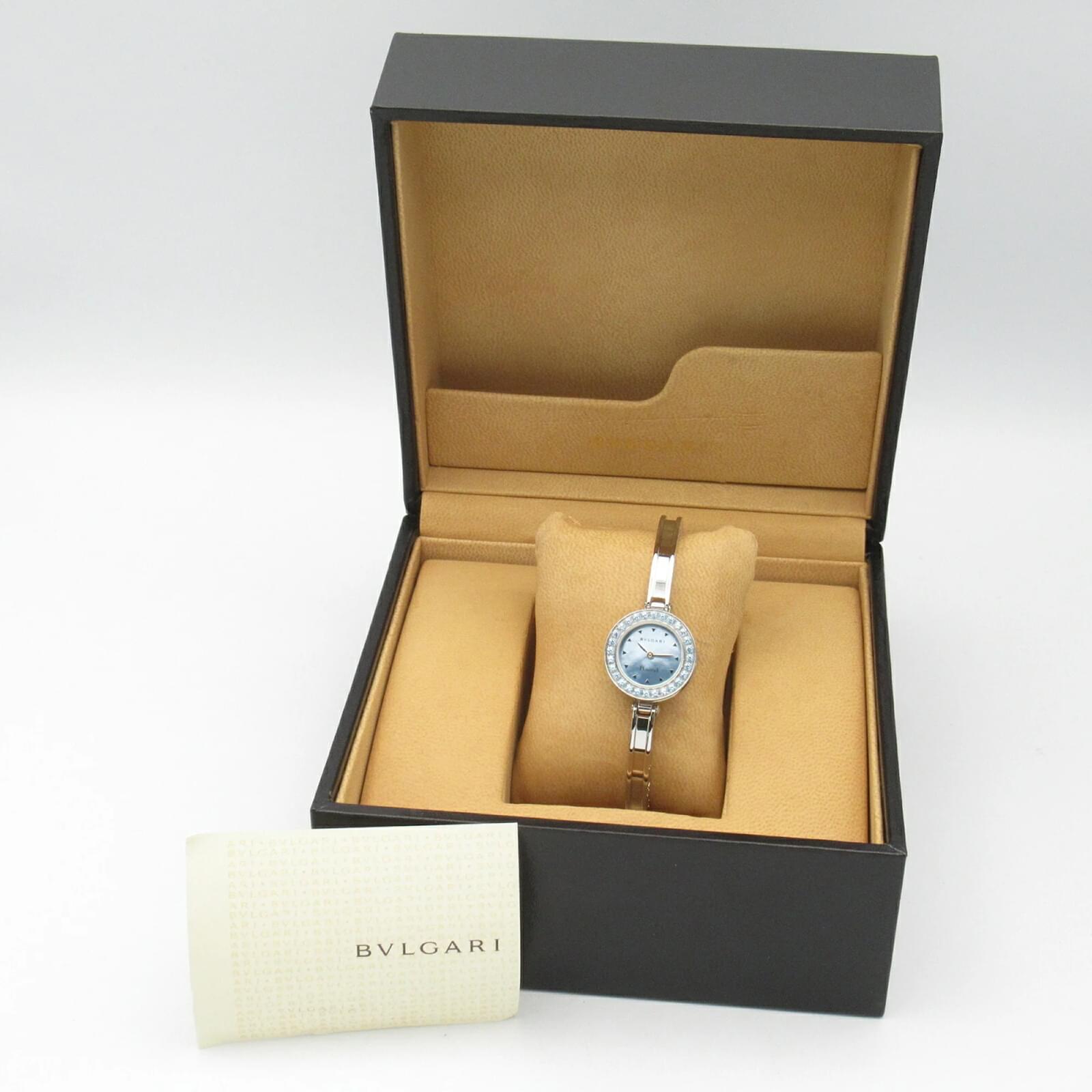 The Bvlgari B-zero1 Bangle Watch is a stylish wristwatch designed for ladies, featuring a blue shell dial that adds a touch of elegance. The watch is crafted from stainless steel, both in the case and the band, ensuring durability and a sleek appearance. It operates on a reliable quartz movement and is suitable for a wrist size of 16cm (6.29 inches) with a case diameter of 22mm (0.87 inches). \n\nThis particular watch is in very good used condition, with insignificant scratches on the bezel, case, and crown, and no visible scratches on the dial or glass. The battery has been replaced, and the watch has been polished for a refreshed look. Included with the watch is its inner box, and potential buyers are encouraged to review the images for a detailed view of the item’s condition. \n\nOverall, the Bvlgari B-zero1 Bangle Watch combines functionality with a refined aesthetic, making it a noteworthy addition to any collection.