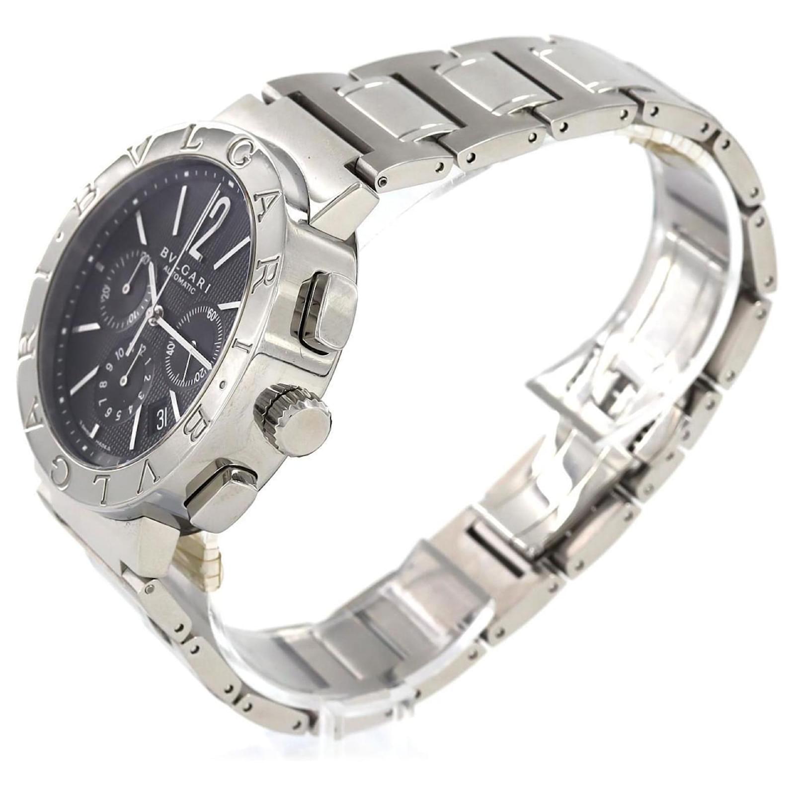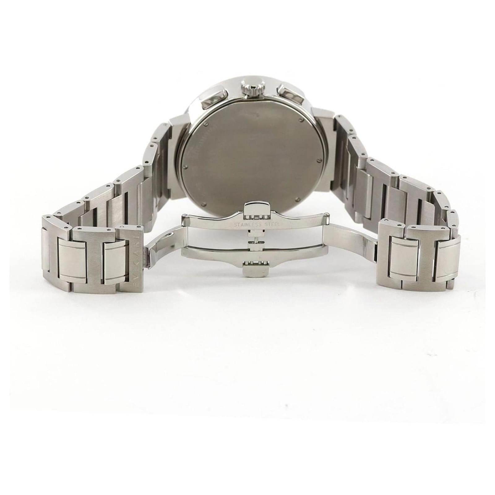 The Bvlgari Chronograph BB42SSCH is a sophisticated wristwatch featuring a black dial and a stainless steel case and band. This self-winding automatic timepiece has a case diameter of 42mm and is designed to fit a wrist size of 19.5cm (7.67 inches). \n\nThis used watch is in very good condition, with insignificant scratches on the bezel, case, and bracelet, while the dial and glass remain free of any scratches. It comes with its inner and outer boxes, as well as a warranty. Potential buyers are encouraged to review the provided images for a detailed view of the watch’s condition and included accessories.