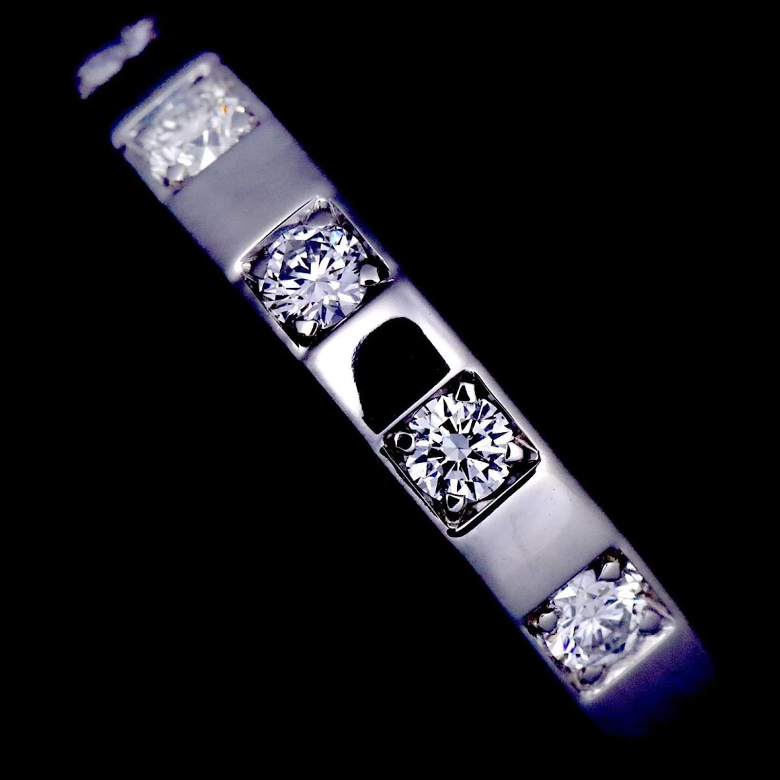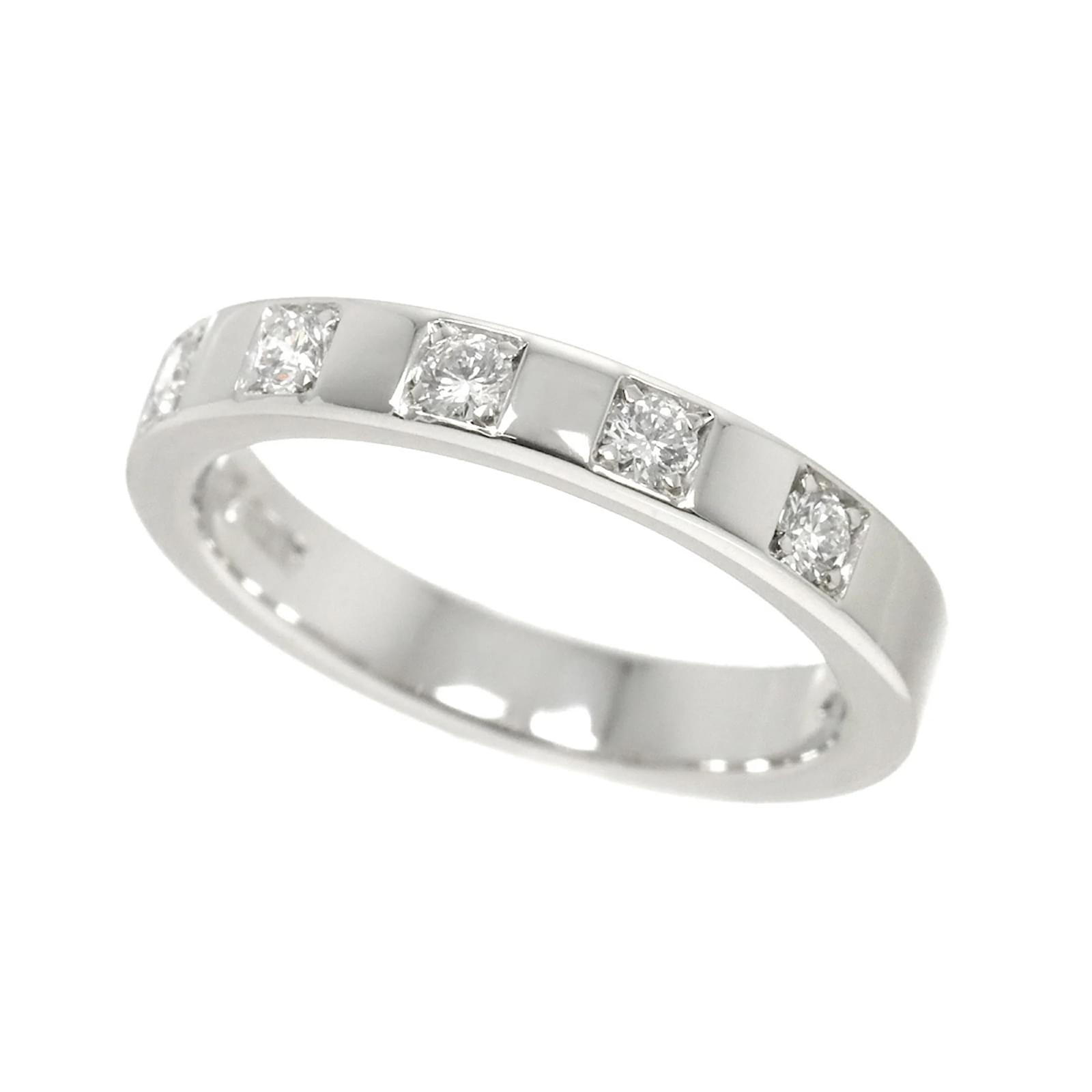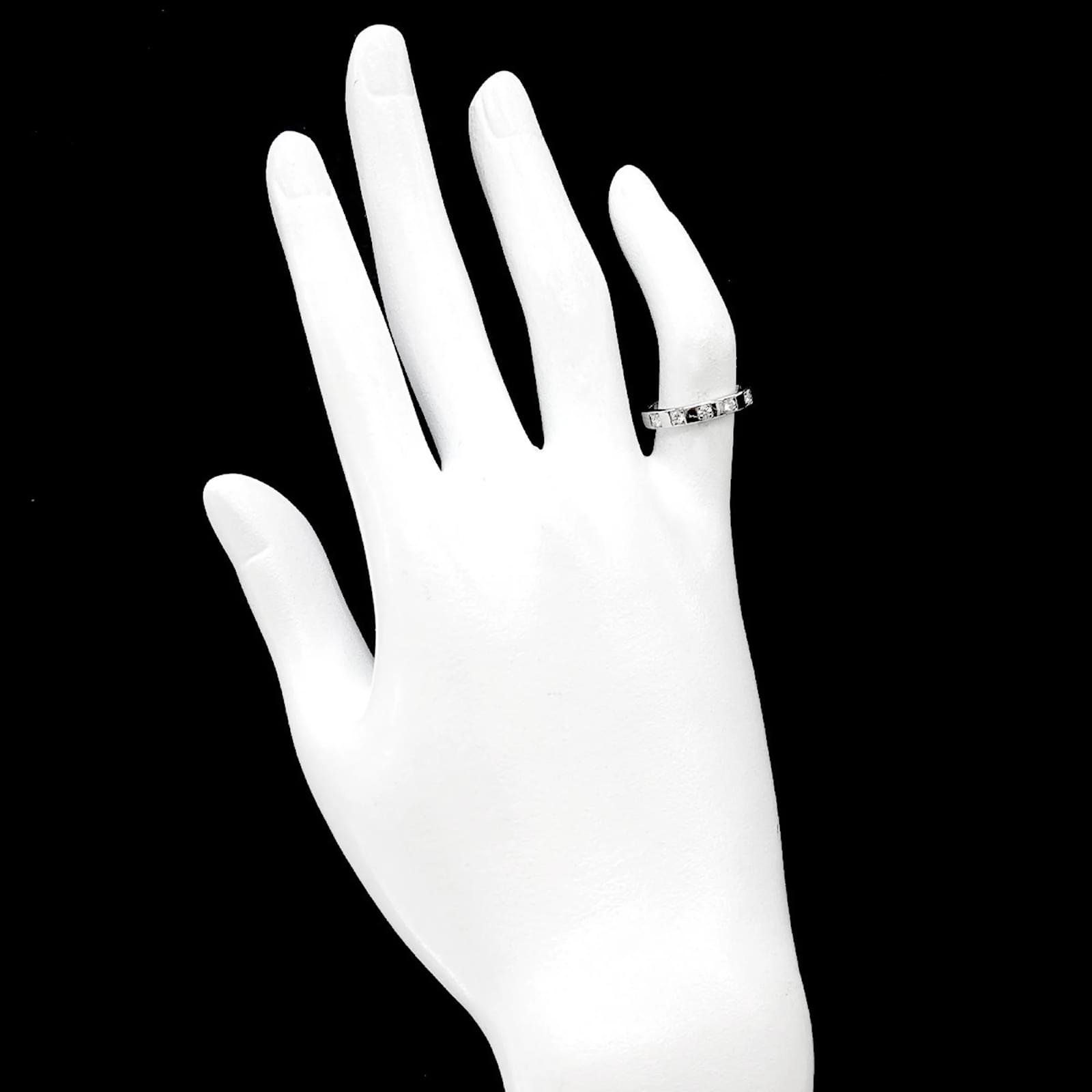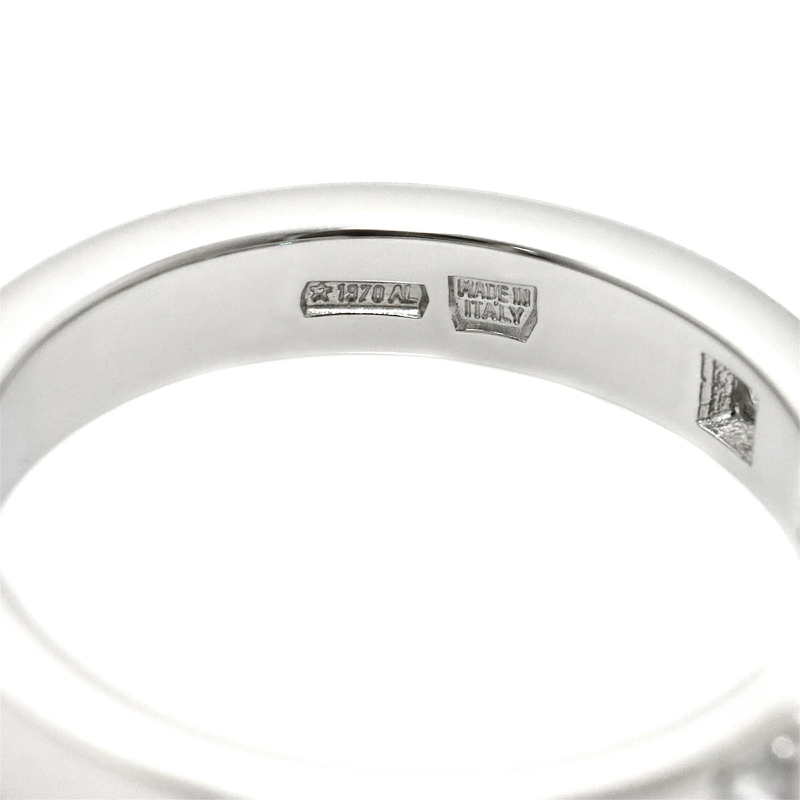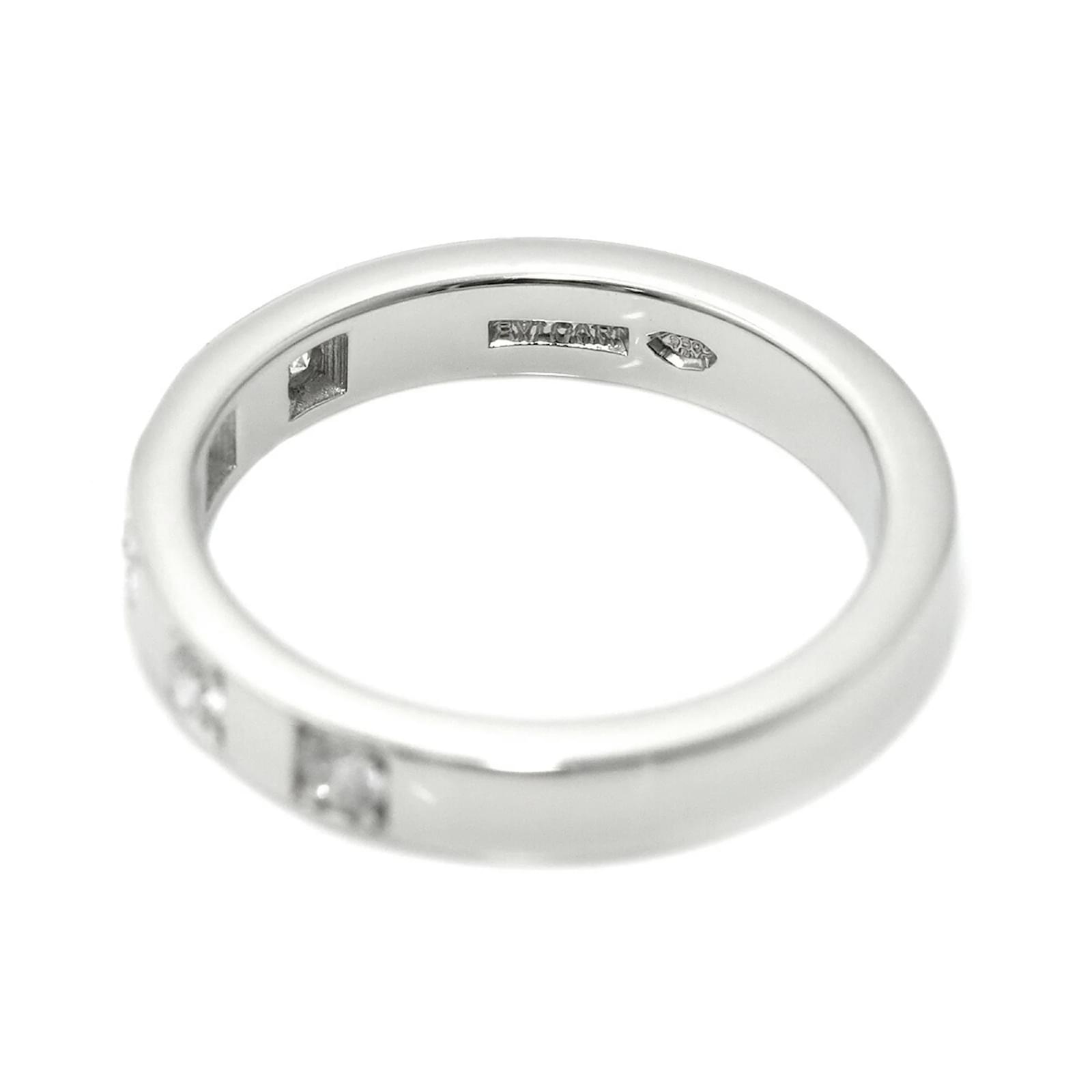 The Bvlgari Marry Me Ring is a sophisticated band ring crafted from Platinum 950, featuring a total diamond weight of 0.17 carats. This elegant piece is designed in a platinum color and is available in a US size 4, equivalent to a JP size 7. \n\nThis ring is classified as used but is in like-new condition, with insignificant traces of use, scratches, and dirt. It has been polished for maintenance. Please note that no additional accessories are included with the purchase. For a detailed view of the item’s condition, it is recommended to refer to the provided images.