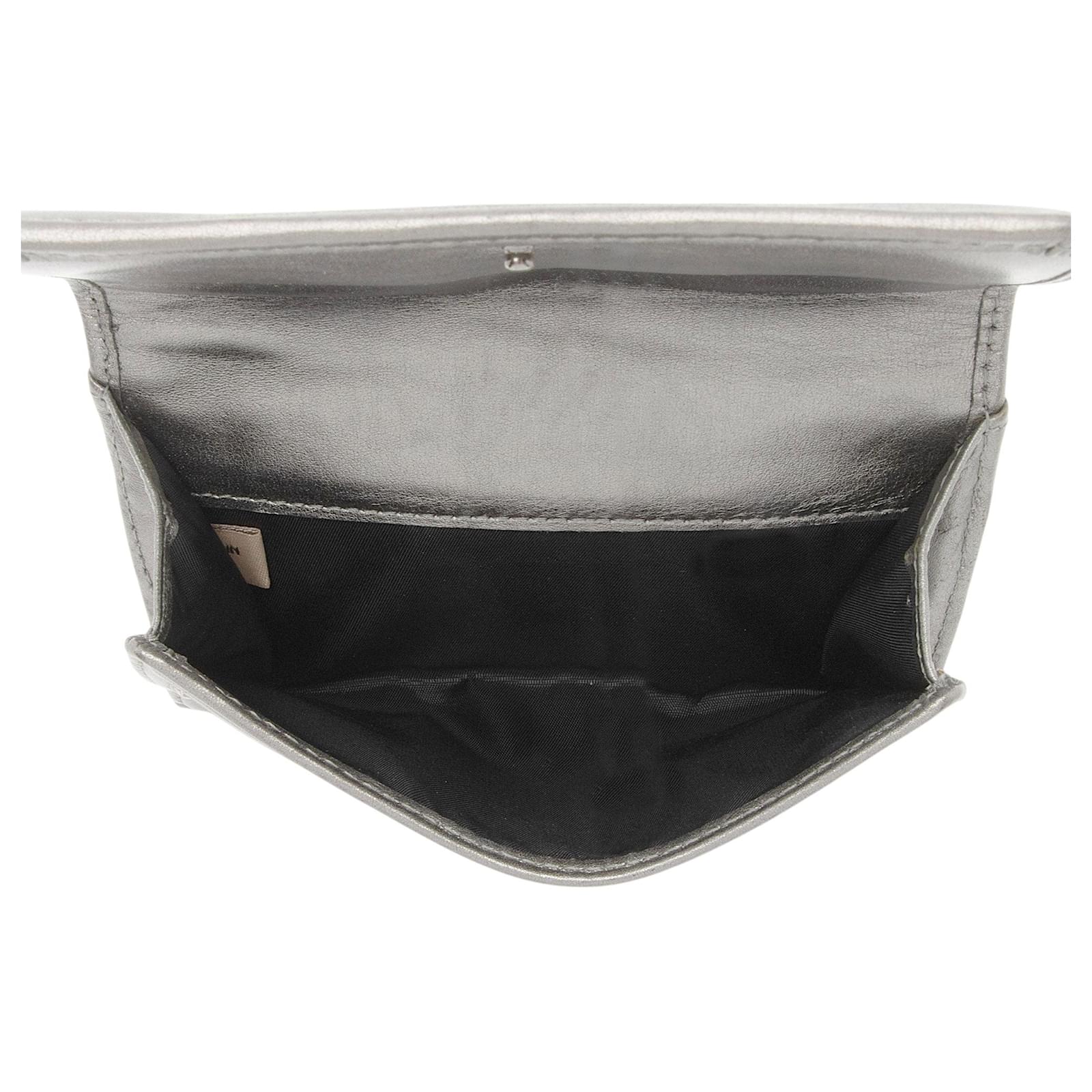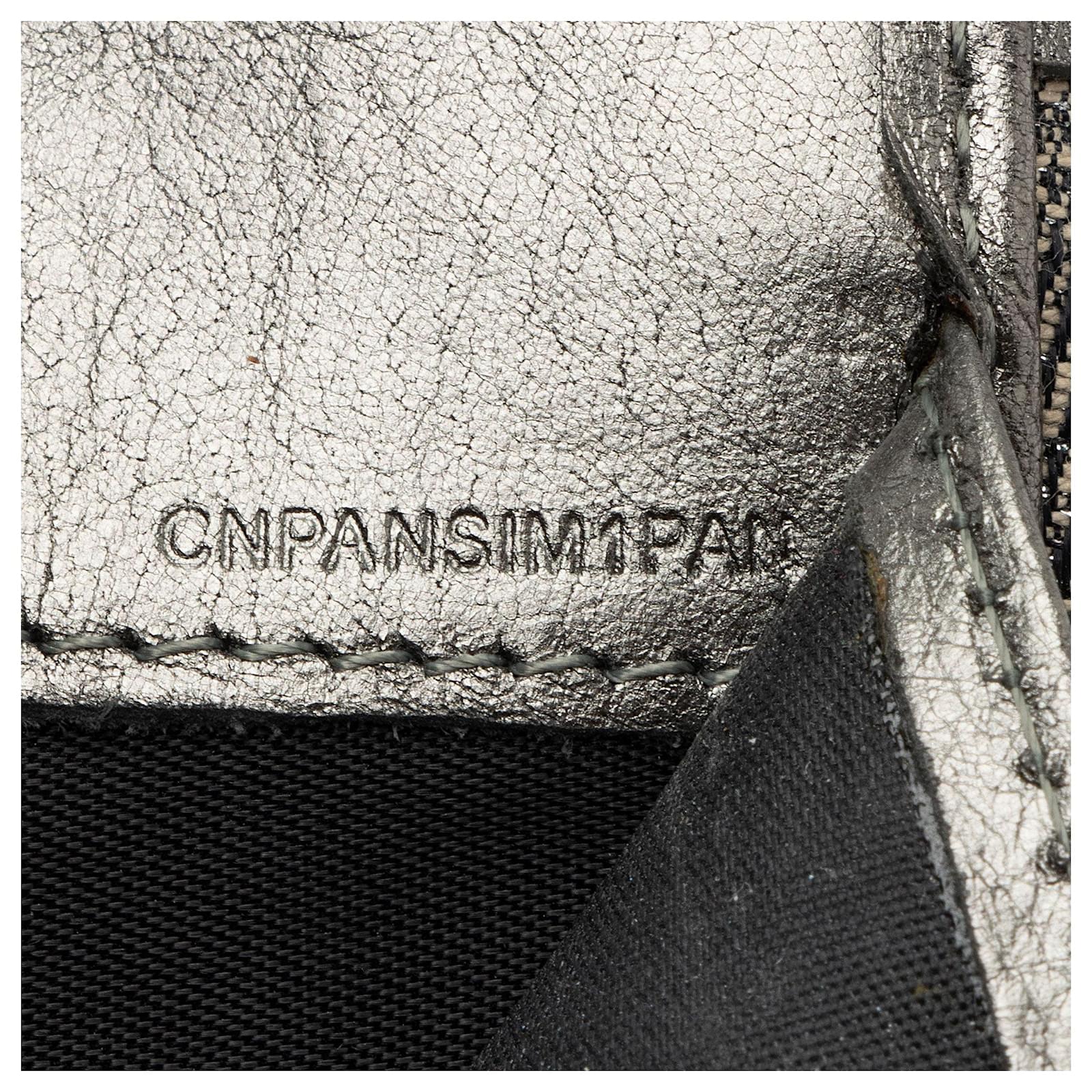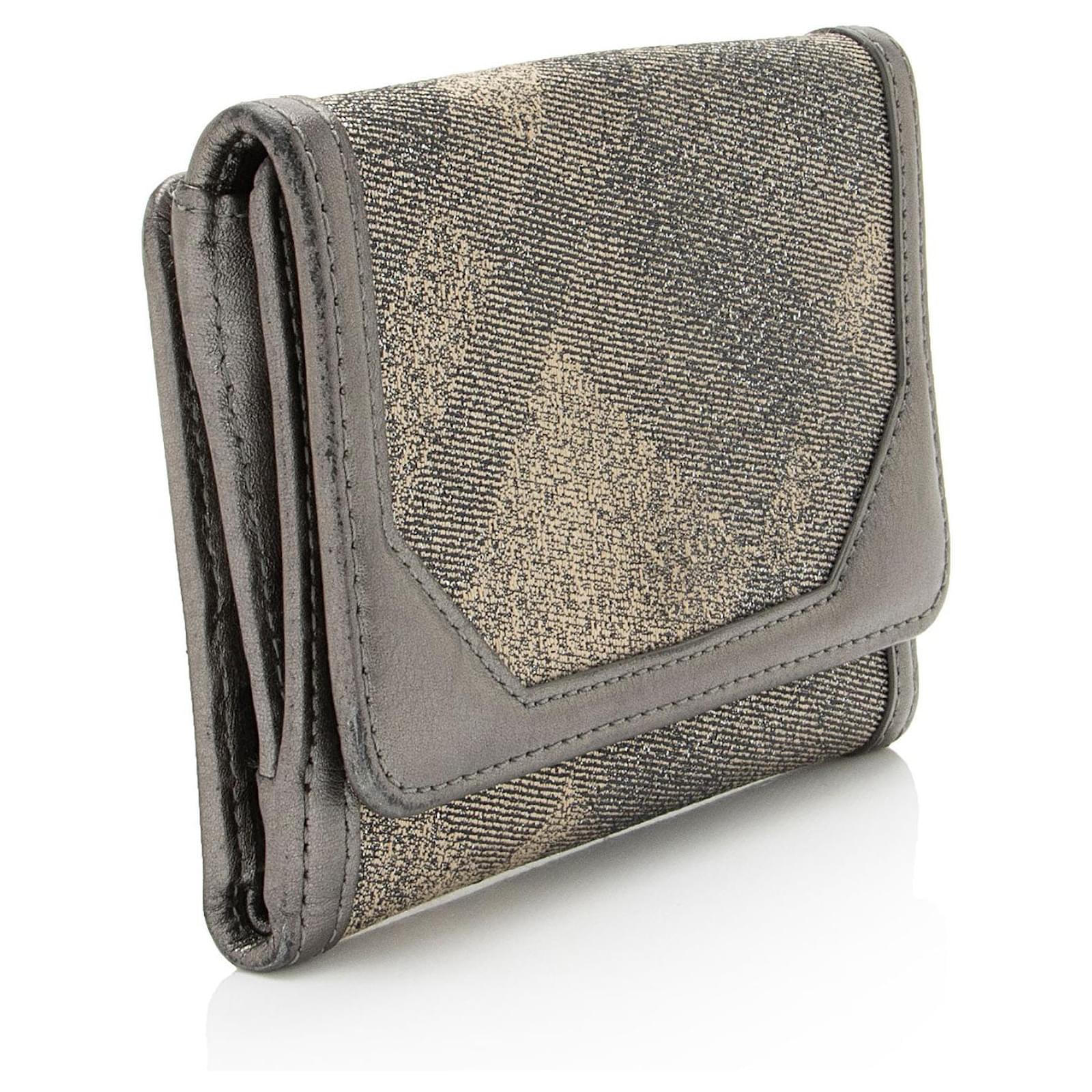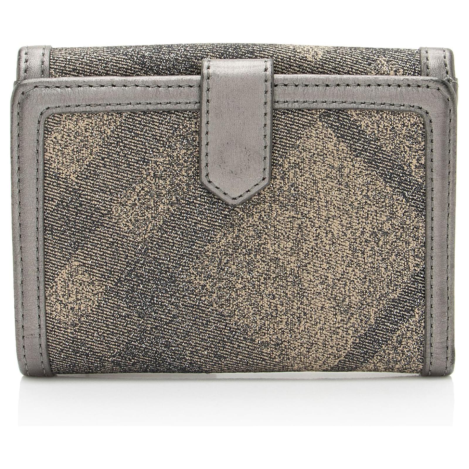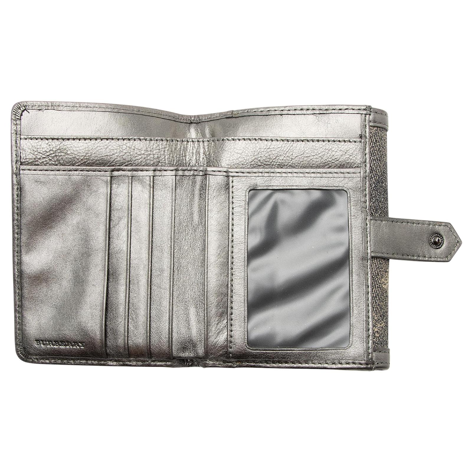 The original British luxury brand of Burberry has set an unmatched standard for sophisticated style since its debut in 1856. From the basis of the famous trench coat, the collection has grown into a globally-recognized leader in ready-to-wear, timepieces, and leather goods. Under the creative leadership of Ricardo Tisci, the brand is continuously pushing the limits; integrating modern design while never losing site of its signature check pattern.Condition Notes: Scuffs throughout exterior edges and corners. Light scuffs and wear throughout exterior leather trim. Visible creasing and scuffs throughout interior.Width: 5.5\”Height: 4\”Depth: 1.25\”Type of Material: Metallic Canvas, Metallic LeatherColor: Black, SilverLining: Silver LeatherPockets: Front Snap, Interior ID Pocket, Three Credit Card Slots, Two Bill Compartments, Two Interior OpenHardware: GunmetalClosure: SnapOrigin: ChinaIncludes: Dust Bag Measurments: width: 139 mm height: 101 mm \n Product Id: 510800 \n