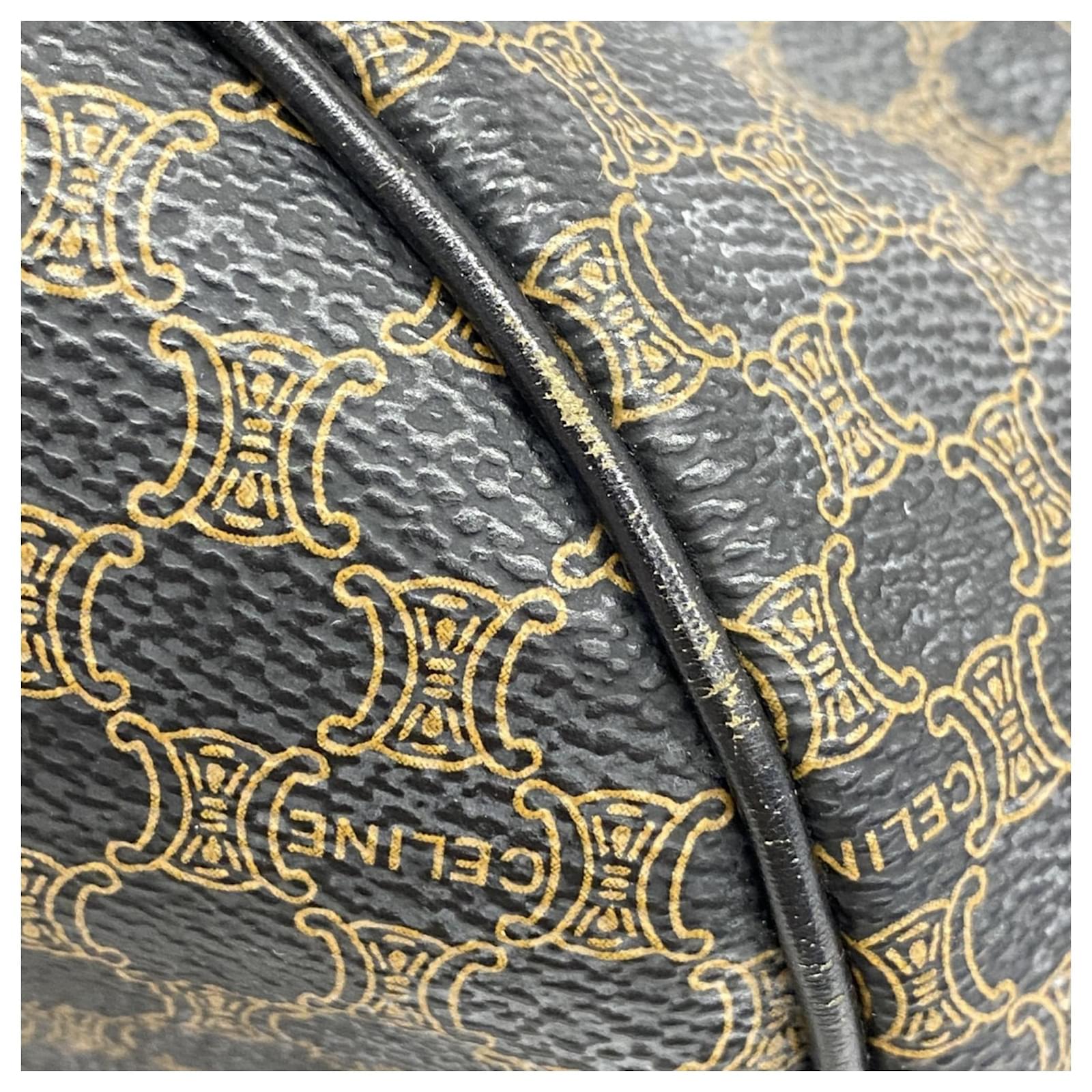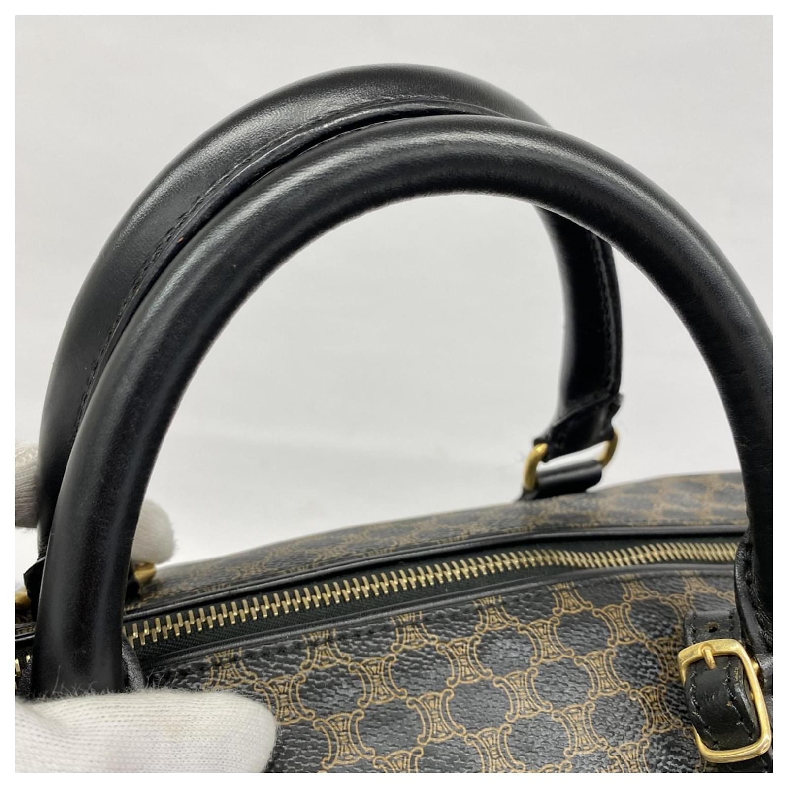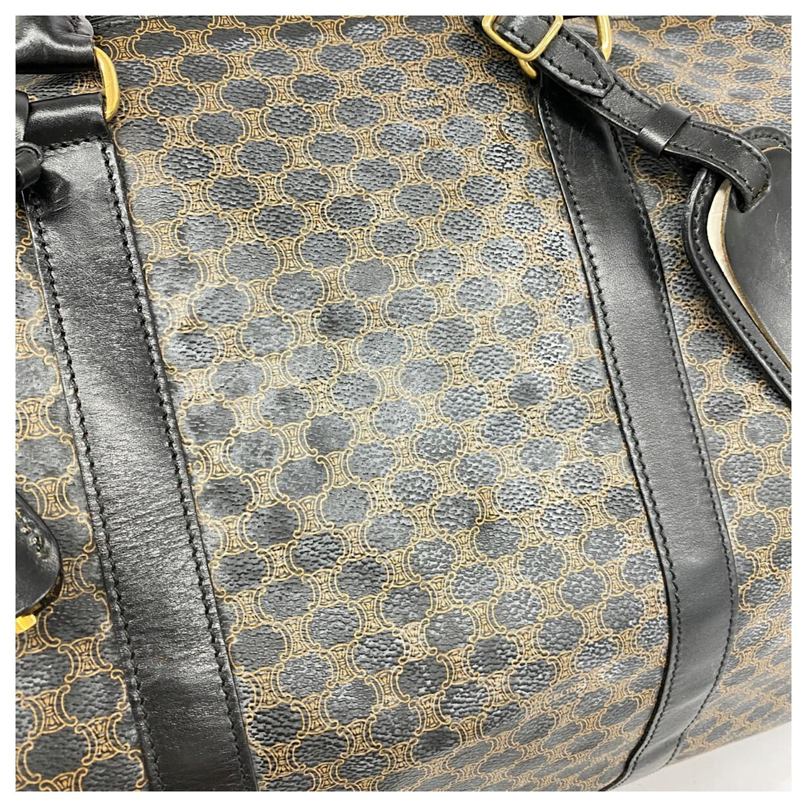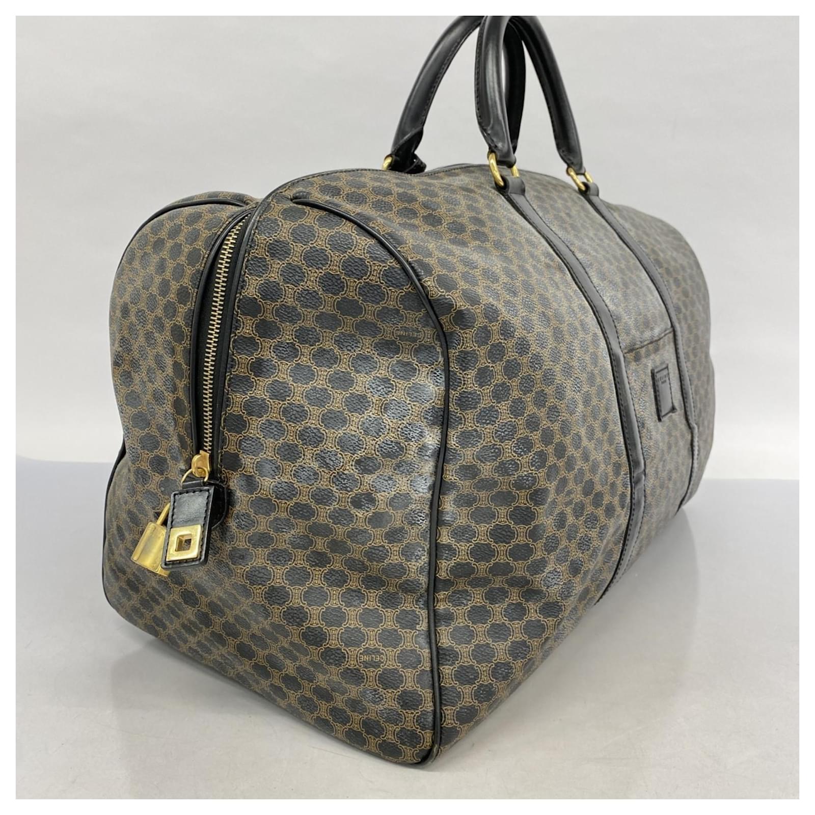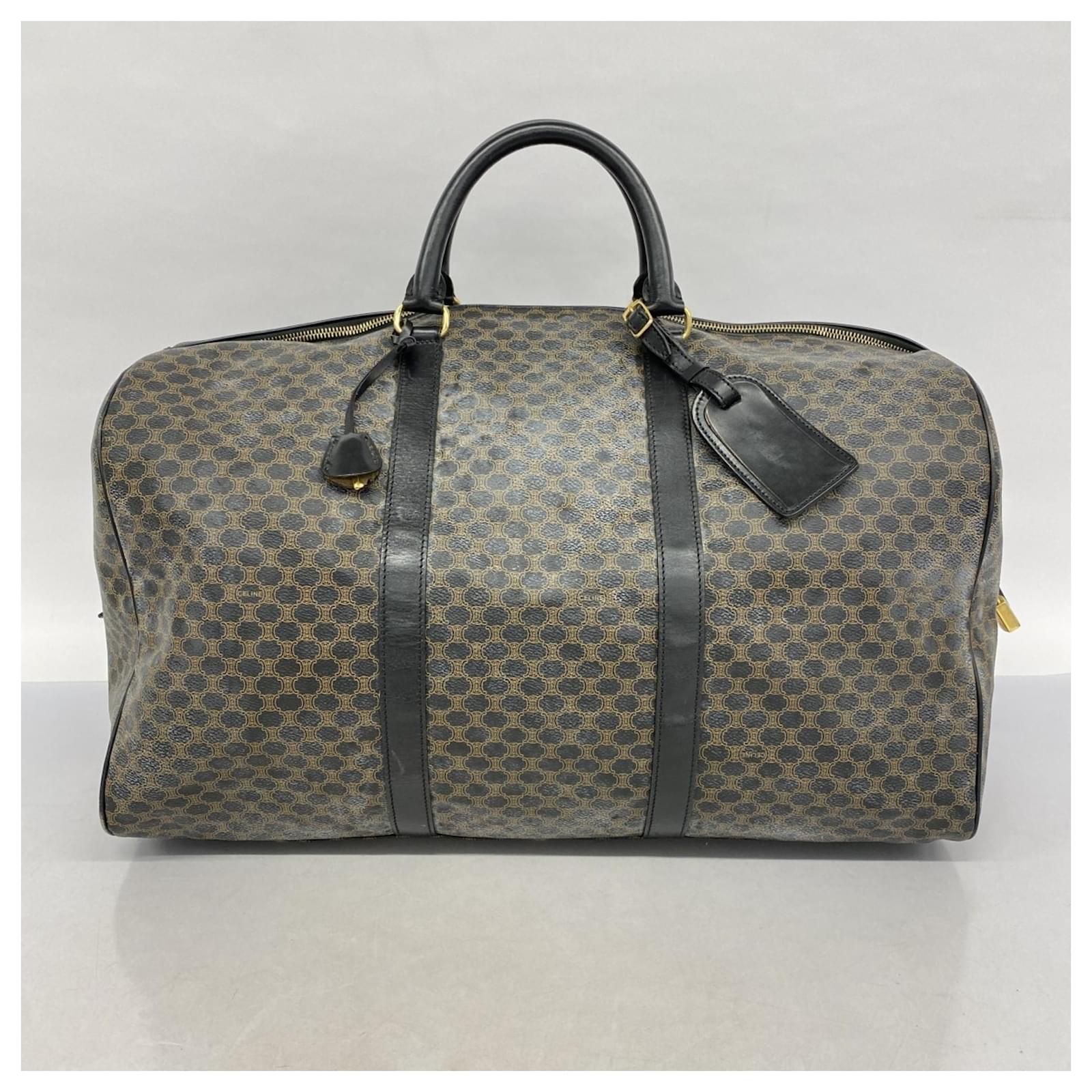 The Celine Boston Bag Macadam in black is a versatile accessory suitable for both men and women. Made from durable PVC, this bag features gold hardware that adds a touch of elegance. With dimensions of 29cm x 48cm x 26cm, it offers ample space for daily essentials. \n\nThis item is in good used condition, classified as Rank AB, with slight traces of usage, including minor scratches and dirt. It comes with a clochette, key, name tag, and padlock. Potential buyers are encouraged to review the images for a detailed view of the bag’s condition and included accessories.