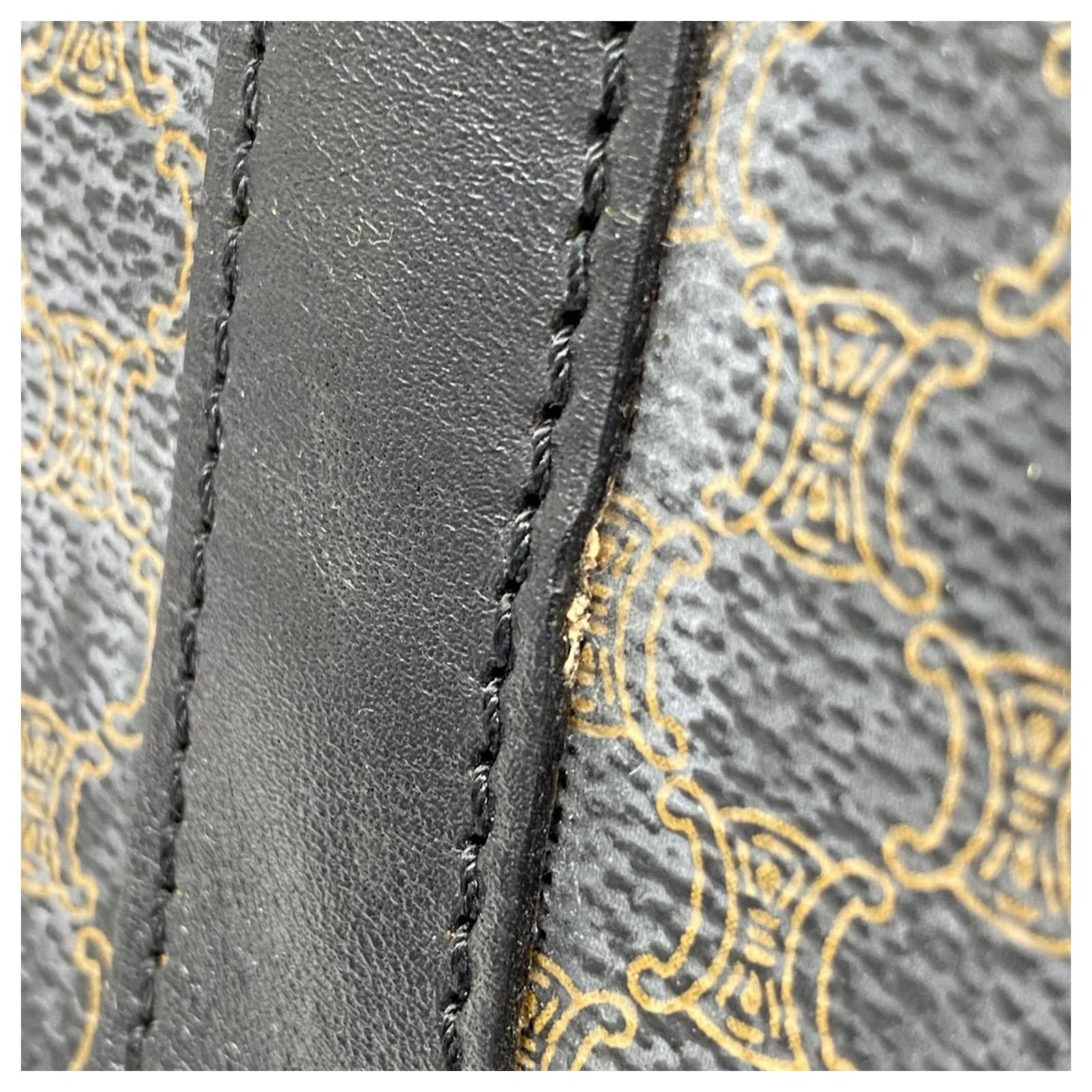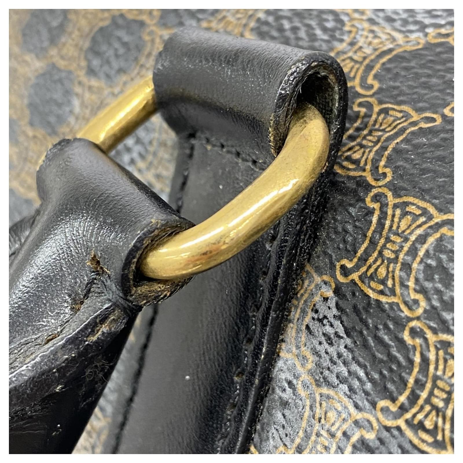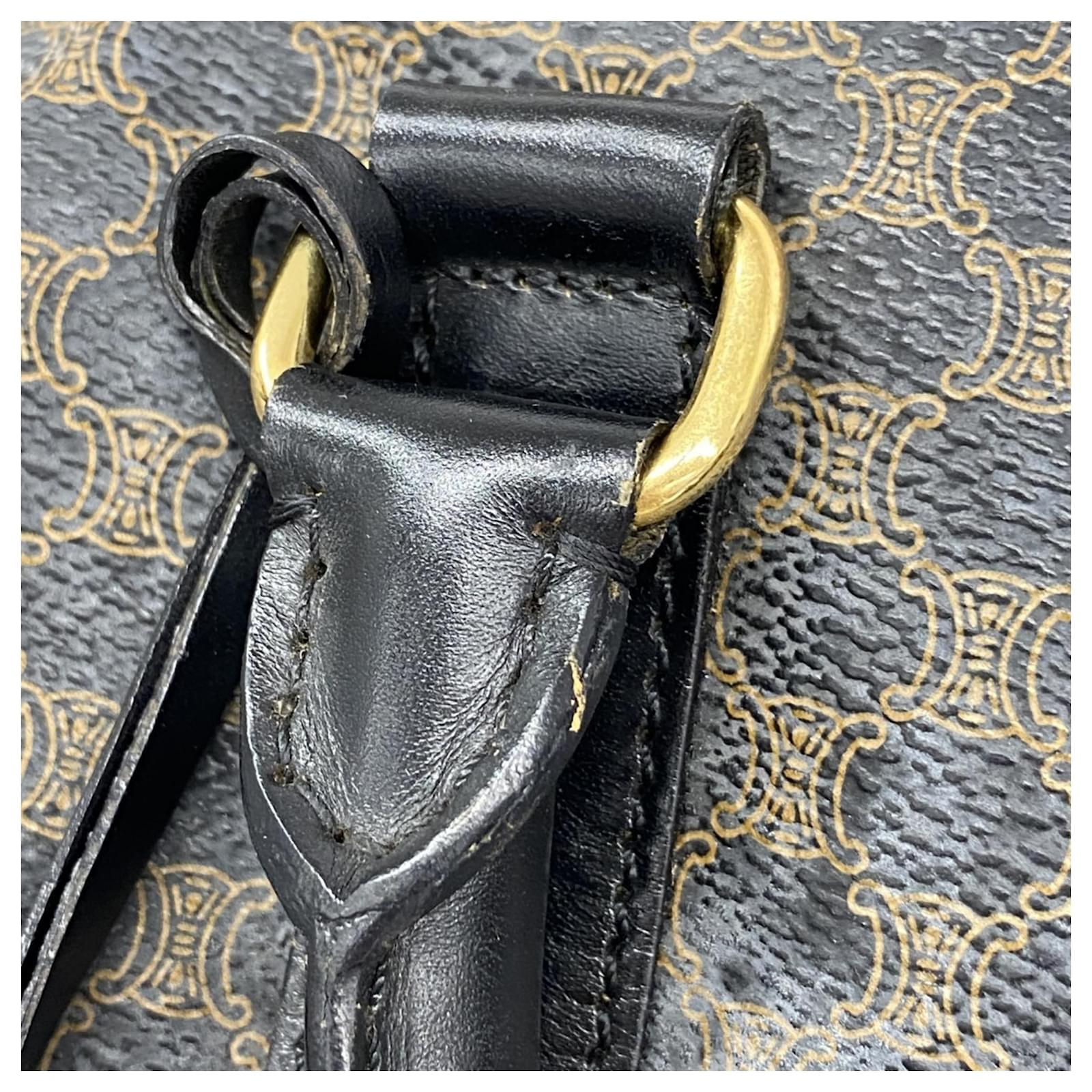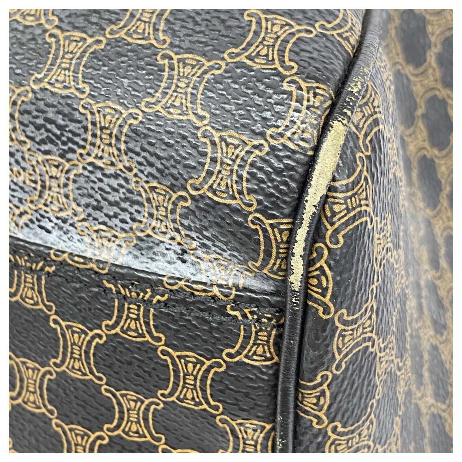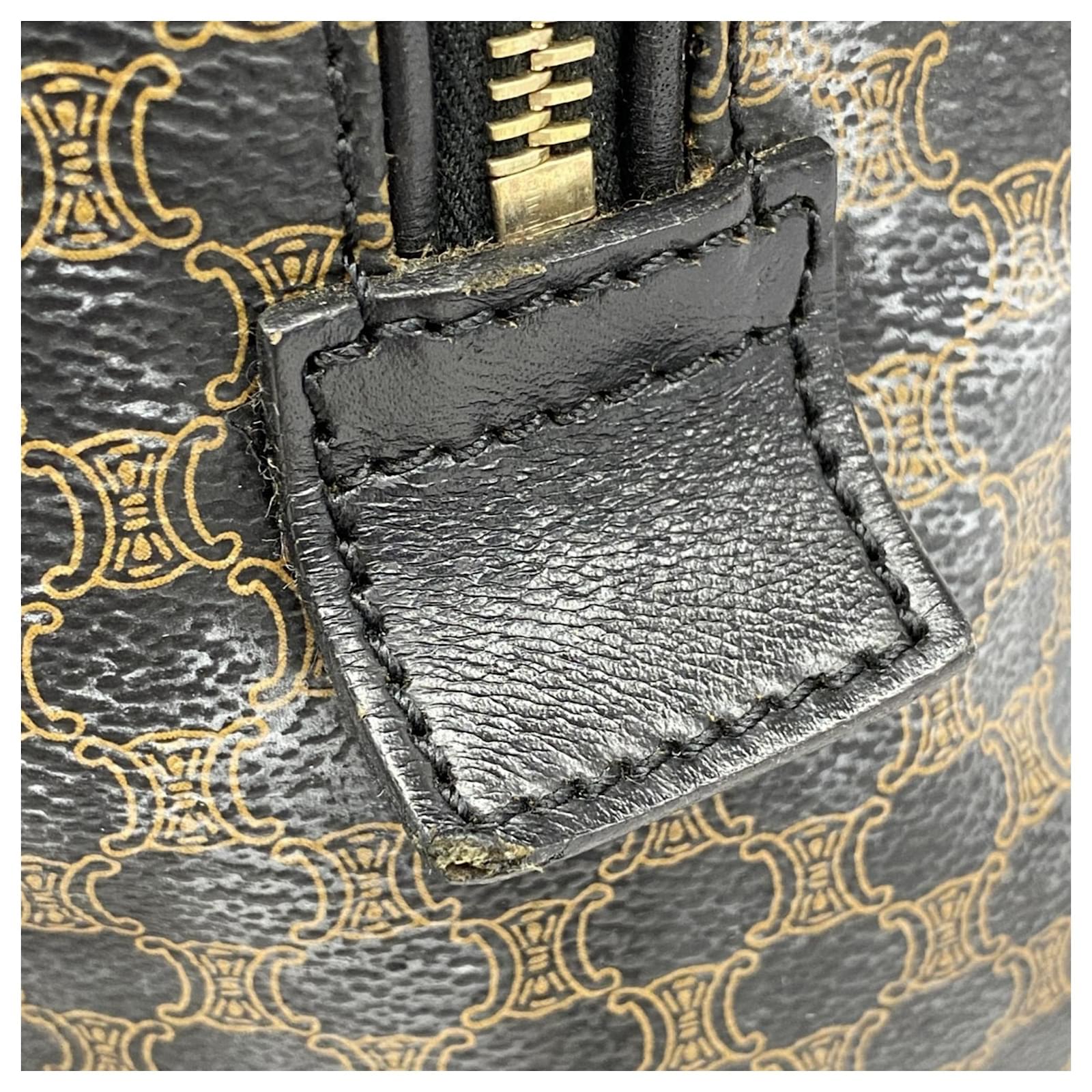 The Celine Boston Bag Macadam in black is a versatile accessory suitable for both men and women. Made from durable PVC, this bag features gold hardware that adds a touch of elegance. With dimensions of 29cm x 48cm x 26cm, it offers ample space for daily essentials. \n\nThis item is in good used condition, classified as Rank AB, with slight traces of usage, including minor scratches and dirt. It comes with a clochette, key, name tag, and padlock. Potential buyers are encouraged to review the images for a detailed view of the bag’s condition and included accessories.