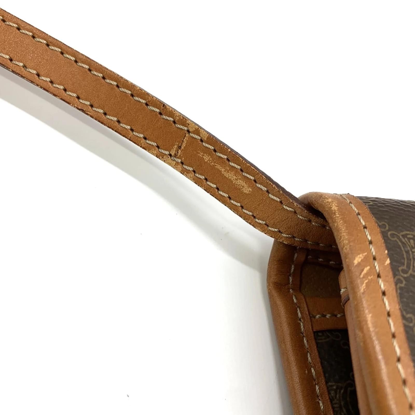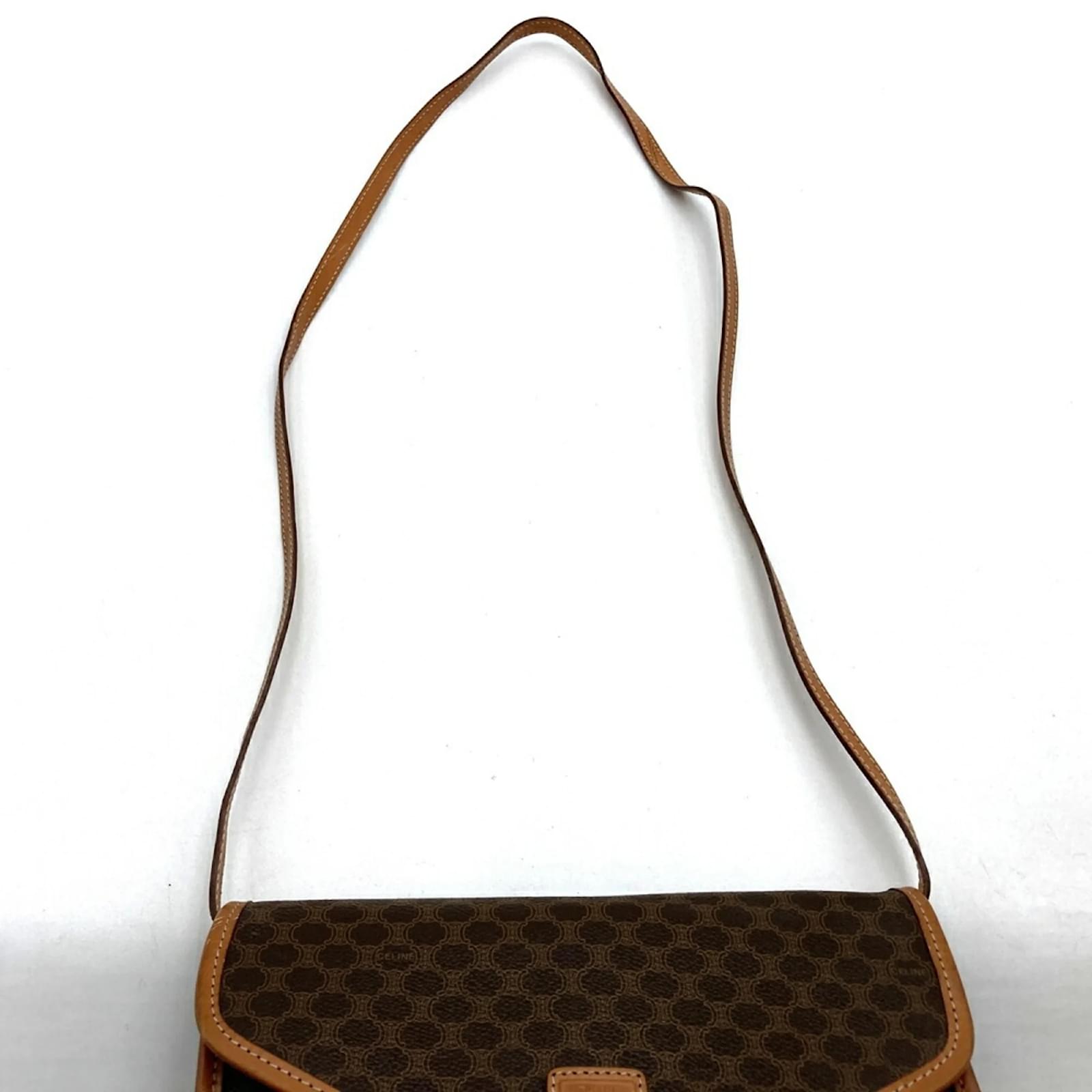 The Celine DM93 Shoulder Bag is a stylish accessory crafted from a combination of PVC and leather, featuring a distinctive Macadam pattern. This brown shoulder bag measures 16cm in height, 26cm in width, and 5cm in depth, making it a practical choice for daily use. \n\nThis item is pre-owned and classified as being in good condition, with slight traces of use, including minor scratches and dirt. Potential buyers are encouraged to review the provided images to assess the exact condition of the bag and any included accessories. \n\nThe bag is part of the Celine brand, known for its quality and design.
