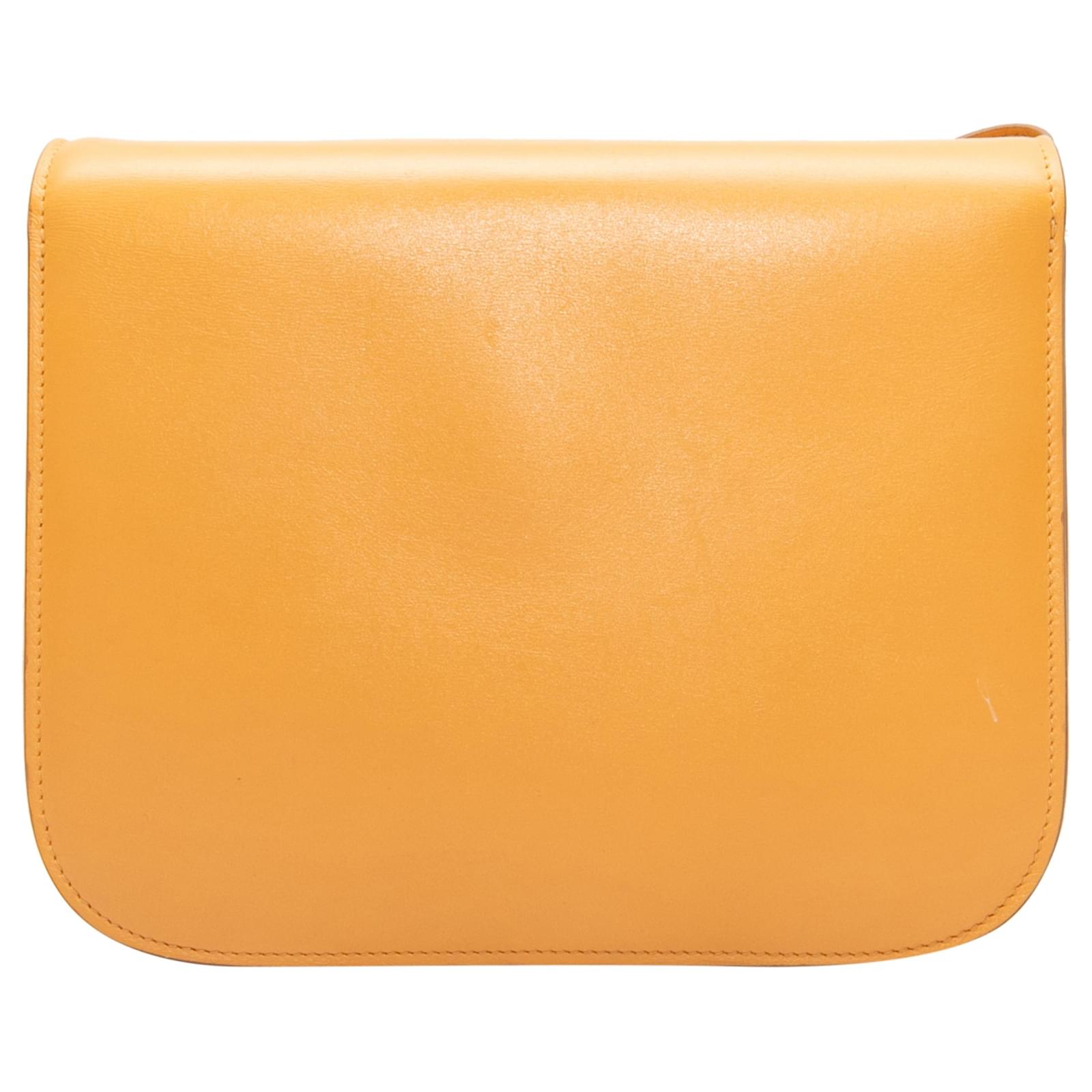 Mustard Celine Teen Classic Leather Crossbody\nProduct Details:\n Mustard Celine Teen Classic Leather Crossbody. The Teen Classic Crossbody features a leather body silver-tone hardware a single flat shoulder strap and a front clasp closure. 9.25\” L x 7.5\” H x 2.5\” D 17\” shoulder strap drop.\nCondition:\nPre-owned. Good. Slight wear throughout. Slight scratching and tarnishing throughout hardware. Fading and creasing at leather. Markings and scuffing throughout exterior leather. \n