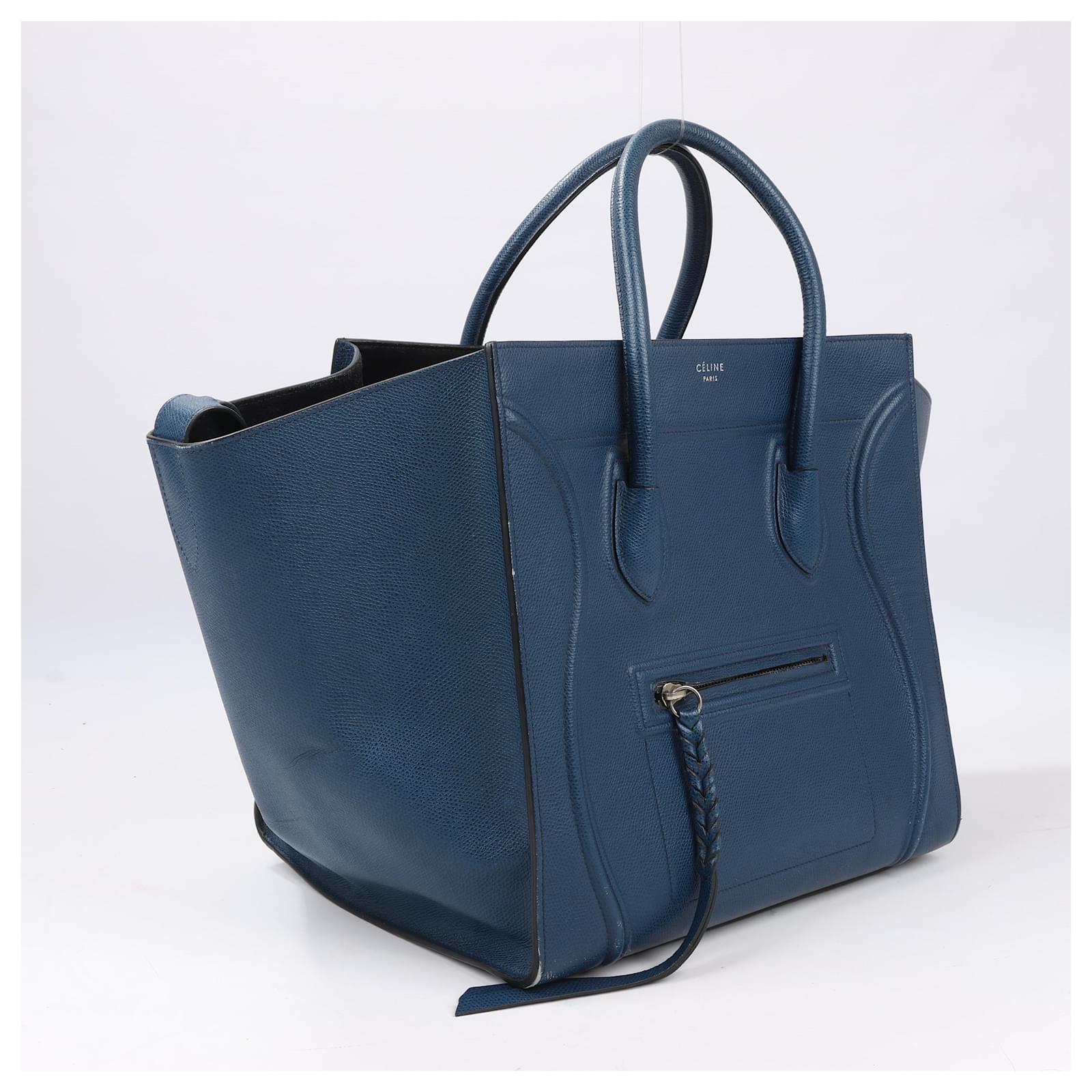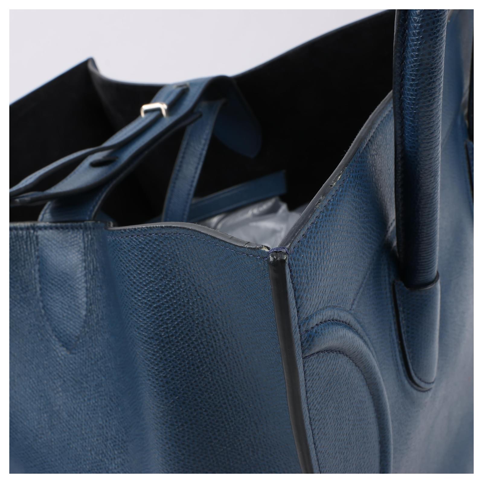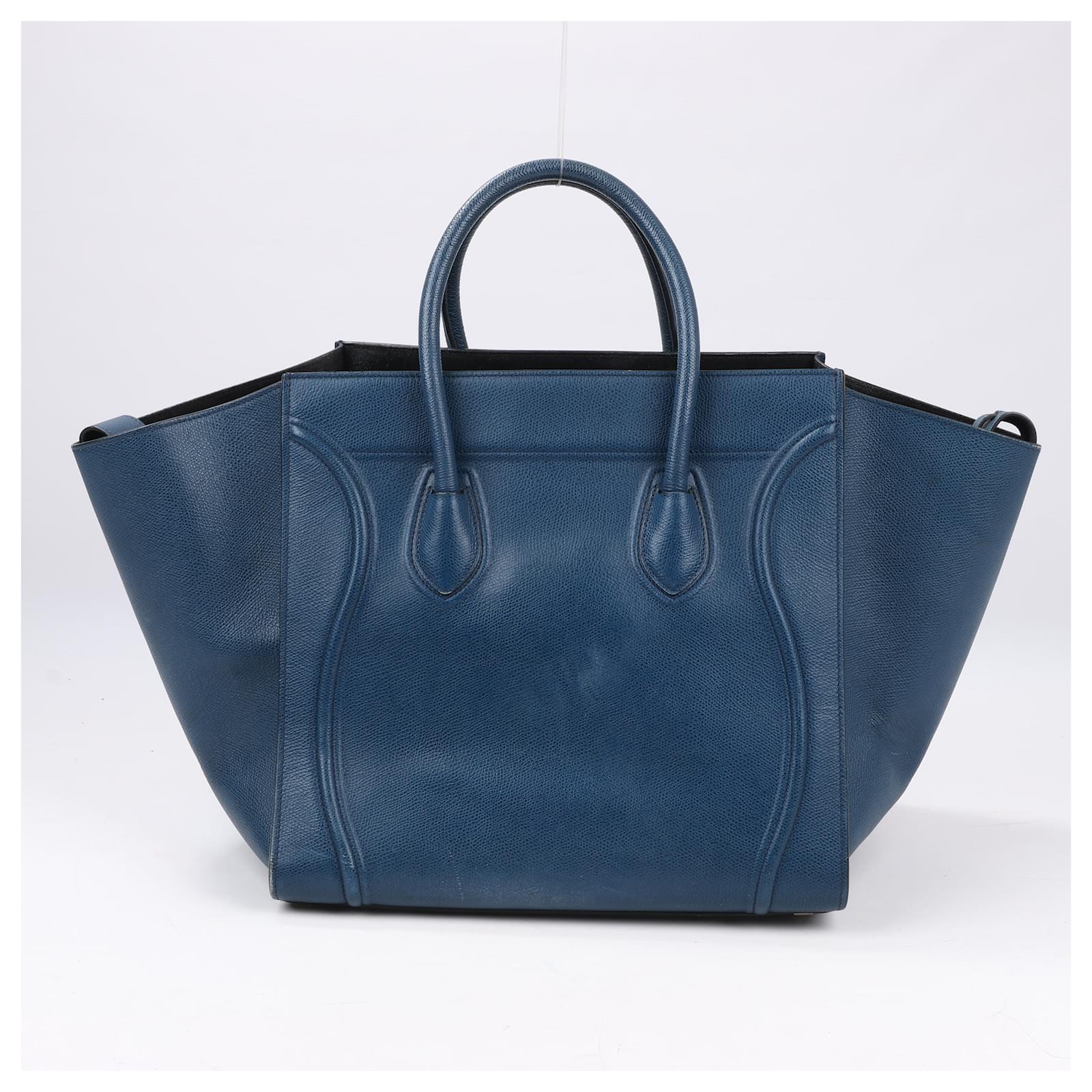 The Celine Luggage Phantom Medium Handbag in Navy features luxurious smooth\nleather and iconic winged sides. With its spacious interior and signature front\nzip pocket, this stylish bag combines elegance and practicality, perfect for any\nsophisticated wardrobe.\nBrand: Celine\nModel: Luggage Phantom\nSize: Medium\nWidth: 30 cm\nHeight: 29.5 cm\nExterior Condition: Excellent\nInterior Condition: Very good\nCondition Details: Exterior leather is clean and beautiful, but has some\nrubbings and creases, the bottom edges has scratches. Handles ar clean and firm.\nThe interior lining is in good condition with light stains. Width at the top is\n51 cm.\nColour: Navy\nInterior Colour: Black\nHardware Colour: Silver\nMaterial: Leather\nComes With: Dustbag