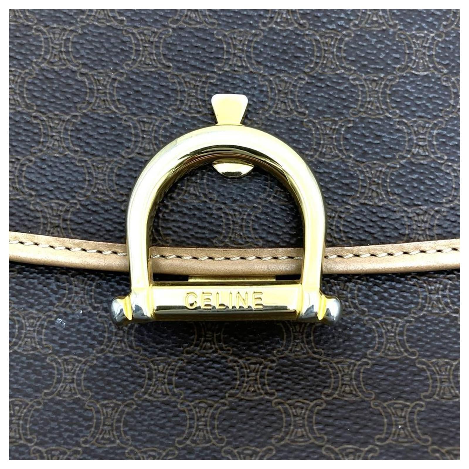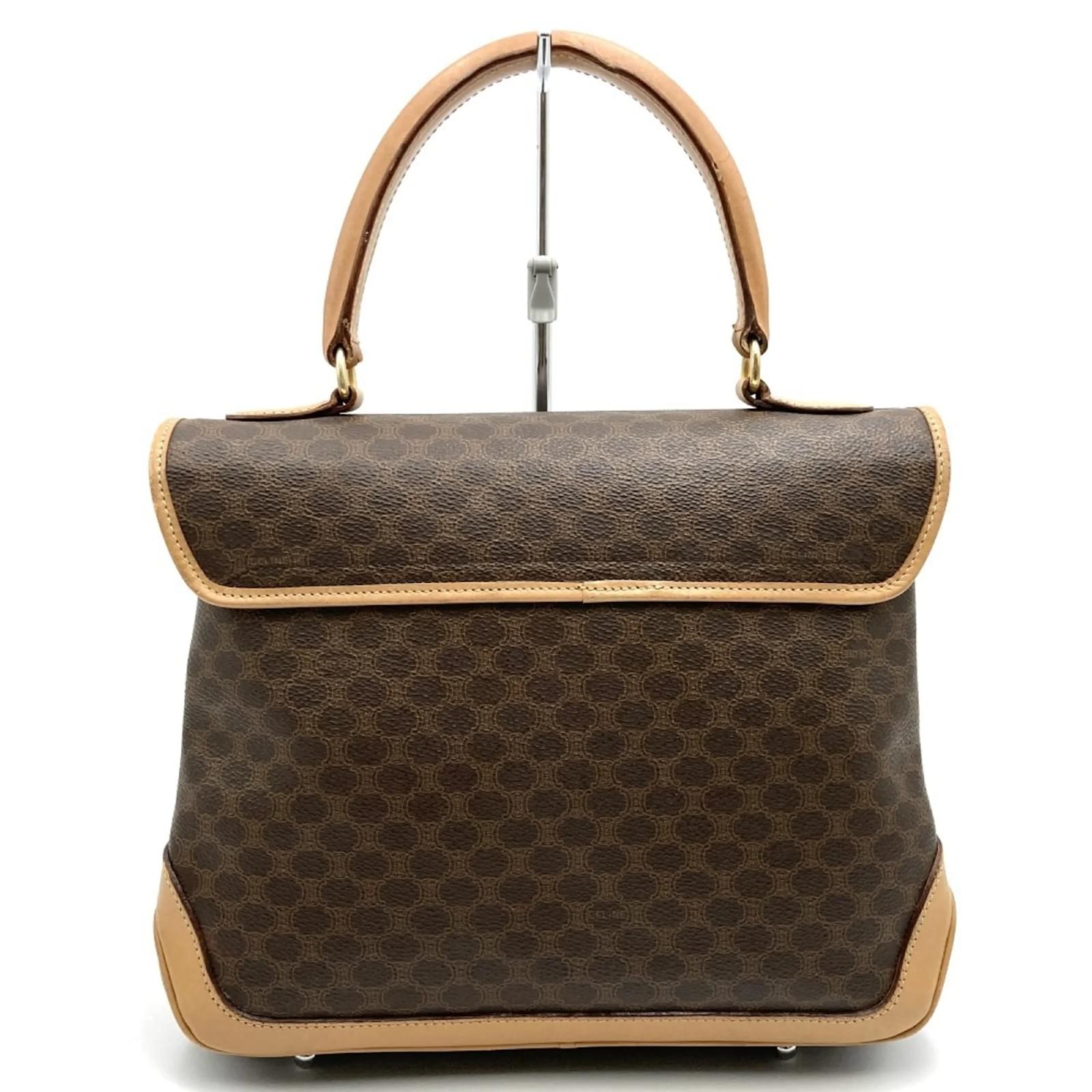 The Celine M12 handbag is a stylish accessory crafted from a combination of PVC and leather, presented in a rich brown color. With dimensions of 21cm x 27cm x 9cm, it offers a practical size for everyday use. This handbag features macadam design elements and lock hardware, making it suitable for women’s fashion. \n\nThis item is classified as used but remains in good condition, showing slight traces of usage, including minor scratches and dirt. The hardware and handle exhibit slight peeling. Potential buyers are encouraged to review the provided images for a clear understanding of the item’s condition. No additional accessories are included with the handbag.