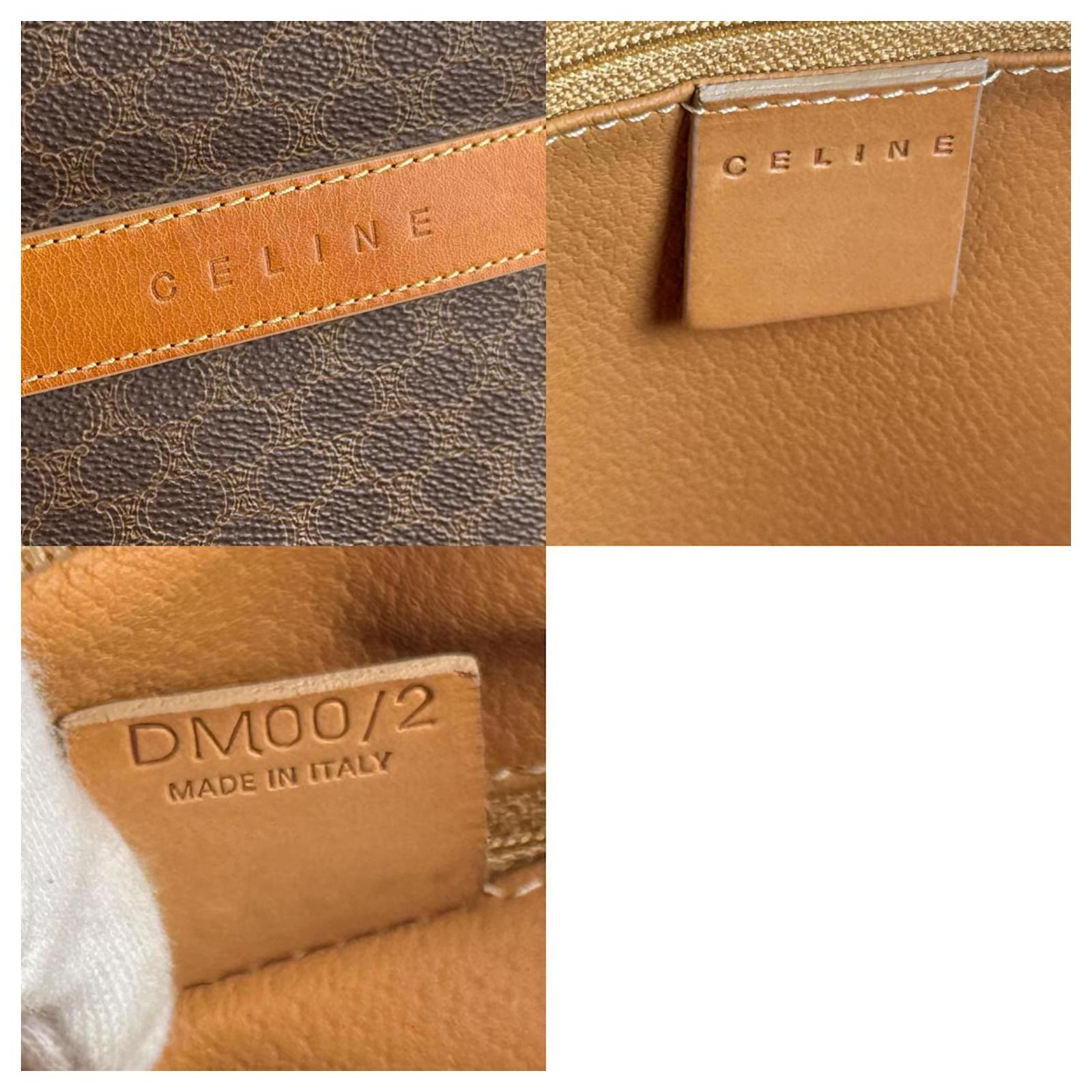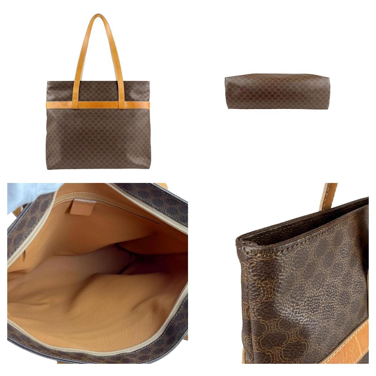 The Celine Macadam Shoulder Bag is crafted from a combination of coated canvas and leather, featuring a brown color that adds a classic touch. This bag measures 30cm in height, 34cm in width, and 11cm in depth, with a strap length of 62cm, making it suitable for both men and women. It is designed with a zipper closure for secure storage. \n\nThis particular bag is in used condition, classified as Rank AB, indicating it shows traces of usage, including slight scratches and dirt. There are some noted imperfections, such as an overall outside stain and a crack on the strap. Potential buyers are encouraged to review the provided images for a clear understanding of the item’s condition. The bag comes with a dust bag for protection.