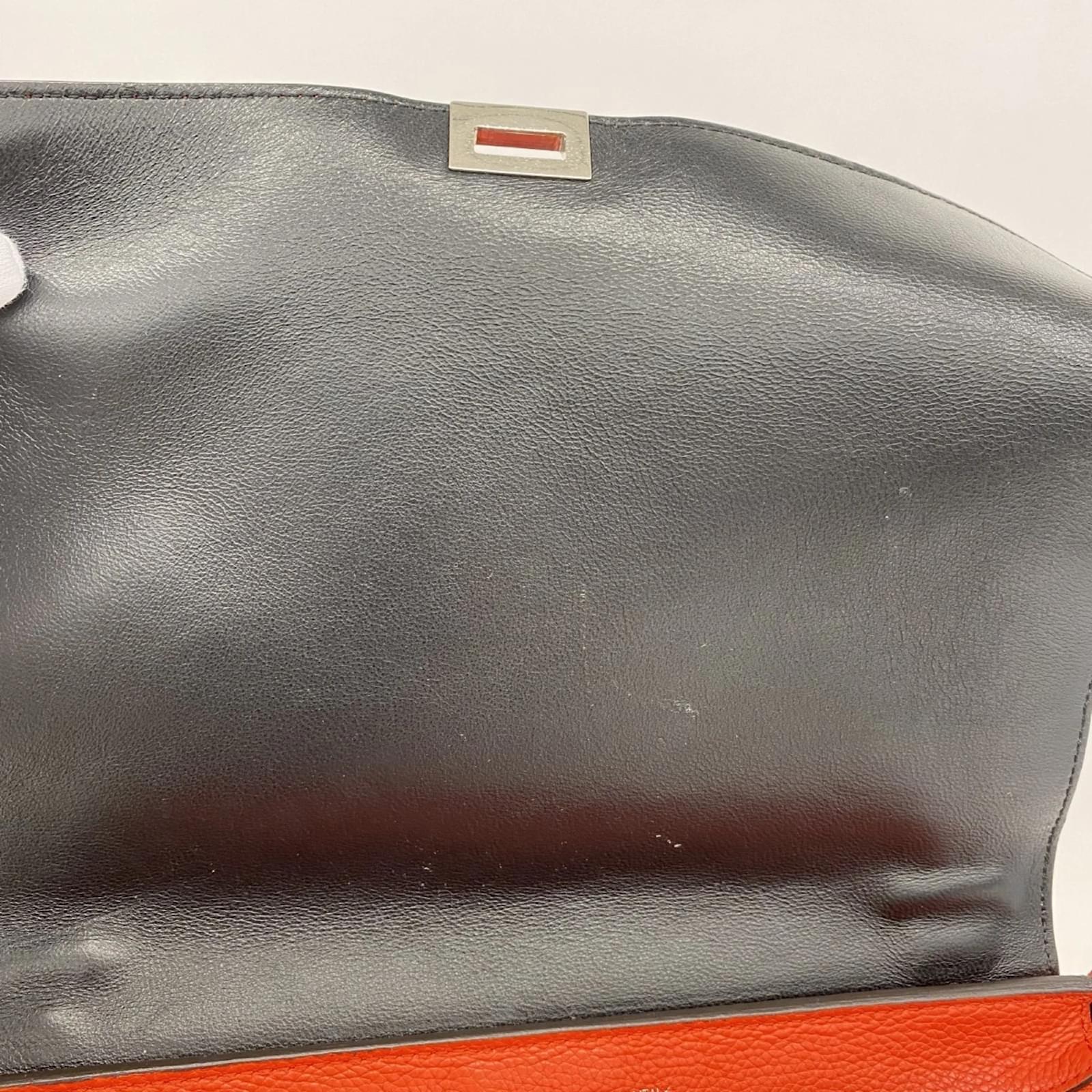 This Celine handbag features a trapeze design crafted from leather in a vibrant orange color, complemented by silver hardware. Measuring 26cm x 30cm x 15cm (10.23” x 11.81” x 5.9”), it is suitable for various occasions. The handbag is classified as used but remains in good condition, showing slight traces of use, including minor scratches and dirt. It comes with a shoulder strap for added convenience. Potential buyers are encouraged to review the images for a detailed view of the item’s condition and included accessories.