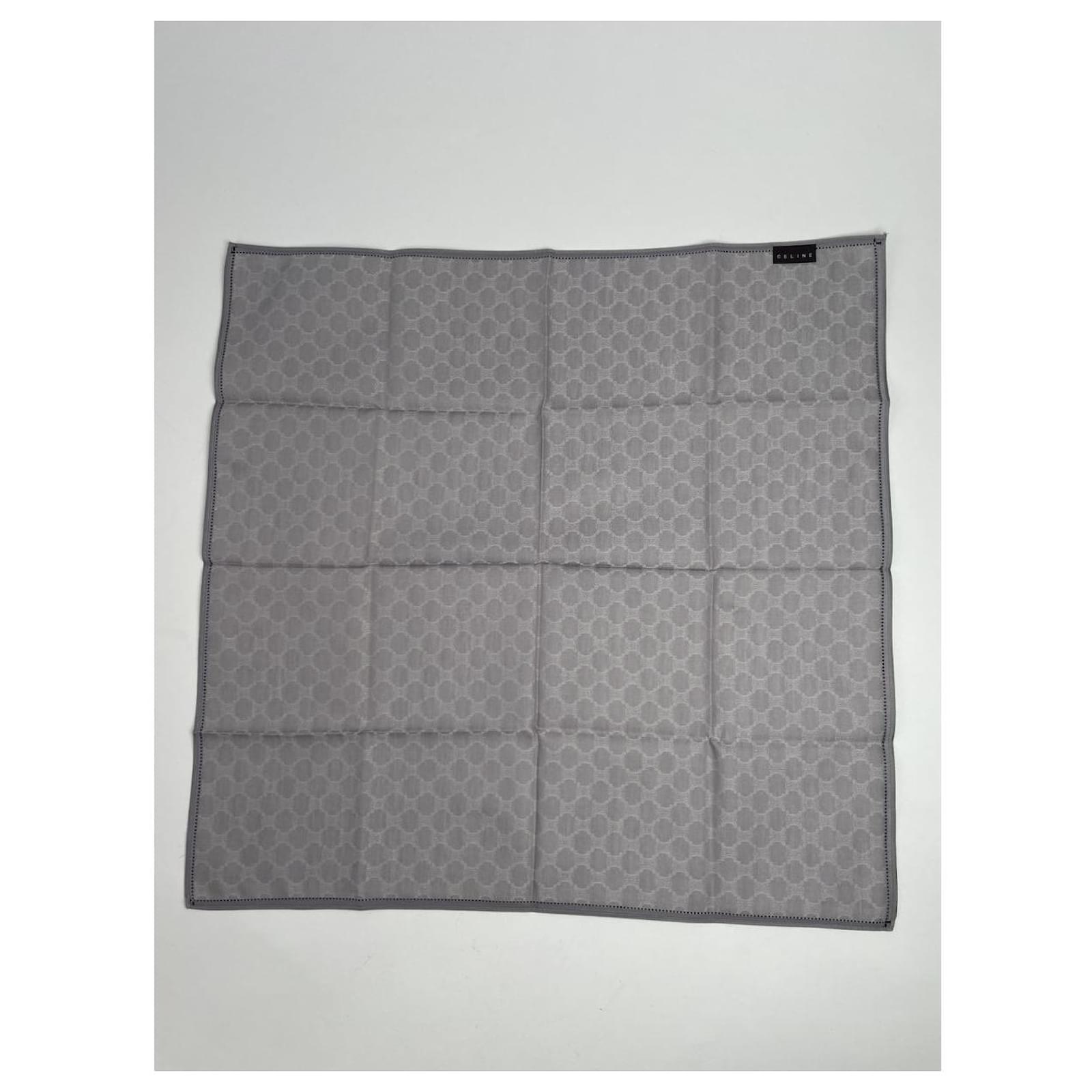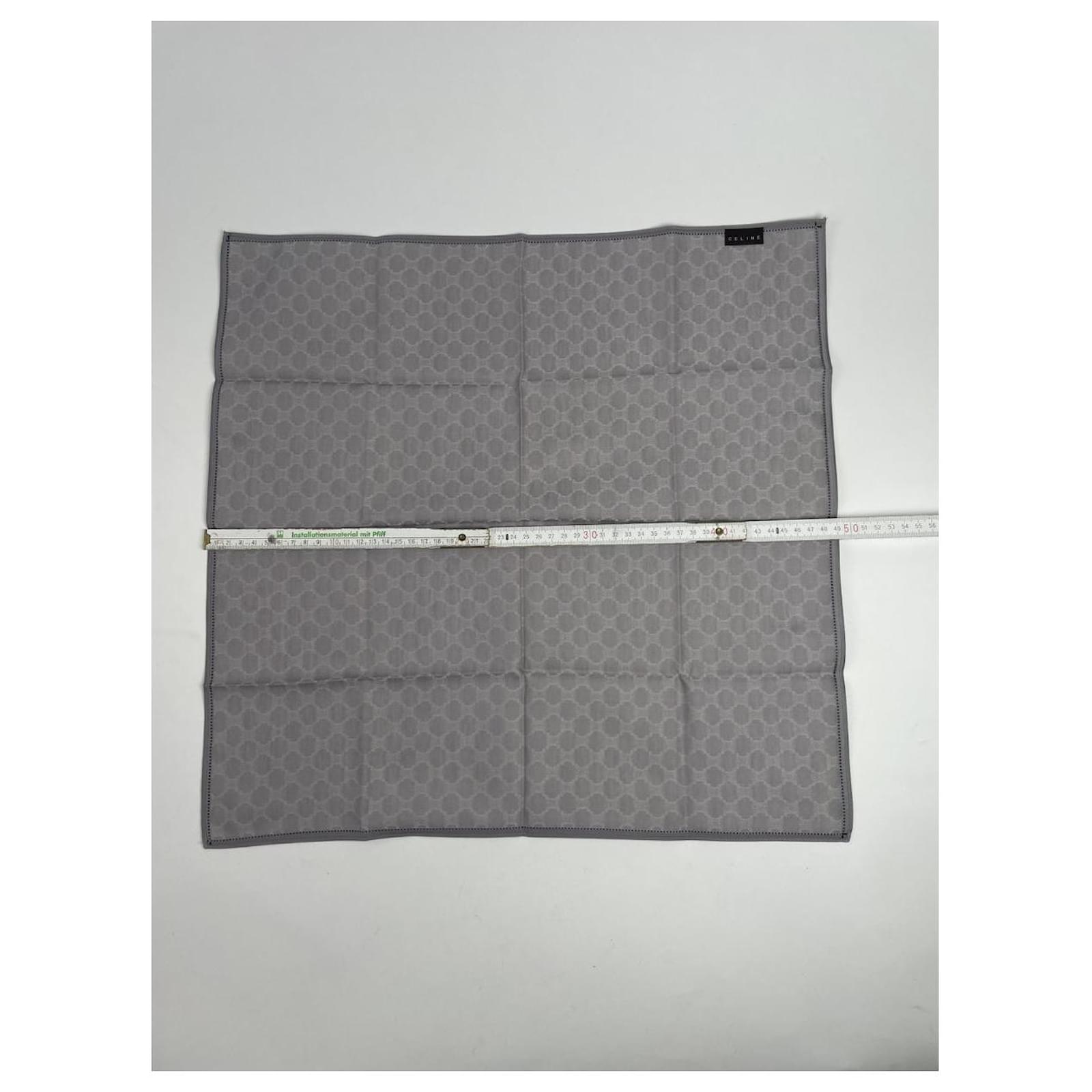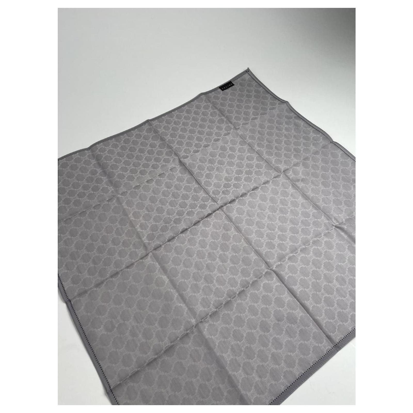 CELINE Paris Vintage Monogram Silk Scarf. This elegant scarf is crafted from a\nluxurious silver-grey silk and canvas blend, featuring the iconic Celine\nmonogram pattern. A timeless and sophisticated accessory, perfect for any\nwardrobe.\nBrand: CELINE Paris\nModel: Vintage Scarf\nCondition: Like New\nCondition Details: The fabric is in pristine condition with no visible signs of\nwear. The colors remain vibrant, and the edges are perfectly preserved.\nMain Colour: Silver/Grey (Celine Monogram)\nMaterial: Silk, Canvas\nWidth: 49 cm\nHeight: 49 cm\nGender: women\nVC Condition: Very good condition\nVC Category: accessories\nVC Subcategory: scarves\nVC Subsubcategory: Cheche\nPattern: Other