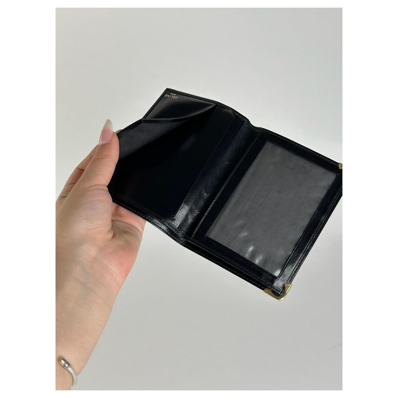 CELINE PARIS Vintage Leather Wallet. This elegant piece is finely crafted of\nblack leather with gold-tone steel corner protectors and features the CELINE\nTriomphe logo embossed on the front. The Triomphe logo, inspired by the chain\nsurrounding the Arc de Triomphe in Paris, was first introduced in the 1970s and\nreestablished under Hedi Slimane as a core symbol of the house’s timeless French\nheritage. The wallet includes a transparent ID slot made of PVC and a full-size\nbill compartment, making it ideal for use as a compact unisex wallet.\nBrand: CELINE PARIS\nCondition: Very Good\nCondition Details: The exterior leather is in very good condition with minimal\nsigns of wear. The interior is clean and the hardware is bright and intact.\nMain Colour: Black\nInterior Colour: Black\nHardware Colour: Gold\nMaterial: Leather, PVC\nMade In: Italy\nWidth: 12 cm\nHeight: 9 cm