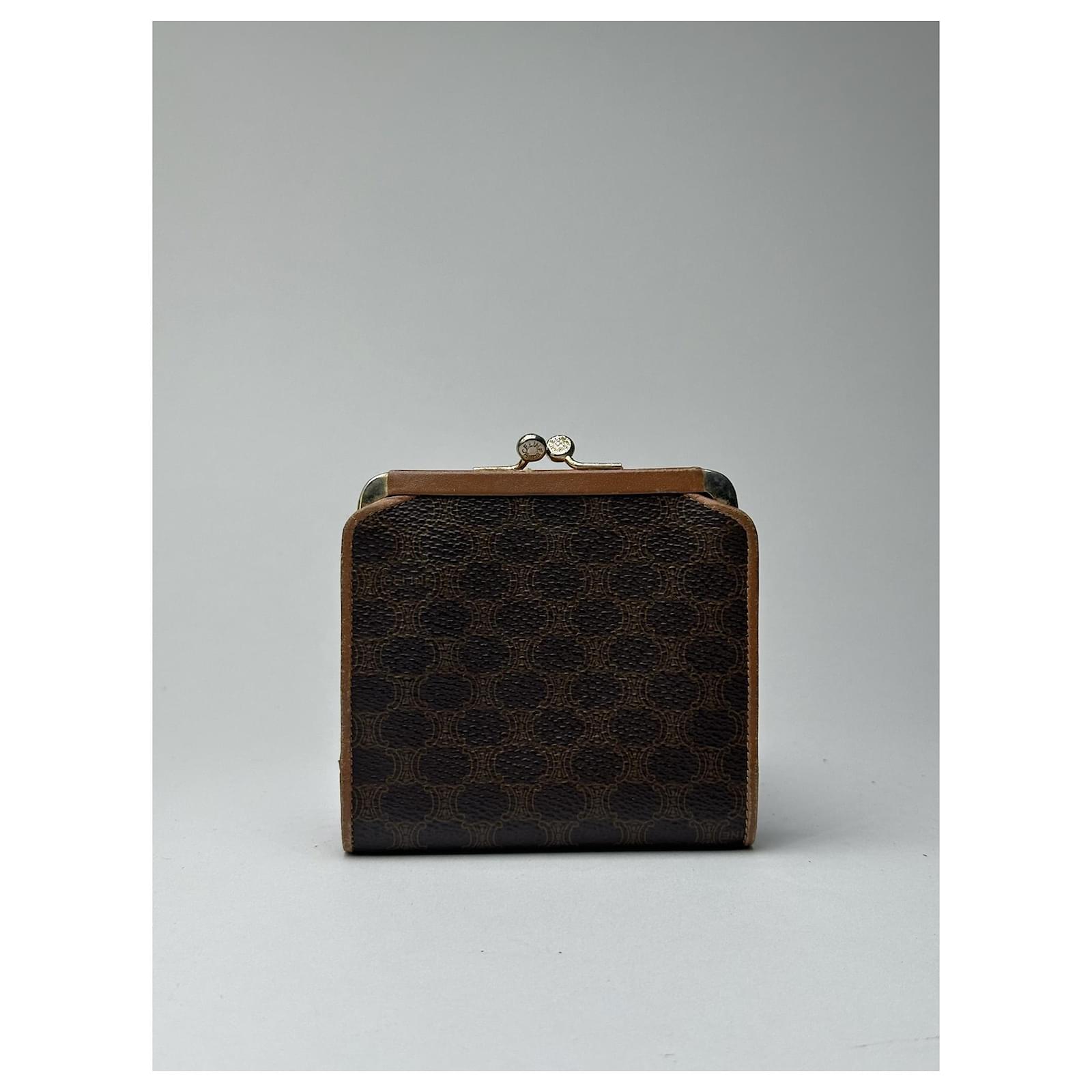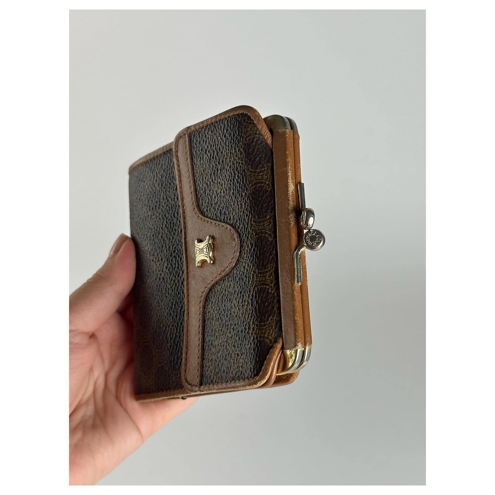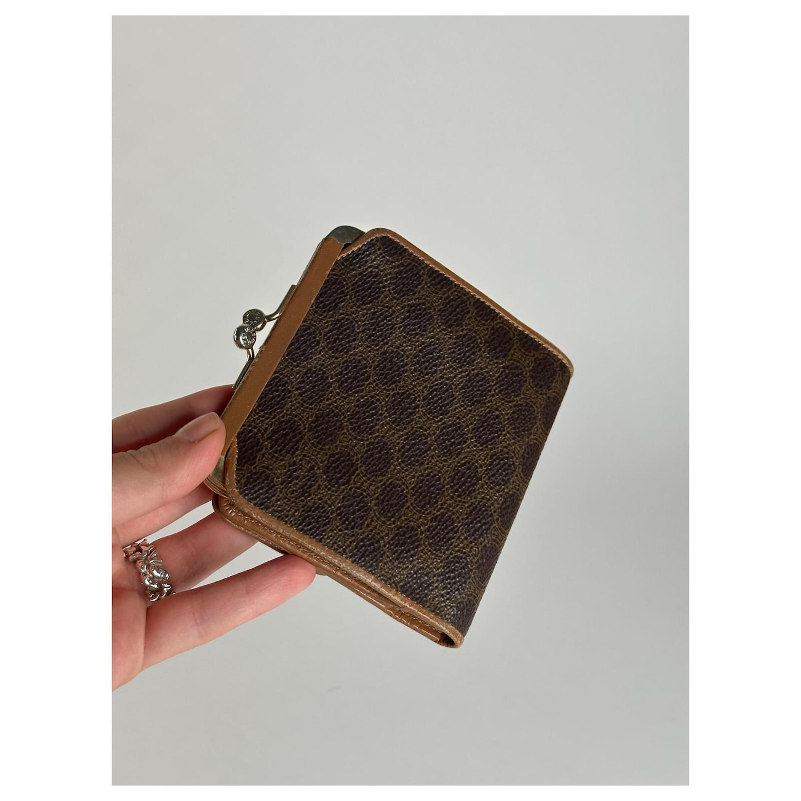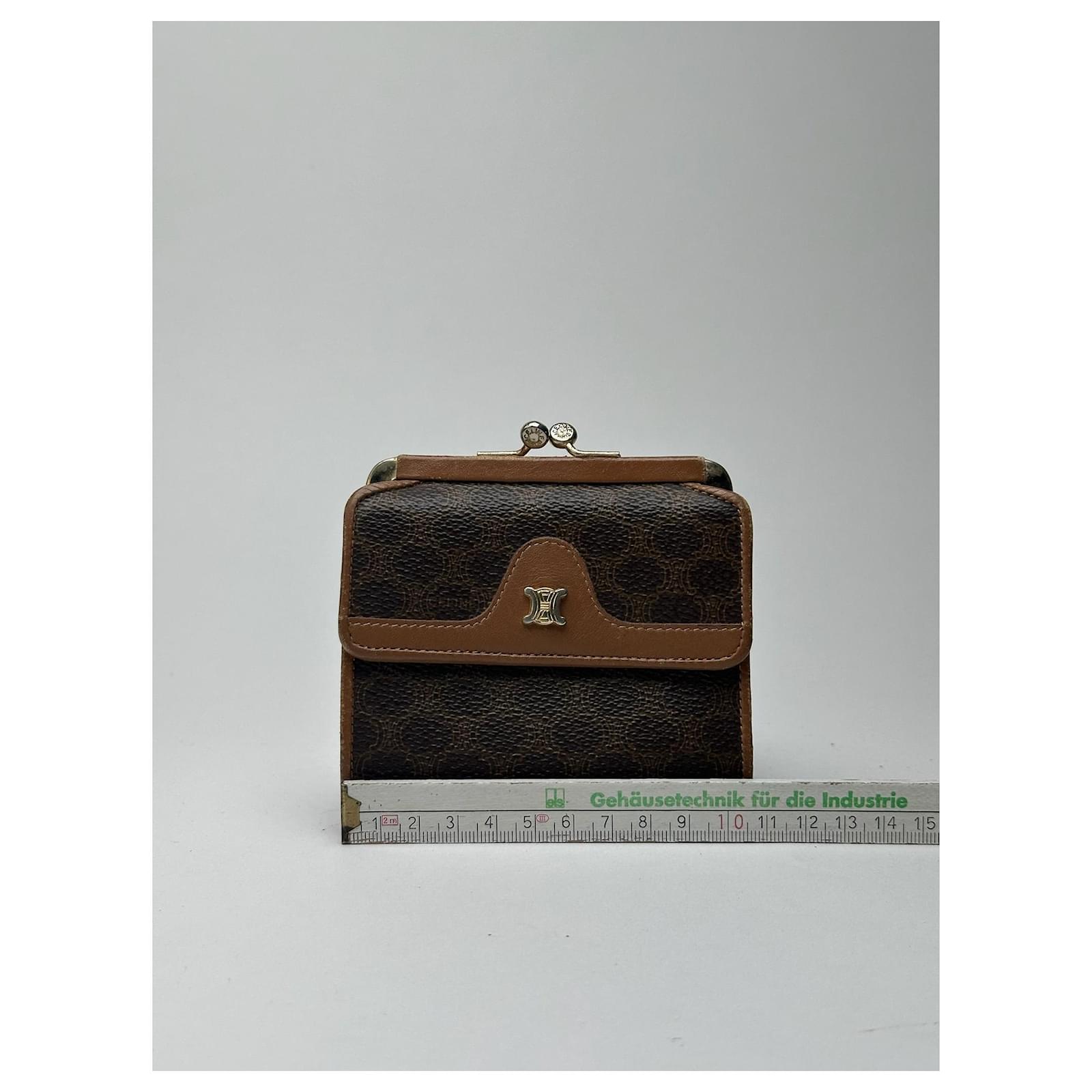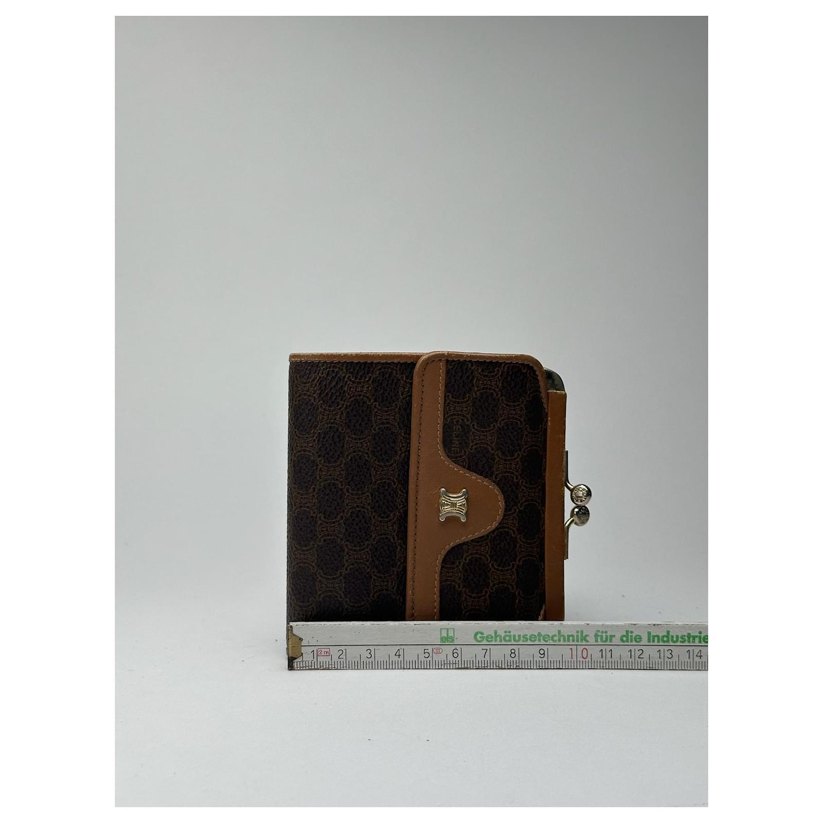 CELINE Macadam Vintage Wallet. This elegant wallet is finely crafted of NB\nleather featuring the classic brown CELINE logo monogram, a design inspired by\nthe Arc de Triomphe and introduced in the 1970s to represent the Parisian\nelegance of the brand. The wallet includes light brown leather detailing, a\nfold-over flap closure for the coin compartment, and a snap button closure for\nbills and cards.\nBrand: CELINE\nModel: Macadam Vintage Wallet\nCondition: Excellent\nCondition Details: The exterior leather is clean and well-preserved with minimal\nsigns of wear. The interior shows some light scratches and faint stains, but\nremains in overall excellent condition. The hardware is bright with slight\nsurface wear.\nMain Colour: Brown\nInterior Colour: Light Brown\nHardware Colour: Gold\nMaterial: Leather\nComes With: –\nWidth: 11.5 cm\nHeight: 9 cm\nDepth: –\nMade in Italy\nYear: 2008\nUnisex