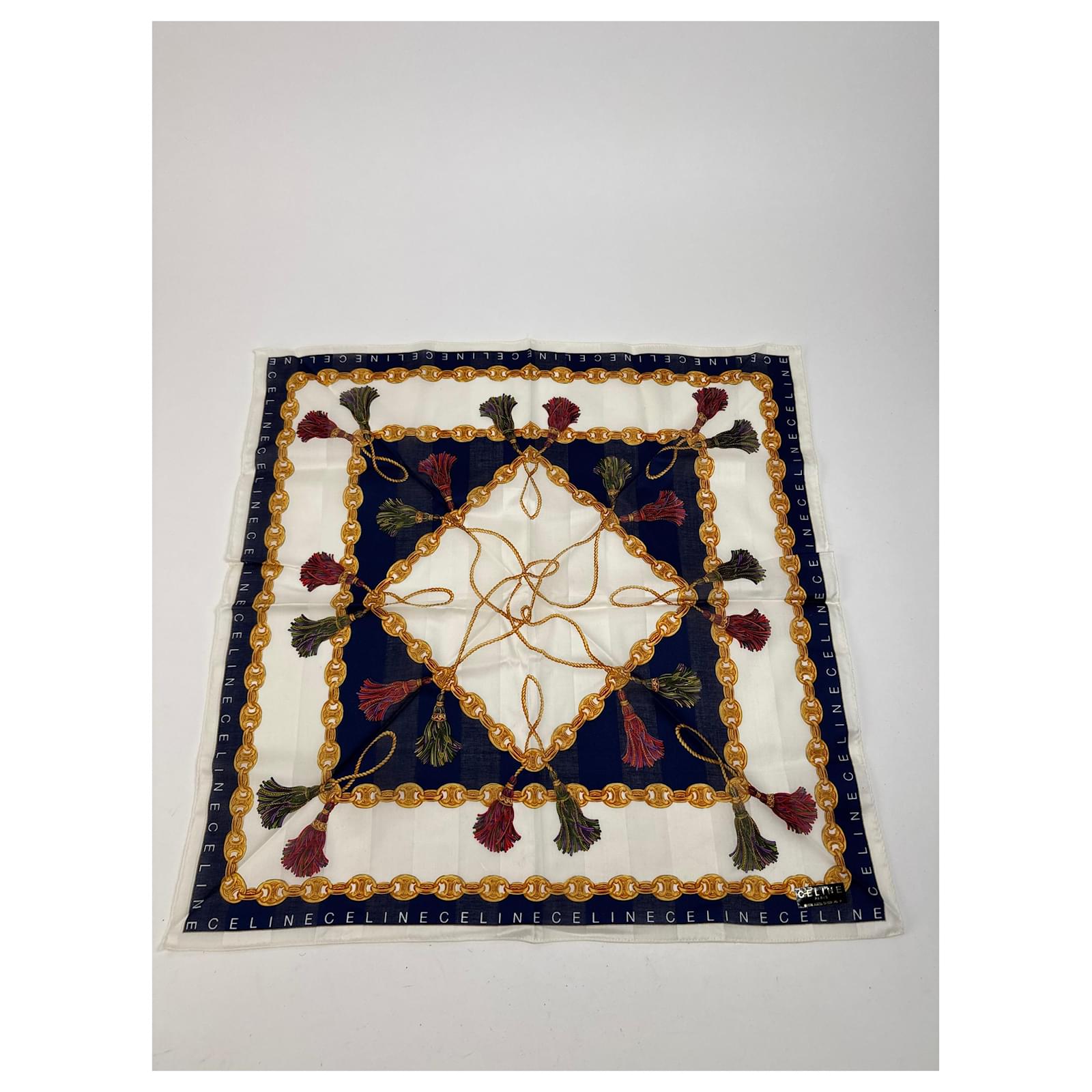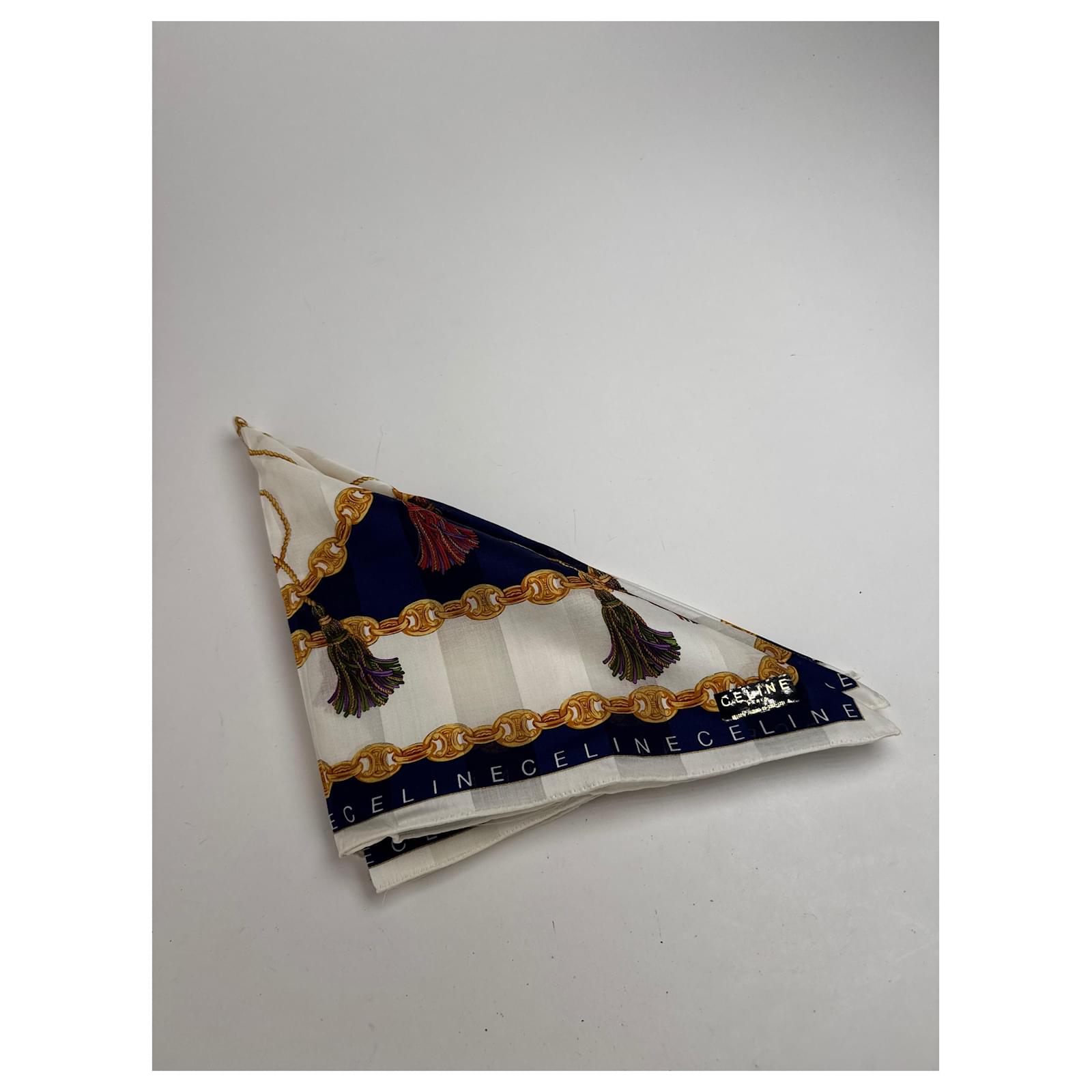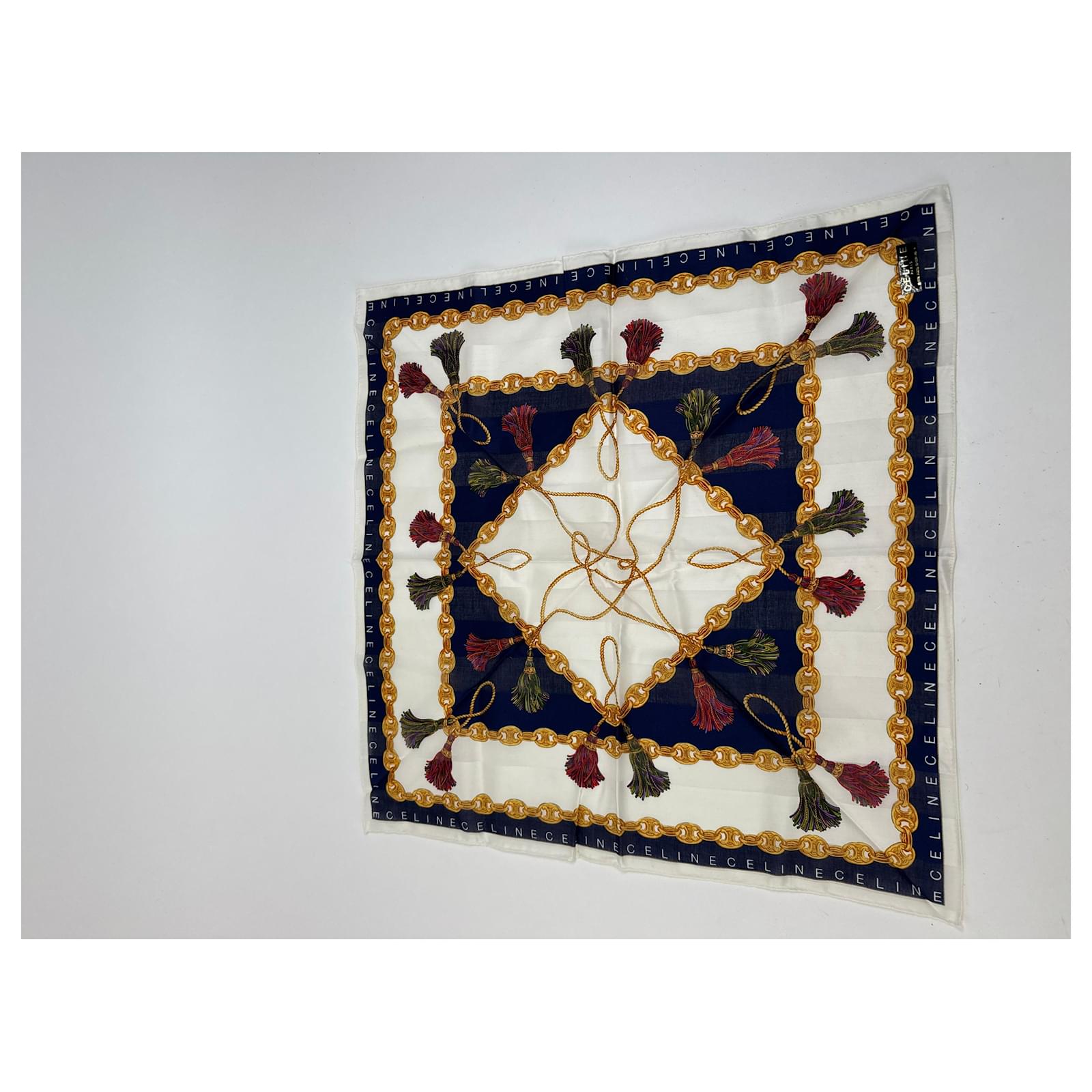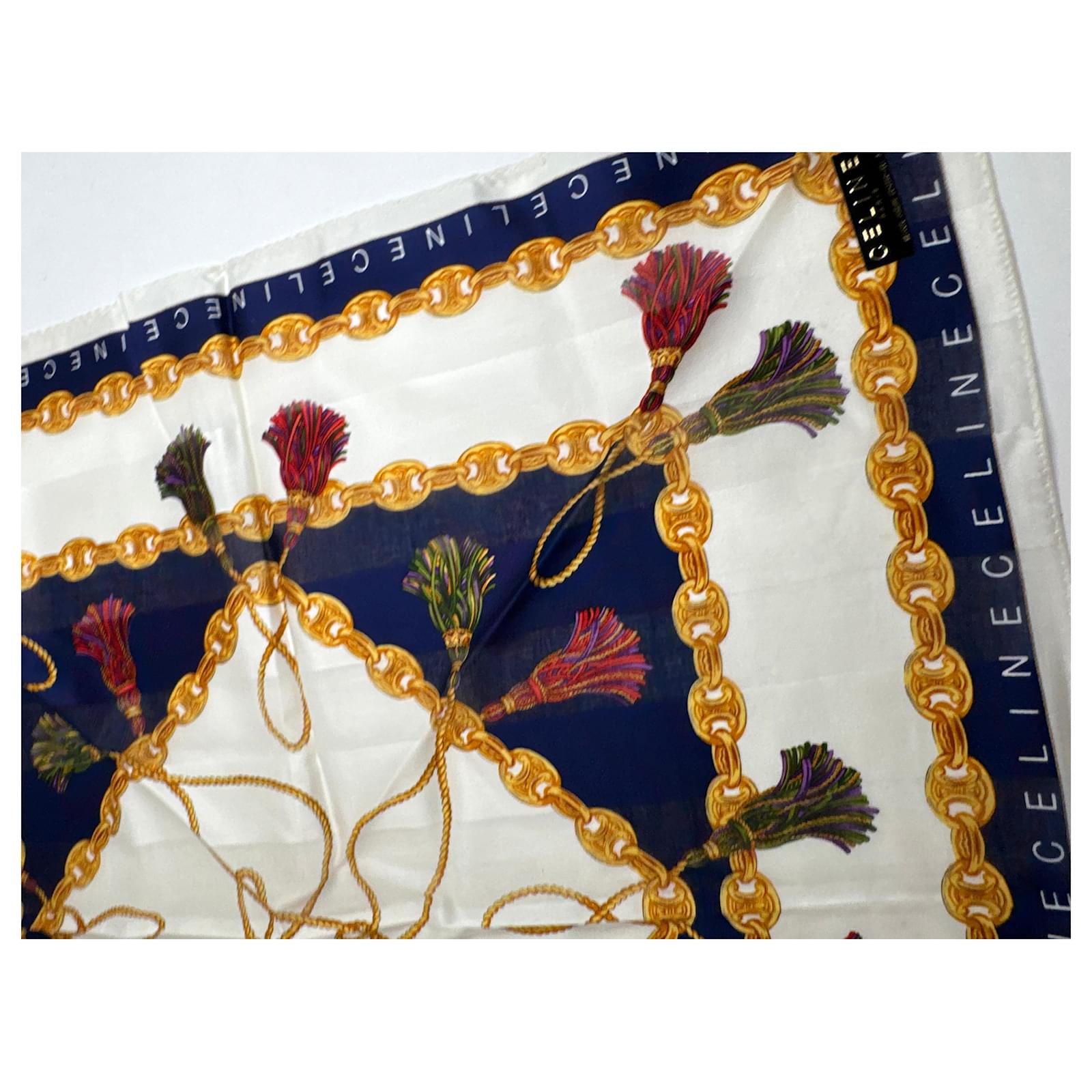 CELINE PARIS Vintage Chain Print Scarf.\nThis luxurious vintage scarf by Céline Paris features a white base richly\ndecorated with signature gold Céline chains, branded lettering, and deep\nnavy-blue design elements. A sophisticated accessory crafted from a likely blend\nof wool and silk, offering both structure and softness.\nBrand: CELINE PARIS\nCondition: Very Good\nCondition Details: The fabric is in very good condition. Please note: the care\nlabel is missing.\nMain Colour: White\nPattern Colours: Gold, Navy Blue\nMaterial: Wool and Silk (care label missing)\nWidth: 49 cm\nHeight: 49 cm\nGender: Unisex