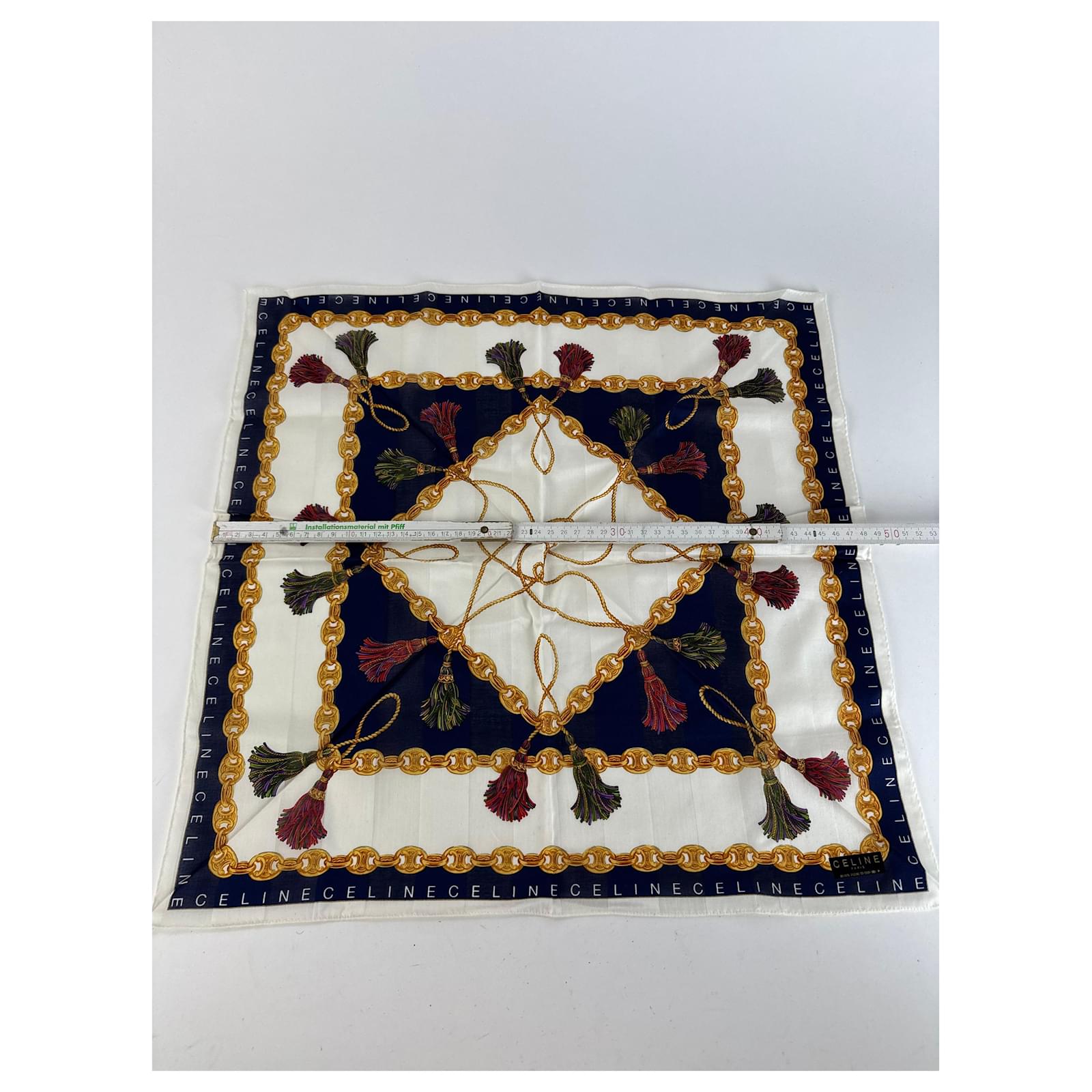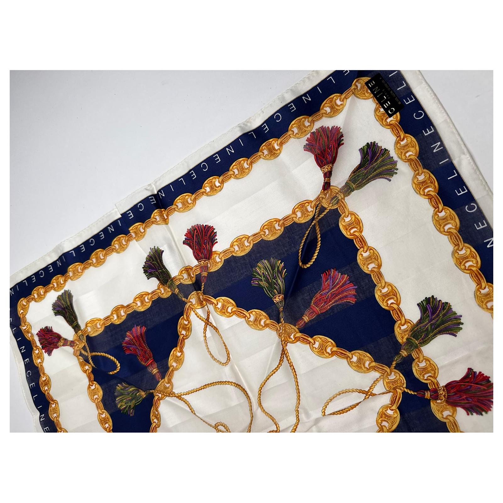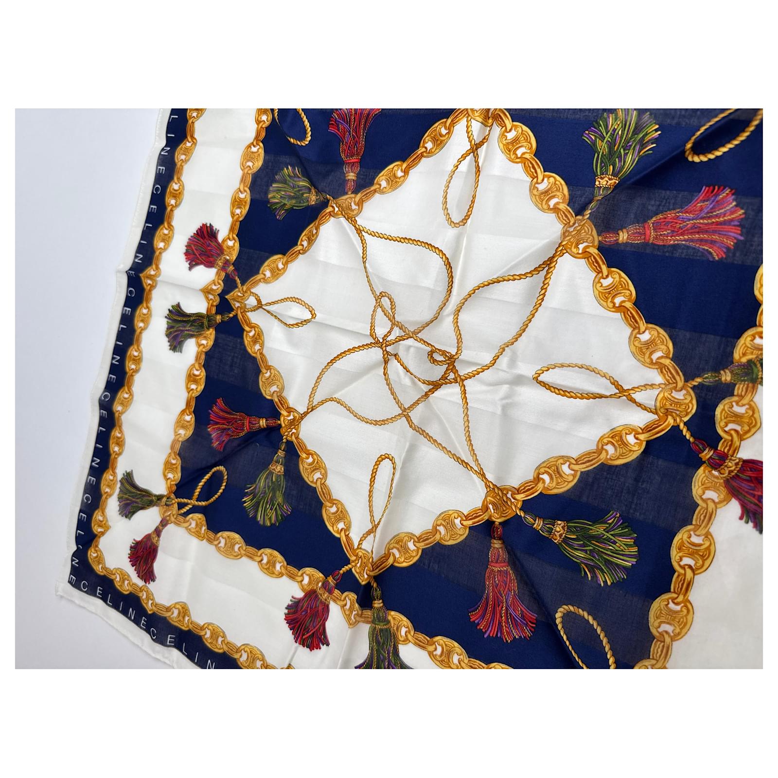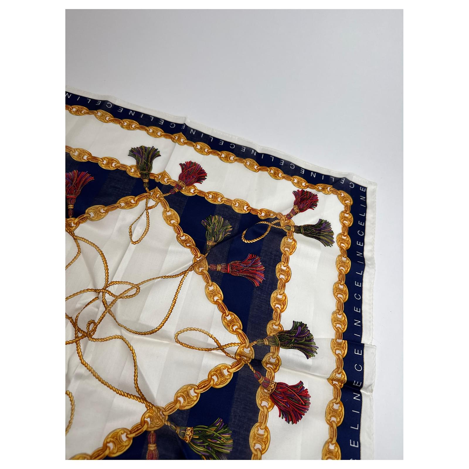 CELINE PARIS Vintage Chain Print Scarf.\nThis luxurious vintage scarf by Céline Paris features a white base richly\ndecorated with signature gold Céline chains, branded lettering, and deep\nnavy-blue design elements. A sophisticated accessory crafted from a likely blend\nof wool and silk, offering both structure and softness.\nBrand: CELINE PARIS\nCondition: Very Good\nCondition Details: The fabric is in very good condition. Please note: the care\nlabel is missing.\nMain Colour: White\nPattern Colours: Gold, Navy Blue\nMaterial: Wool and Silk (care label missing)\nWidth: 49 cm\nHeight: 49 cm\nGender: Unisex