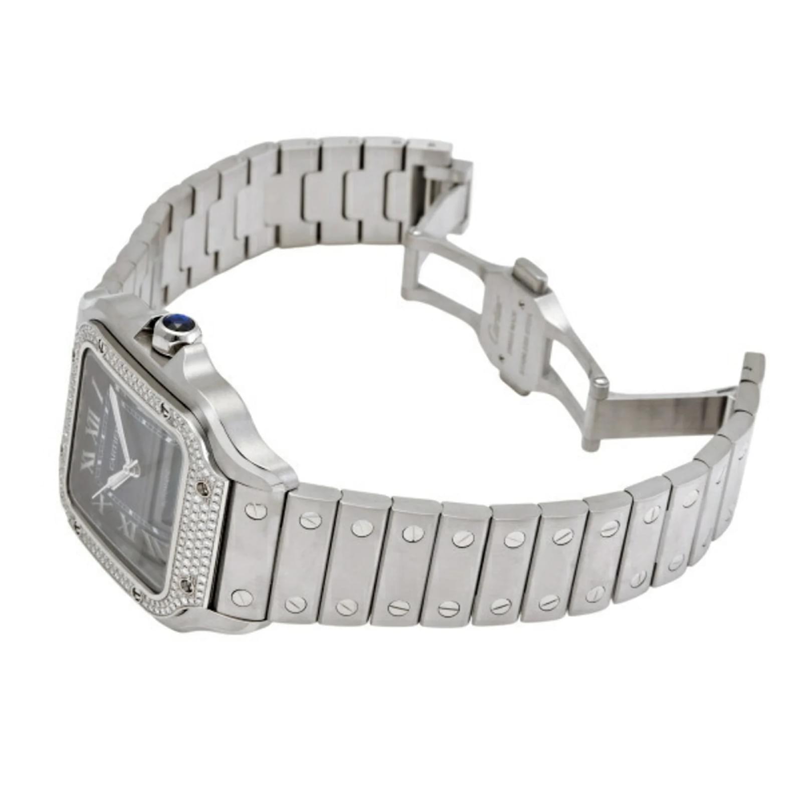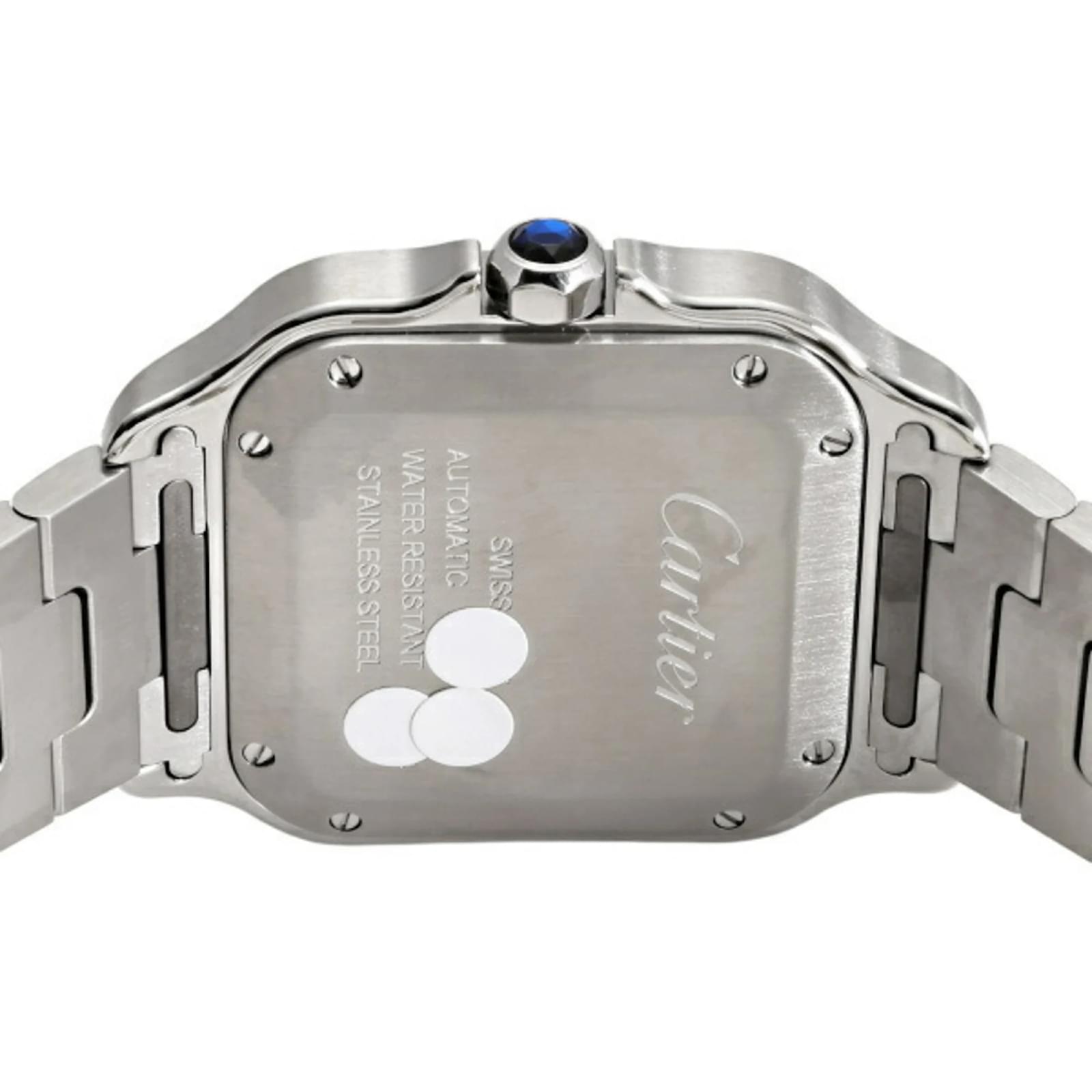 The Cartier Santos Do Watch MM W4SA0006 features a blue dial and is designed for men. It is constructed with a stainless steel case and band, ensuring durability. The watch operates on a self-winding automatic movement and is suitable for a wrist size of 18cm (7.08 inches) with a case diameter of 35.1mm (1.38 inches). \n\nThis pre-owned timepiece is in very good condition, with insignificant scratches on the bezel, case, and crown, while the dial and glass remain free of any scratches. The watch comes with its original inner and outer boxes, an international warranty, and a manual. Potential buyers are encouraged to review the provided images for a detailed view of the item’s condition and included accessories.